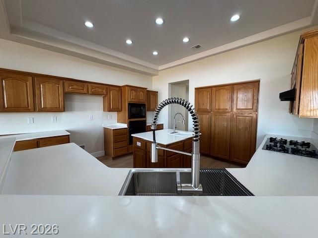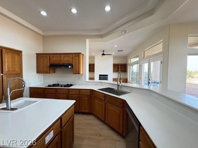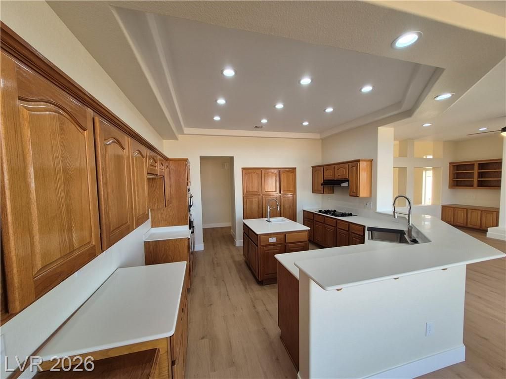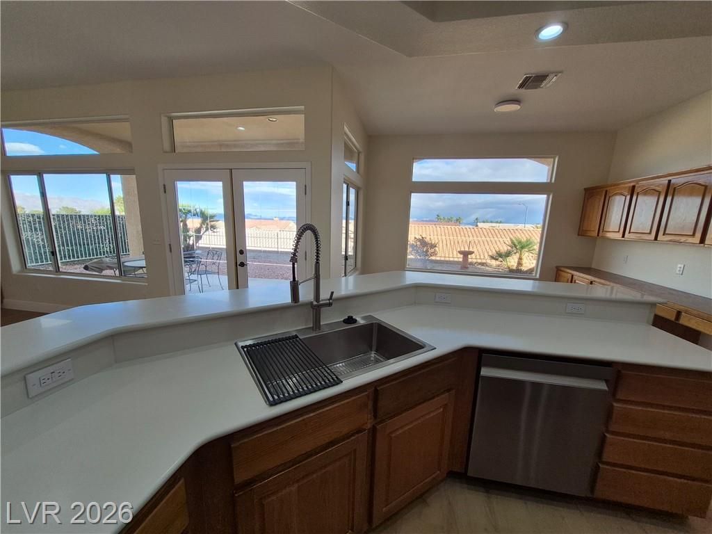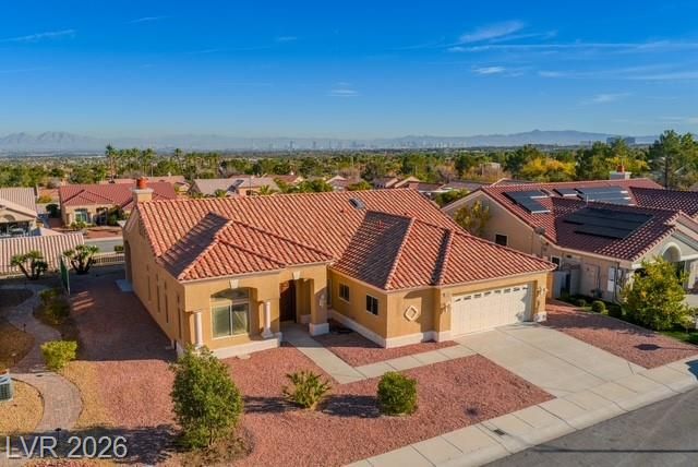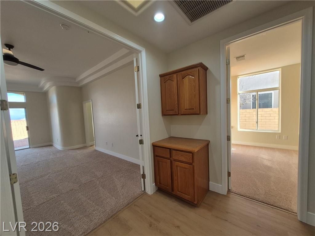 PRICE IMPROVEMENT! in Sun City SUMMERLIN! Elevated lot with City & Mountain views. Large open floor plan with high ceilings, a formal living and dining room and a large kitchen open to the family room and breakfast nook. New 2 tone neutral paint, New Luxury Vinyl Plank (LVP) flooring thru out topped with 5" new baseboards and new upgraded carpet in the bedrooms. Large kitchen with 2nd sink on the prep island, solid surface counter tops and tons of cabinets for storage. Family room has a cozy fireplace, built-in cabinets and shelves with French doors out to a nice covered patio. Large 22x14 Primary Bedroom with double door entry, primary bath features a garden tub and separate shower with a large 12x9 walk-in closet. 2 nice size bedrooms plus additional den/office/craft room. Garage has fresh Epoxy floor with room for Golf Cart. Sun City has 3 golf courses, community centers, a social calendar, pools, outdoor activities. Near restaurants, shopping, Downtown Summerlin, Red Rock and more!