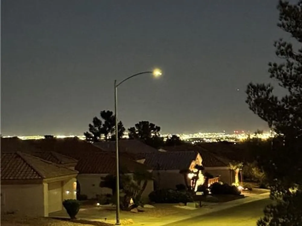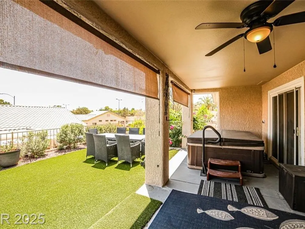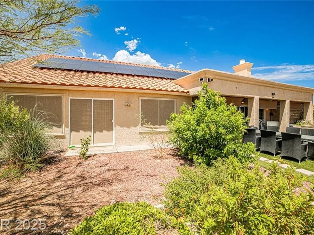 Beautiful updated home in a 55+golf course community, offering partial city and mountain views. this well maintained home features paid off solar panels and a portable hot tub , both installed in Dec 2024. the home was remodeled in 2021 with modern finishes throughout, including high ceiling, sliding patio doors, and a custom built fireplace. the contemporary kitchen with high gloss European style cabinets and quartz countertops. a murphy bed adds functionality to the guest bedroom, while the spacious backyard is filled with lush, mature landscaping. perfect for relaxing and entertaining... two car garage with golf cart place. 3D virtual tour available.