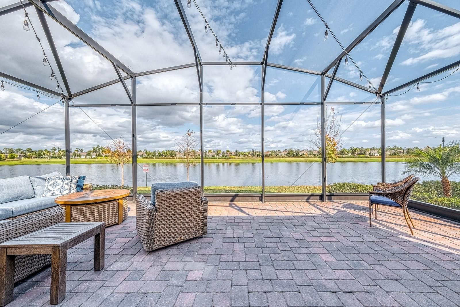 Experience elevated 55+ resort-style living in this Contour Model (no longer being built with pond view), ideally situated on a premium center lot with serene water views and just one block from the clubhouse in the highly sought-after Del Webb Sunbridge community. Designed for effortless comfort and entertaining, this beautiful 2-bedroom, 2-bath residence features a bright open-concept layout with ceramic tile throughout, crown molding, designer pendant lighting, ceiling fans, and a gourmet kitchen complete with built-in stainless steel appliances, quartz countertops, expansive island, wood cabinetry, and a natural gas cooktop. An enclosed flex space provides the perfect setup for a home office, studio, or hobby retreat. Outdoor living truly shines with a 30-foot extended patio, oversized screened enclosure, café-style string lighting, and convenient gas hookup—creating the ideal backdrop for sunrise morning coffee, evening cocktails, and peaceful pond views. Additional upgrades include a whole-house water softener, in-wall pest system, rain gutters, premium Polyaspartic Polyurea sealed garage flooring with a remaining 12-year warranty, plus extended termite coverage with monitoring deliver peace of mind. The builder offers a limited 10-year structural warranty, with 7 years remaining. Enjoy low-maintenance living with landscaping, irrigation, and high-speed fiber internet included, along with access to Del Webb’s award-winning amenities featuring a resort-style pool, state-of-the-art fitness center, pickleball and tennis courts, art studios, on-site tavern, vibrant clubhouse events, and scenic walking trails. Perfectly located minutes from Lake Nona’s dining and medical corridor, Orlando International Airport, and world-class theme parks, this exceptional home blends lifestyle, luxury, and location. Schedule your private showing today and begin living your best life at Sunbridge!
