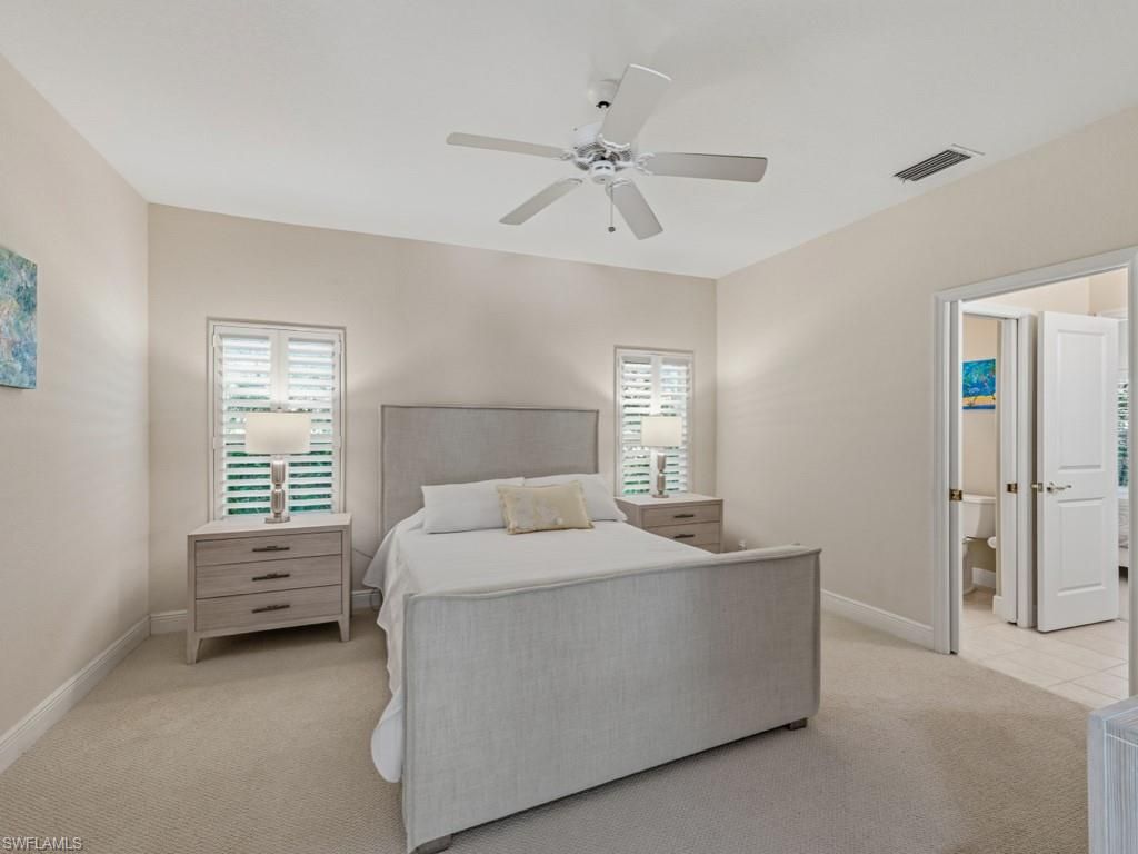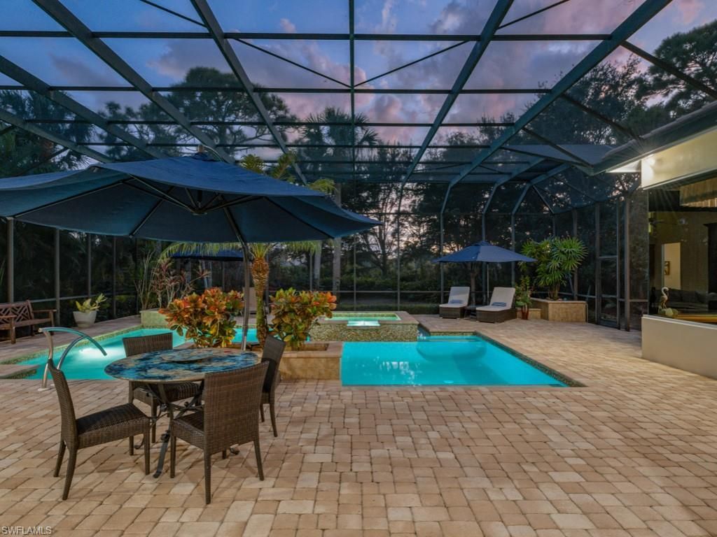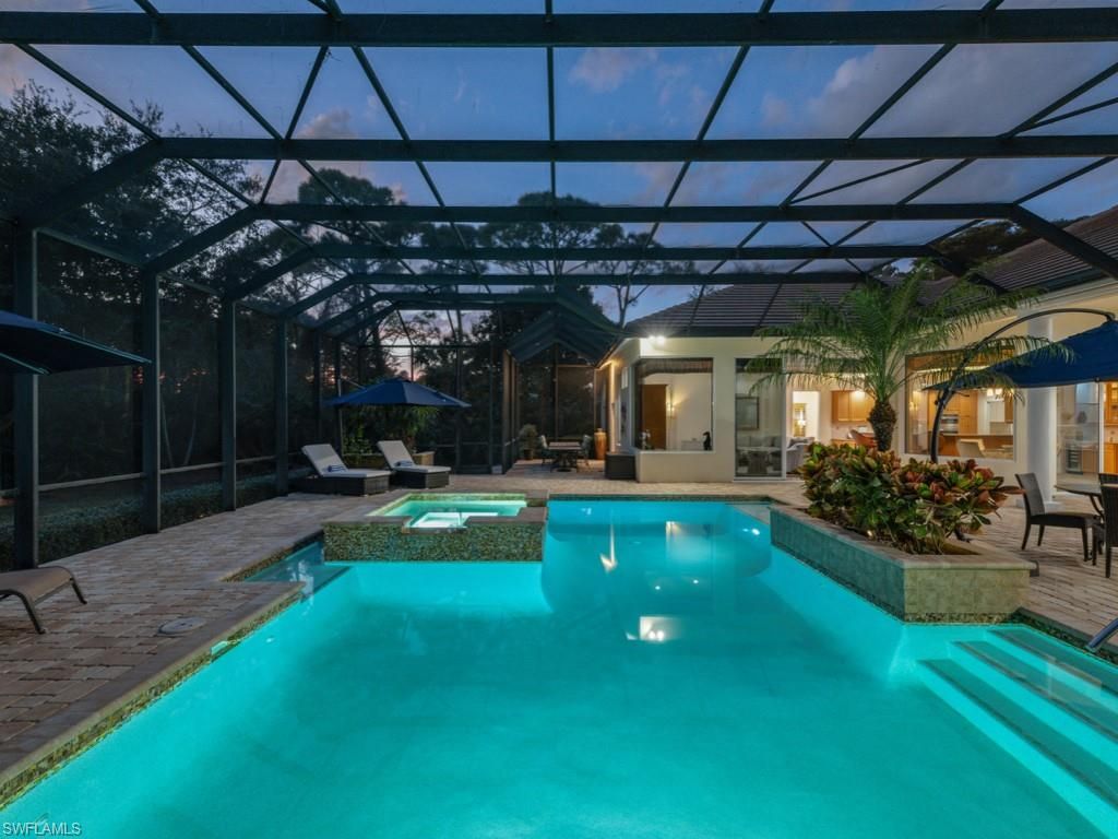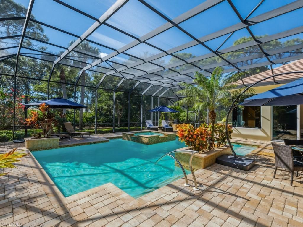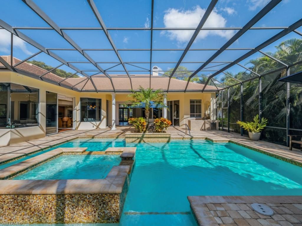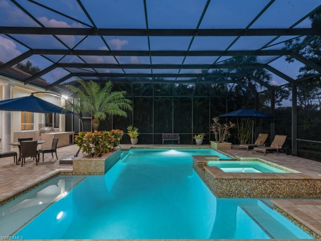 In the Ridge section of Pelican Landing, where homes are rarely available, this impeccably maintained estate home offers refined Florida living with southern rear exposure and peaceful private views. The light-filled, open floor plan features volume ceilings and seamless indoor–outdoor living that opens to an expansive screened lanai—perfect for entertaining. Outdoor living is second to none, with a private pool and spa, a full outdoor kitchen, and lush, mature landscaping that provides abundant privacy. The pool area offers tranquil views and ample space for sun and shade. Inside, the living room showcases coffered ceilings, a fireplace, and pocketing sliding glass doors for the ultimate Southwest Florida lifestyle. The kitchen includes stainless steel appliances, a water filtration system, dry bar with a wine cooler and a generous panty for storage. The spacious primary suite is a true retreat with volumn ceilings, private lanai access, dual vanities, a jetted soaking tub, a walk-in shower, and a custom walk-in closet. A flexible den/home office easily functions as an additional guest room. This residence features newer A/C systems, a 2019 roof, updated LED lighting (2025), and an oversized 3-car garage. Pelican Landing offers an impressive amenities array: a top-tier tennis program, private beach park accessible by water taxi, Spring Creek kayaking and canoeing, a vibrant community center, a state-of-the-art fitness center, sailing, bocce, pickleball courts, and miles of scenic walking and biking trails. Golf enthusiasts can explore membership opportunities at The Nest Golf Club. Convenient access to Naples, Southwest Florida International Airport, Coconut Point, Miromar Outlets, and Gulf beaches completes the lifestyle. Don't miss this impressive estate home in one of Pelican Landing’s most desirable enclaves for an exceptional Florida lifestyle.