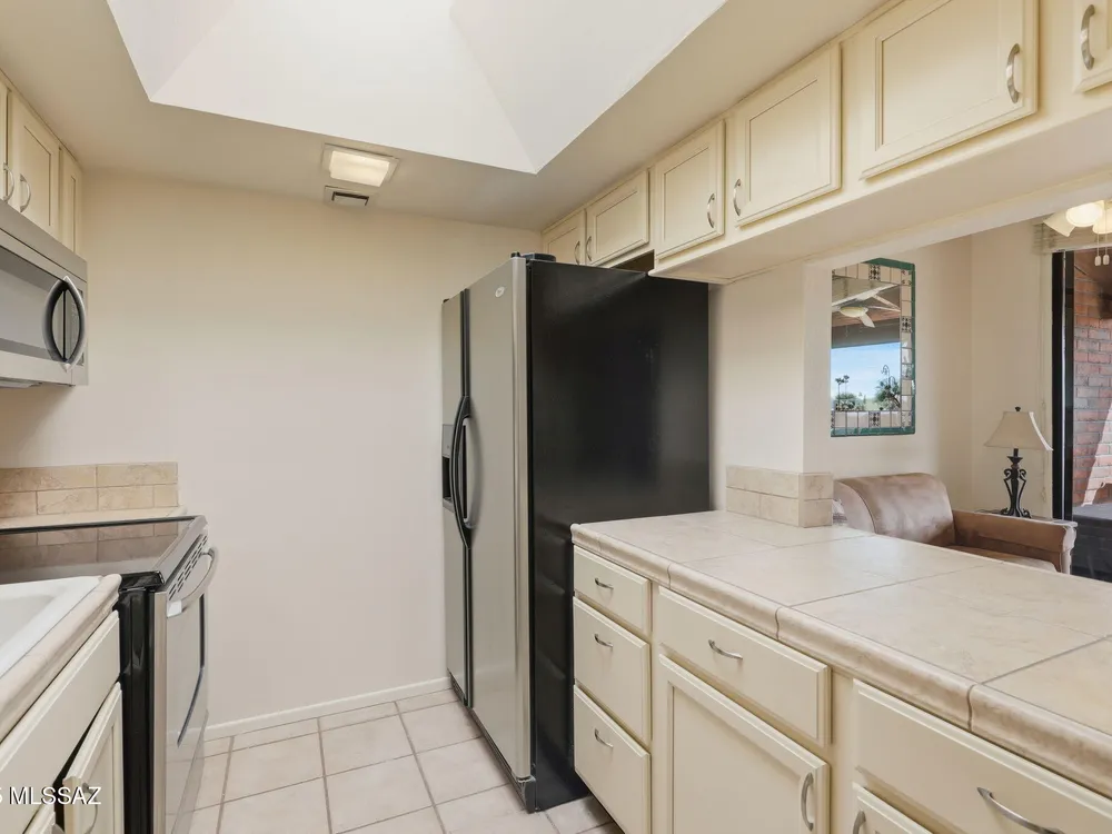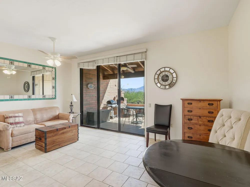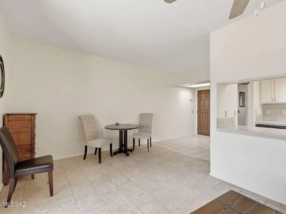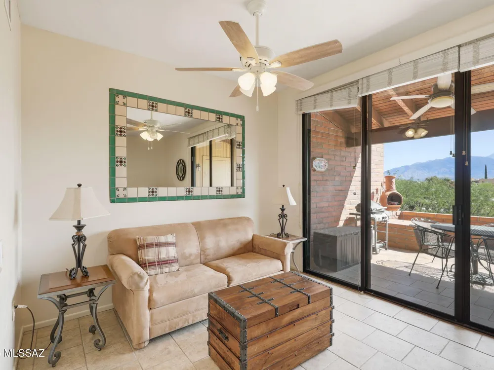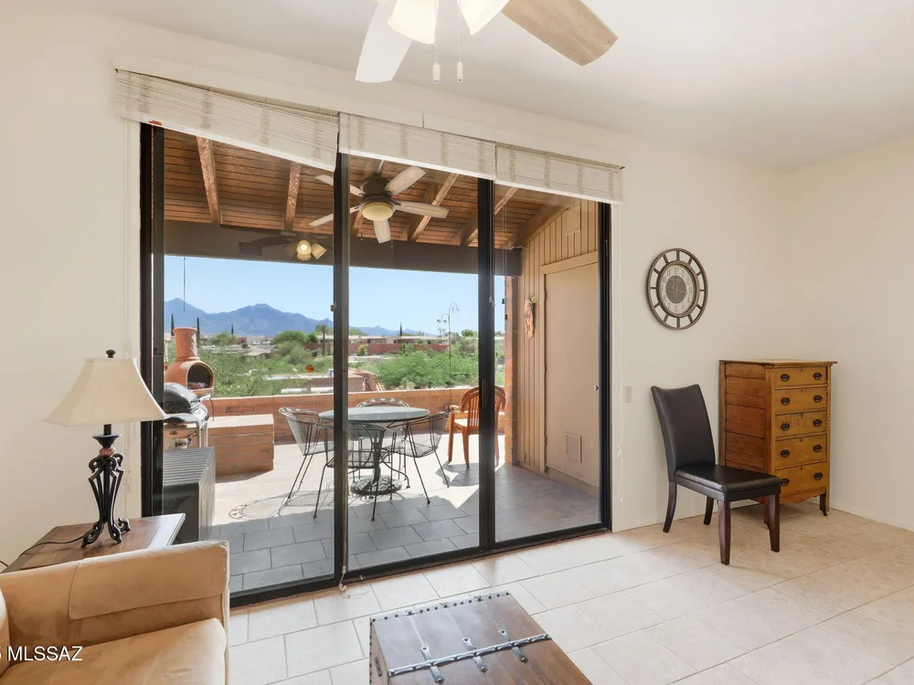 Enjoy serene, sweeping views of the Santa Rita Mountains from the comfort of your townhouse whether indoors or out on your private back patio. This inviting home is move-in ready, featuring fresh paint, stainless steel appliances, ceramic tile flooring, upgraded kitchen cabinetry, and a stylish bathroom vanity. The covered patio, complete with tile flooring, a ceiling fan, and enclosed by slump block, offers the perfect retreat for quiet relaxation or hosting friends. Designed with comfort and ease of living in mind, this home blends low-maintenance features with timeless style ideal for those seeking a peaceful lifestyle in a welcoming 55+ community.