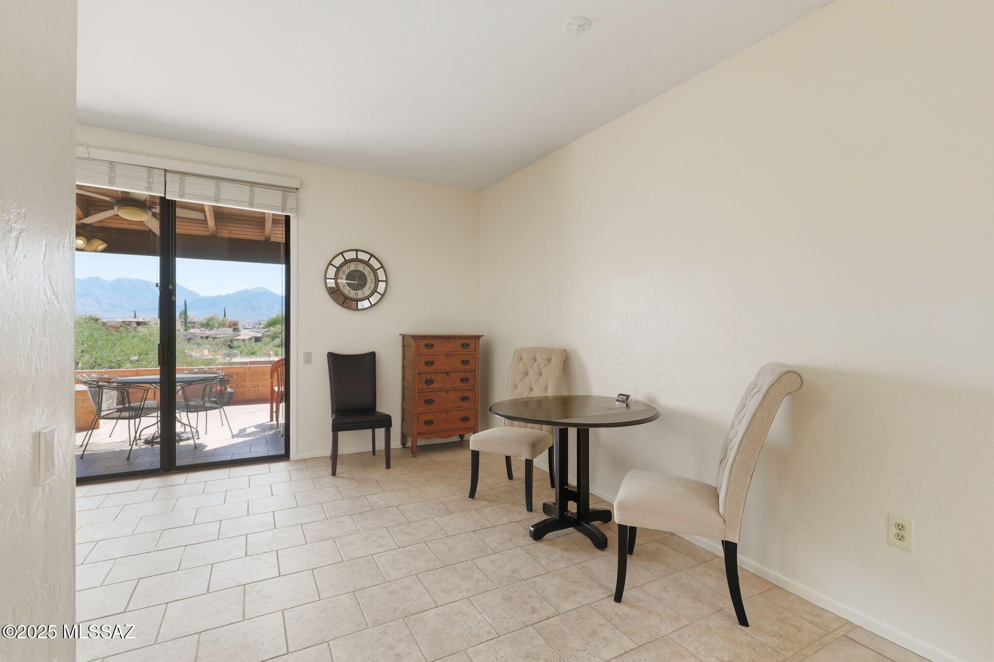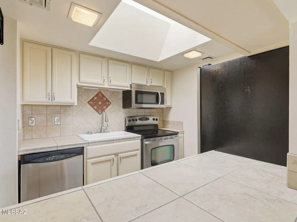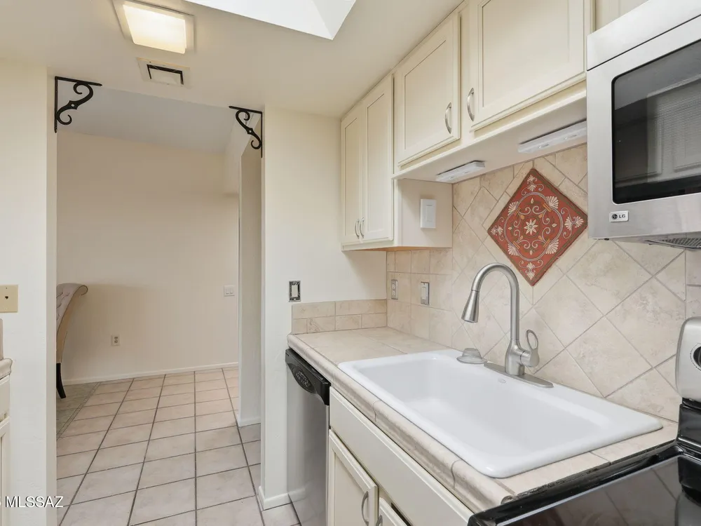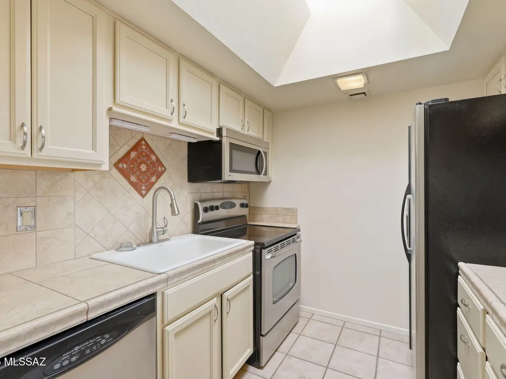Enjoy serene, sweeping views of the Santa Rita Mountains from the comfort of your townhouse whether indoors or out on your private back patio. This inviting home is move-in ready, featuring fresh paint, stainless steel appliances, ceramic tile flooring, upgraded kitchen cabinetry, and a stylish bathroom vanity. The covered patio, complete with tile flooring, a ceiling fan, and enclosed by slump block, offers the perfect retreat for quiet relaxation or hosting friends. Designed with comfort and ease of living in mind, this home blends low-maintenance features with timeless style ideal for those seeking a peaceful lifestyle in a welcoming 55+ community.