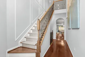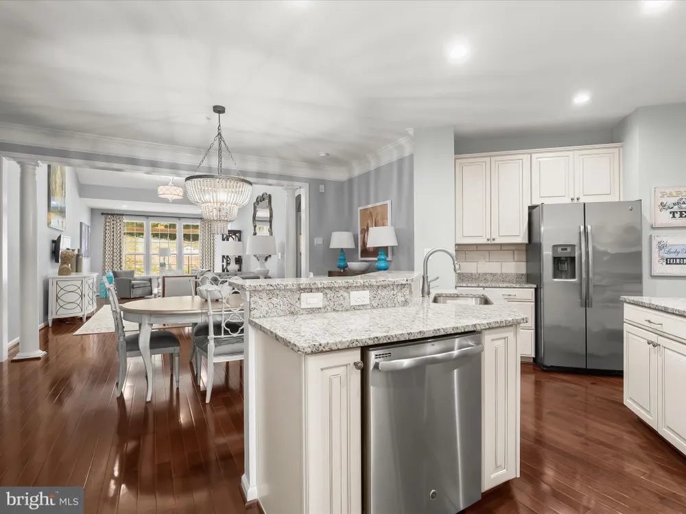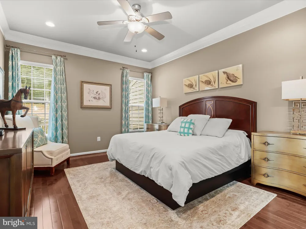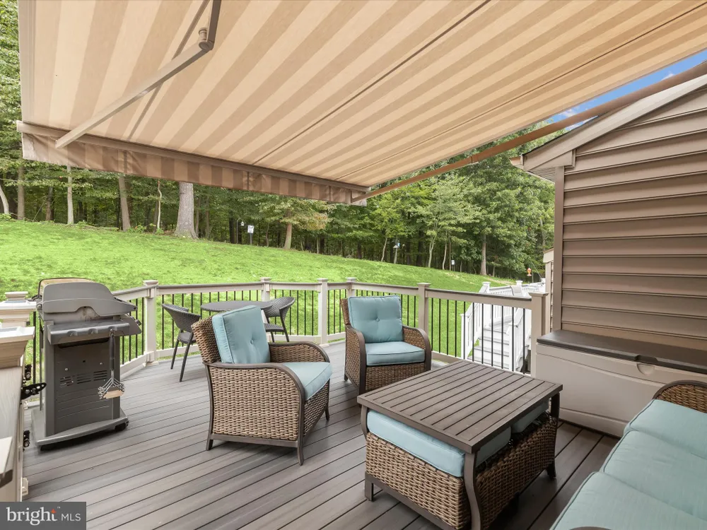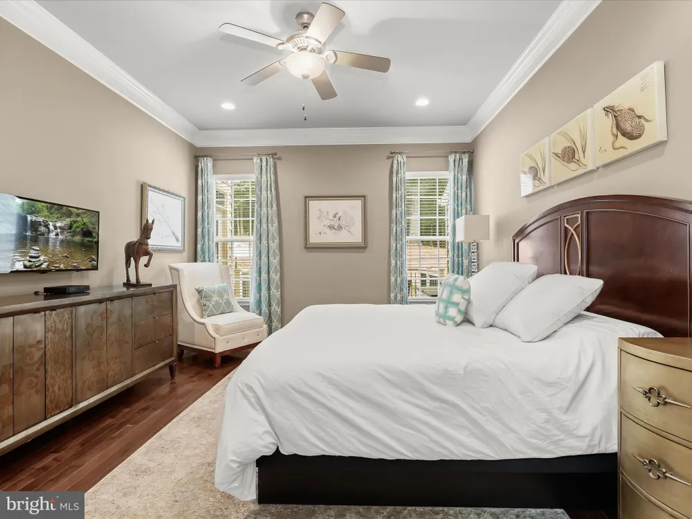 Welcome to Waverly Woods West, a premier 55+ active adult community where lifestyle, comfort, and convenience come together. This vibrant neighborhood features a spacious clubhouse with gathering areas, a fitness center, and an outdoor pool, all set against a backdrop of beautifully maintained walking trails that weave throughout the community. Situated in the newest and final set of villas built here, this elegant three-level residence offers sophistication and thoughtful upgrades throughout, and it is among the rare few backing to serene forest conservation. Meticulously maintained by its original owners, the home greets you with upgraded hardwood flooring, designer lighting, upgraded security system and refined crown molding. A graceful staircase showcases iron balusters, custom picture frame molding, and a wool runner, setting the tone for the quality within. The open-concept main level begins with a kitchen designed for both beauty and function, featuring off-white glazed cabinetry for warmth and dimension with pull-out shelving, granite counters, and two islands, one for prep and the other with a breakfast bar. Stainless steel appliances include a gas cooktop and double wall ovens, complemented by a new Italian tile backsplash installed in 2024 and a convenient pantry. Adjacent, the dining area glows beneath an upgraded tiered wood bead chandelier, flowing seamlessly into the living room with its soaring two-story vaulted ceiling. Here, two oversized drum pendant lights suspend elegantly from above, drawing the eye upward while adding warmth and contemporary style to the room. A dramatic wall of windows fills the space with natural light, and a glass door opens to the custom composite deck. The main-level primary suite offers a tranquil retreat with hardwoods added in 2024, crown molding, and a ceiling fan. The en-suite bath boasts a granite-topped double vanity, tiled shower, and a walk-in closet with custom built-ins and display cabinetry. Off the kitchen, the laundry room offers garage access and is conveniently located near a main-level half bath for guests. Upstairs, a generous loft overlooks the living area, joined by two spacious bedrooms, each with a walk-in closet and recessed lighting. A full bath with double sinks and a separate water room with the shower serves this level, along with a versatile bonus room ideal for storage or a study. The lower level is crafted for entertaining, with a custom wet bar featuring quartz counters, concealed storage for coffee or beverage stations, stainless shelving, a black granite bar sink, and two U-Line refrigerators for wine and beverages. Adjacent, a media room with surround sound further enhances the space and makes a perfect venue for at-home movie nights. This level also includes a half bath and a large storage room. Outdoor living shines with a low-maintenance composite deck framed by vinyl railings and a nearly full-length motorized awning, plus a stone patio, both with peaceful tree views. Additionally, finished two-car garage is equipped with dual Tesla chargers, while professionally tinted windows and six conveying TVs inside enhance both comfort and value. This home pairs exceptional craftsmanship with a premier setting, offering a rare opportunity to enjoy the very best of Waverly Woods West. Almost all home furnishings and accessories are available for sale - inquire thru the listing agent!