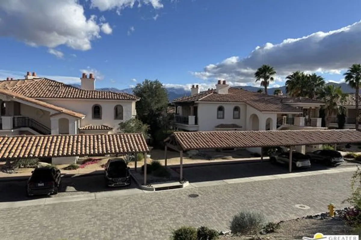 **OWNED SOLAR** This light and bright 2 Bedroom 2 Bath unfurnished home is located on the second floor of the building which features a large elevator from the main entry to the building. This unit also includes a parking pad for 2 cars as well as a tandem garage for 2 cars accessed from the interior of this building, as well. Built in 2015, this 1278 sf home features owned solar for reduced electricity bills, stainless steel front load washer and dryer, tankless water heater, solar shades on the balcony, stainless steel appliances and granite counters and lovely southern views of the Santa Rosa Mountains. Upon entering this spacious unit, there is the entry foyer with access to the hall/guest bathroom with vanity, WC and stall shower and also offers access to the second bedroom with sliders to the covered balcony. Beyond the foyer is the incredibly spacious Great Room that runs the complete length of the home from the sliders from the covered balcony to the Living Room, Dining Area and well-laid out Chef's Kitchen. Beyond the Great Room is the Primary Bedroom Suite with a large Primary Suite Bath en-suite with a private WC, Dual Vanity Sink, Stall Shower and access to the spacious walk-in closet - with a "secret passage" to the Laundry area and access to the Chef's Kitchen. All in all, this home offers the convenience of one-floor living because of the building's huge elevator and offers incredible views from the covered balcony. Enjoy Villa Portofino's 30,000 square foot clubhouse with concierge, Bistro, movie theater, gym, card room, fine dining, conference room, library and complimentary aquatic and yoga classes. Welcome to your New Home!