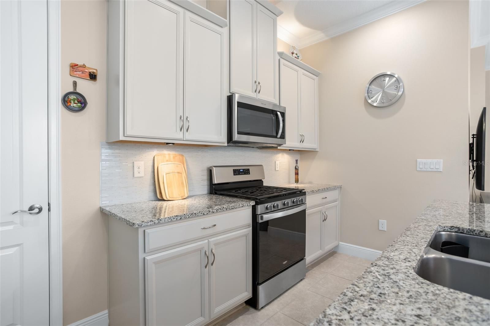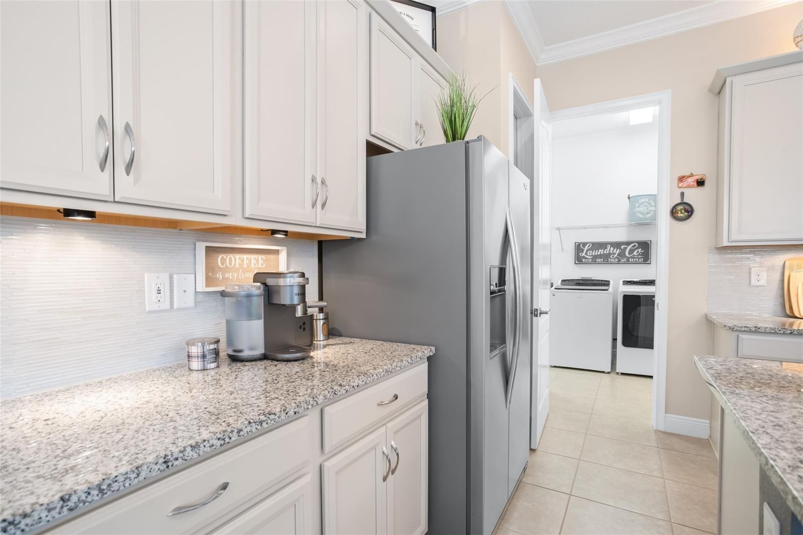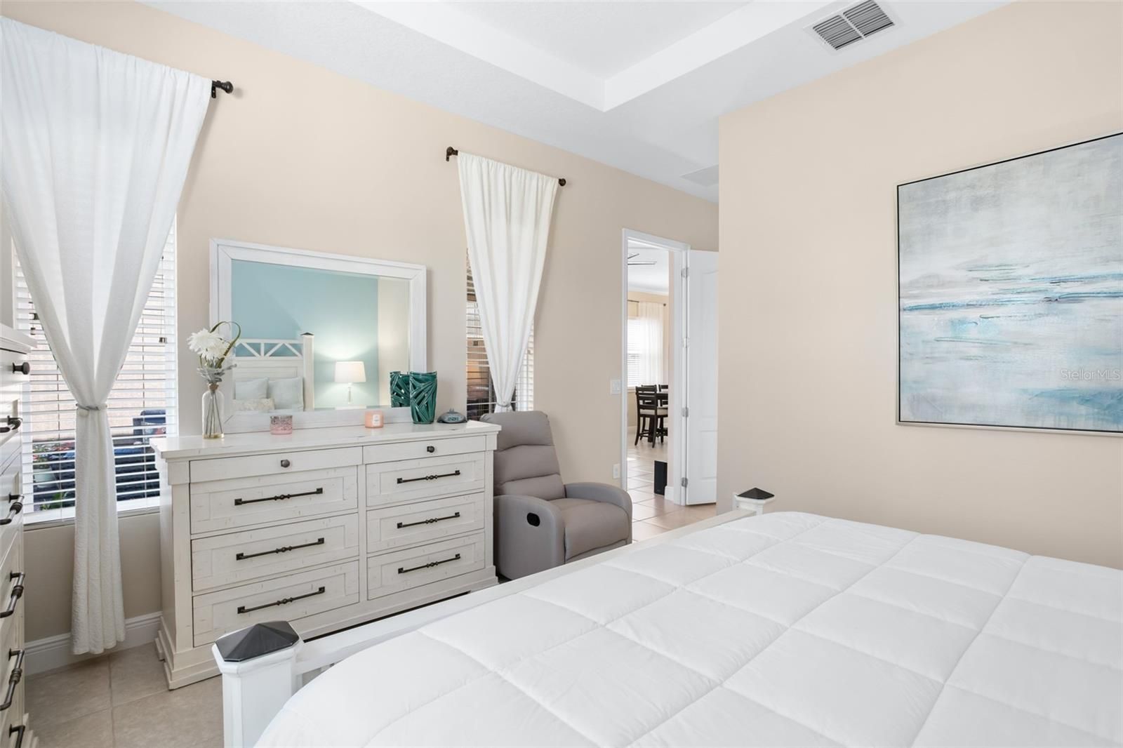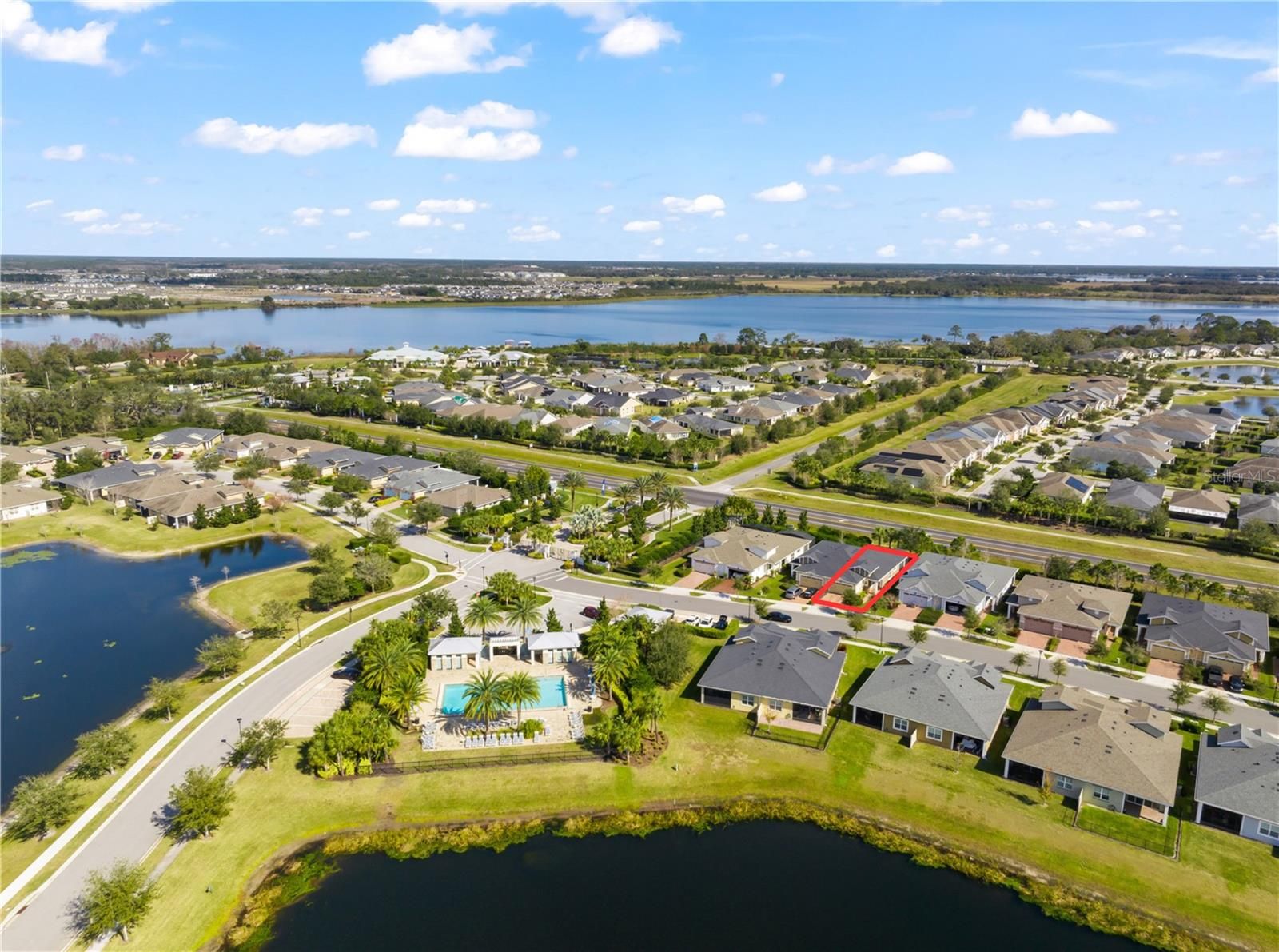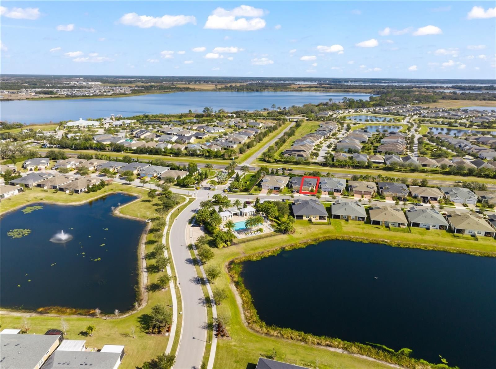 SHOWS LIKE A MODEL! Expect to be impressed with this beautifully appointed home in Twin Lakes, a Dell Webb active 55+ community. Layout boasts open common living space in the heart of the home and a split bedroom plan. Gorgeous contemporary kitchen features granite counters, island with breakfast bar, abundant raised panel cabinetry w/crown molding, under/over cabinet lighting, attractive tile backsplash, recessed and pendant lighting, and stainless Whirlpool appliances. You’ll find that the adjacent dining space is large enough to seat a crowd. And the living room, bathed in light by the clerestory window and French door sliders, makes a great gathering space. The primary suite is in the back. Your generous sized bedroom has a stylish tray ceiling and overlooks the greenery outside. The ensuite bath here features a dual sink, granite topped vanity and shower, and access to your sizable walk-in closet. Secondary bedroom and bath are tucked away in the front of the home. Your laundry room is off the kitchen, and you’ll LOVE having counter workspace and beautiful cabinetry for storage here, as well as the handy work sink. Outside, you’ll experience the WOW factor when you see that the covered paver patio has a fully screened extension – giving you ample space to enjoy fun in the sun (or shade). Other notable features here include an outlet for a wall mounted TV, ceiling fan, roll shades, and privacy hedging. Twin Lakes is a secure gated community with two amenity areas for you to take full advantage of. First, you can walk across the street to take a dip in the lakeside neighborhood pool. When you’re in the mood for more activities, there’s a waterfront amenity center 2 minutes away, where you will enjoy a clubhouse with a state-of-the-art fitness center, rooms for social activities and club gatherings, two pools (1 resort style w/hot tub, 1 lane/lap pool), and a fabulous outdoor grill area and patio bar. There are also sports courts (bball, tennis, pickleball, bocce) to keep you active and fit. Take a walk on the pier and enjoy the views of Live Oak lake or consider fishing, canoeing or kayaking. Excellent overall location – the community is about 5 minutes from your Publix & SR 192, providing easy access to essential shopping and dining venues, and 10 minutes from the Florida turnpike. This home simply SHINES, both inside and out. Come see all that it has to offer – you’ll love living here!
