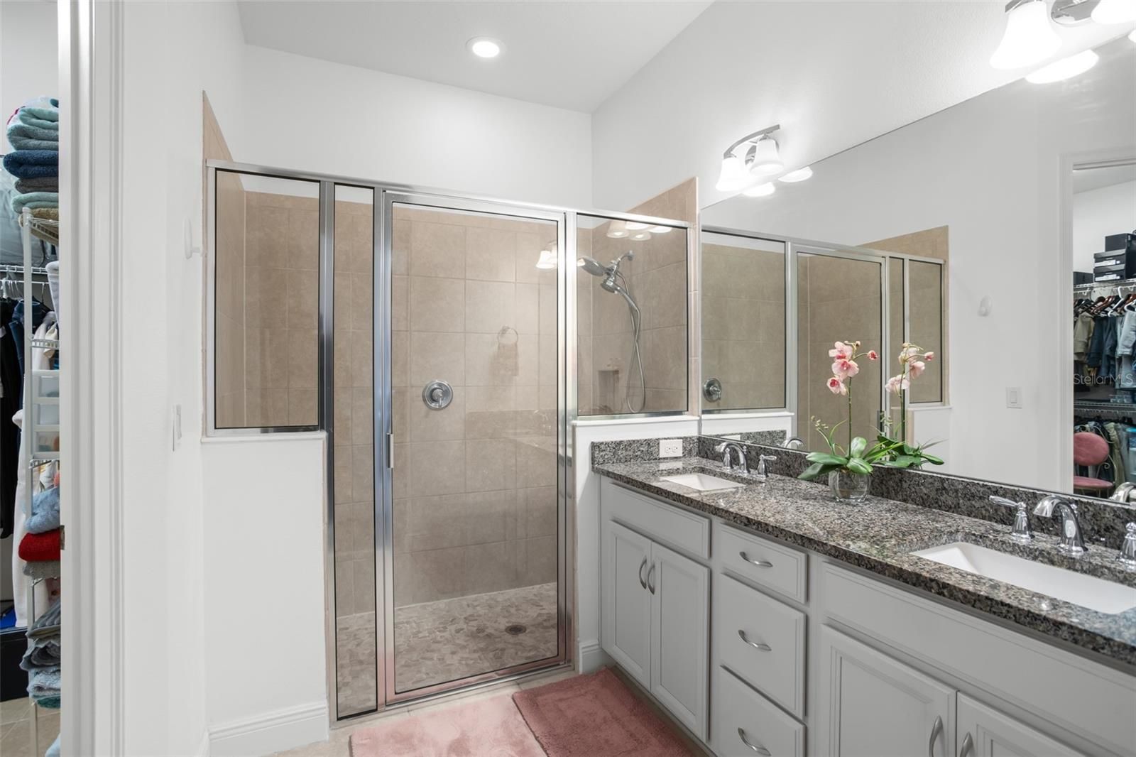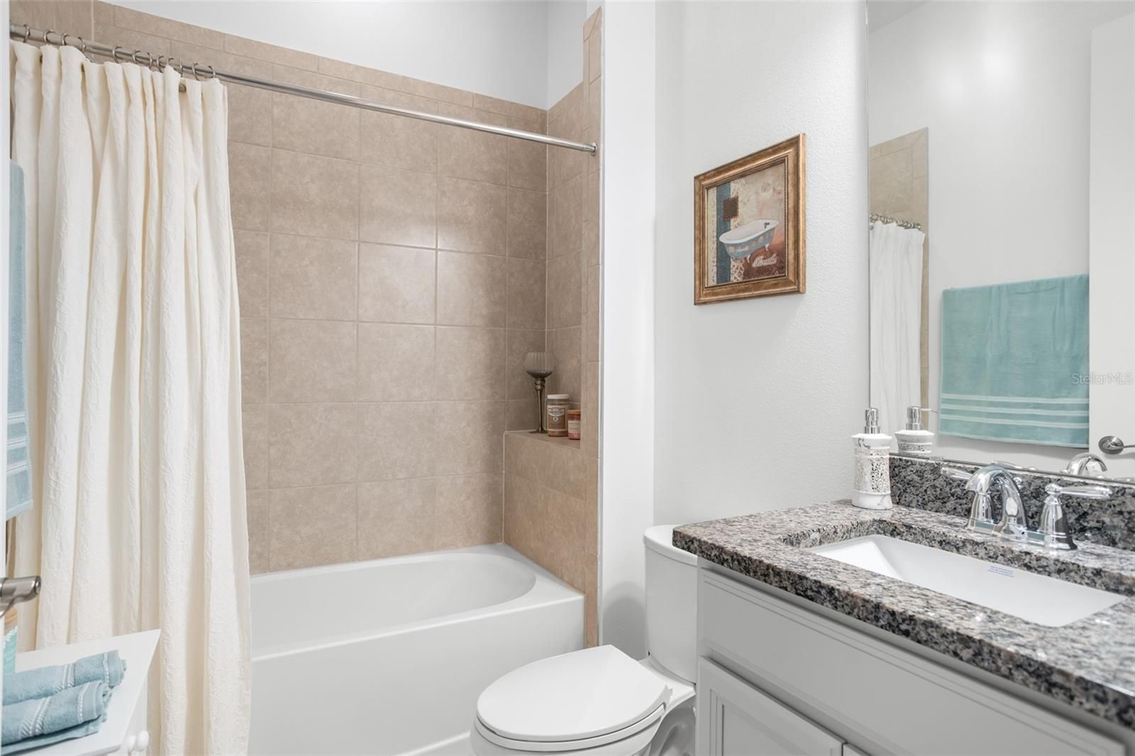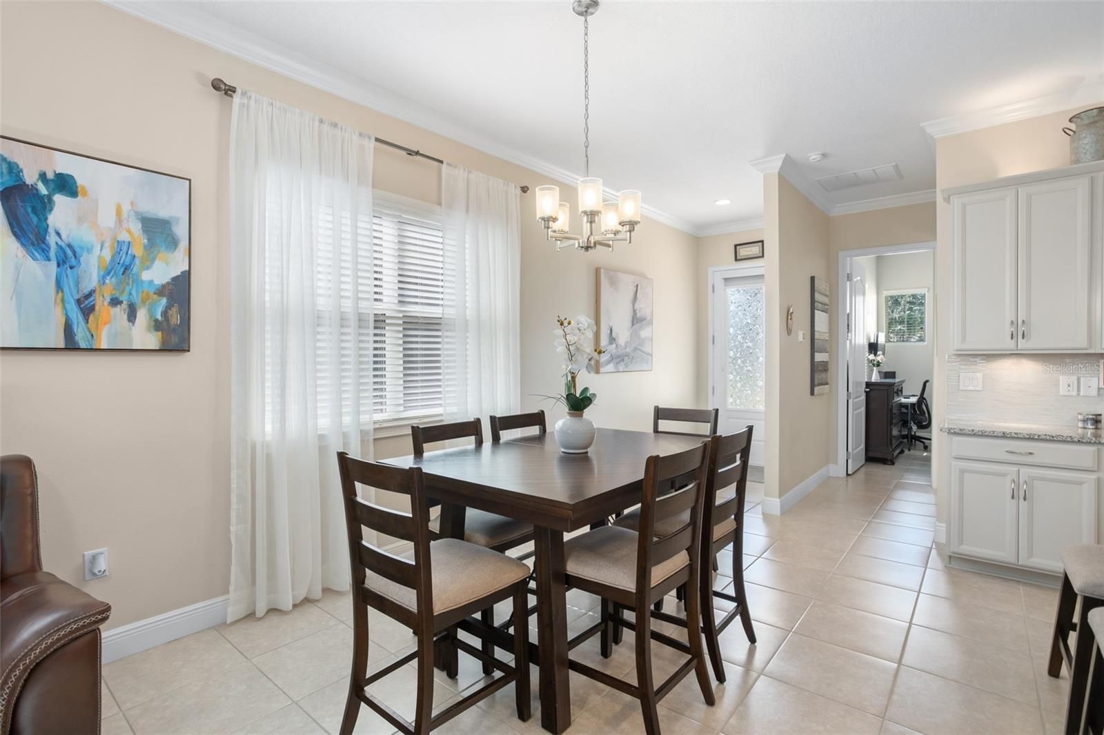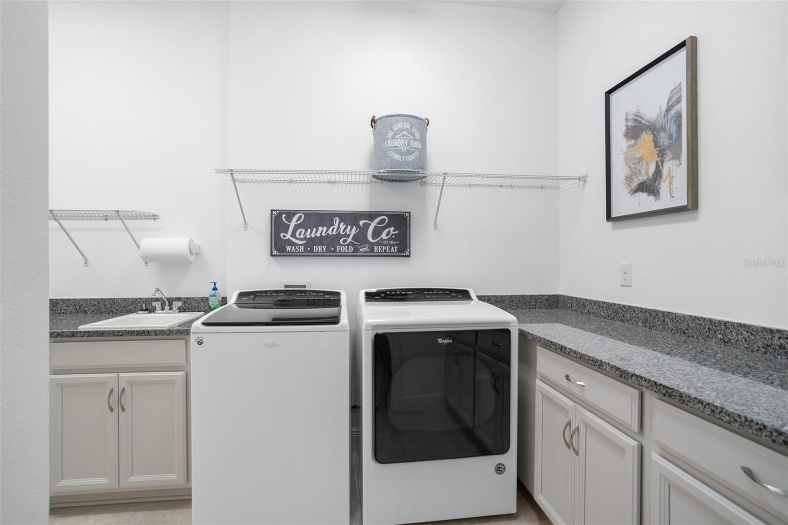 SHOWS LIKE A MODEL! Expect to be impressed with this beautifully appointed home in Twin Lakes, a Dell Webb active 55+ community. Layout boasts open common living space in the heart of the home and a split bedroom plan. Gorgeous contemporary kitchen features granite counters, island with breakfast bar, abundant raised panel cabinetry w/crown molding, under/over cabinet lighting, attractive tile backsplash, recessed and pendant lighting, and stainless Whirlpool appliances. You’ll find that the adjacent dining space is large enough to seat a crowd. And the living room, bathed in light by the clerestory window and French door sliders, makes a great gathering space. The primary suite is in the back. Your generous sized bedroom has a stylish tray ceiling and overlooks the greenery outside. The ensuite bath here features a dual sink, granite topped vanity and shower, and access to your sizable walk-in closet. Secondary bedroom and bath are tucked away in the front of the home. Your laundry room is off the kitchen, and you’ll LOVE having counter workspace and beautiful cabinetry for storage here, as well as the handy work sink. Outside, you’ll experience the WOW factor when you see that the covered paver patio has a fully screened extension – giving you ample space to enjoy fun in the sun (or shade). Other notable features here include an outlet for a wall mounted TV, ceiling fan, roll shades, and privacy hedging. Twin Lakes is a secure gated community with two amenity areas for you to take full advantage of. First, you can walk across the street to take a dip in the lakeside neighborhood pool. When you’re in the mood for more activities, there’s a waterfront amenity center 2 minutes away, where you will enjoy a clubhouse with a state-of-the-art fitness center, rooms for social activities and club gatherings, two pools (1 resort style w/hot tub, 1 lane/lap pool), and a fabulous outdoor grill area and patio bar. There are also sports courts (bball, tennis, pickleball, bocce) to keep you active and fit. Take a walk on the pier and enjoy the views of Live Oak lake or consider fishing, canoeing or kayaking. Excellent overall location – the community is about 5 minutes from your Publix & SR 192, providing easy access to essential shopping and dining venues, and 10 minutes from the Florida turnpike. This home simply SHINES, both inside and out. Come see all that it has to offer – you’ll love living here!