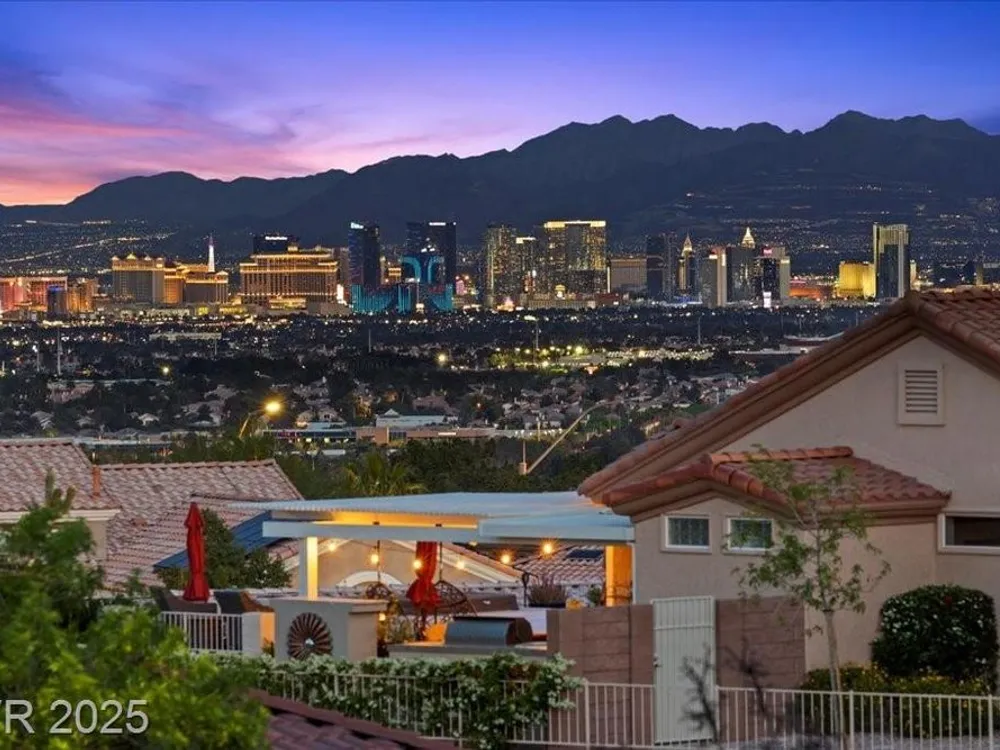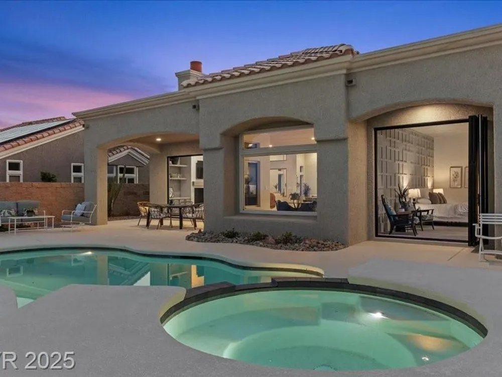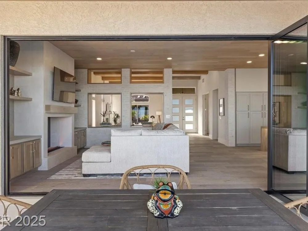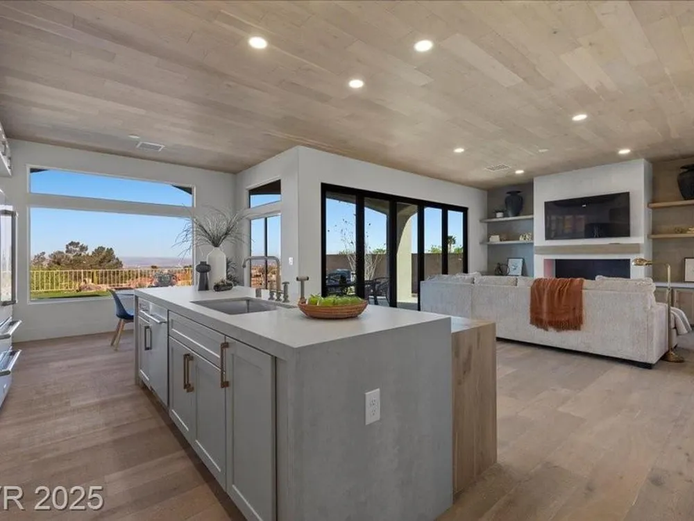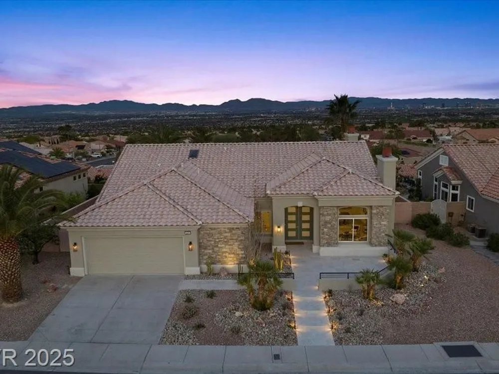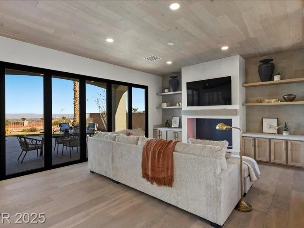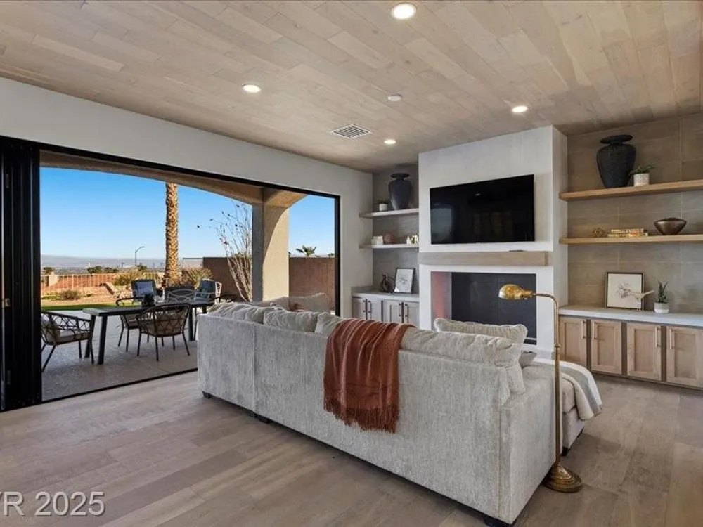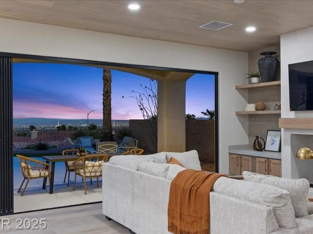 Premium design meets the ultimate 55+ lifestyle in this stunning Sun City Summerlin home. Enjoy iconic Strip views from the primary suite, kitchen, family room & backyard, while the front of the home captures breathtaking desert sunsets. Every detail has been thoughtfully curated, from the modern water-vapor fireplace & premium white oak engineered hardwood floors to custom wood-accent ceilings & designer walls that elevate the style throughout. At the heart of the home, the chef’s kitchen is a true showpiece with a spacious island, sleek quartz counters & open layout—perfect for entertaining or relaxing. A 15-ft panoramic sliding door of individual panels creates seamless indoor/outdoor living with twinkling city lights as your backdrop. Sun City Summerlin offers world-class amenities: 4 clubhouses, 3 golf courses, fitness center, pools, pickleball, social clubs & more. With shopping, dining & freeway access nearby, this home delivers the best of Las Vegas living.