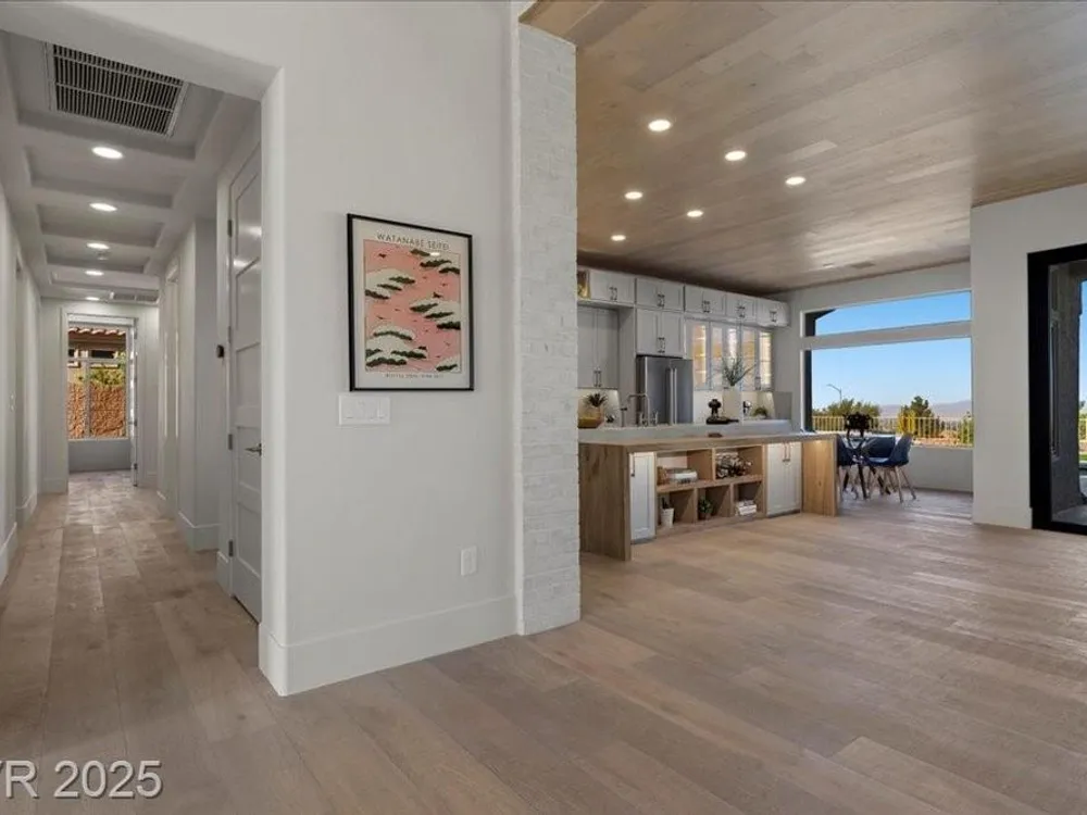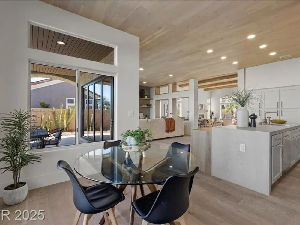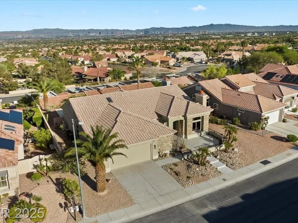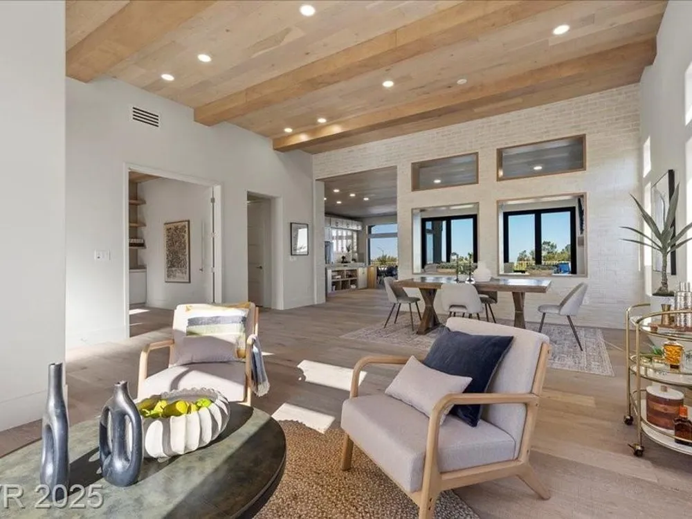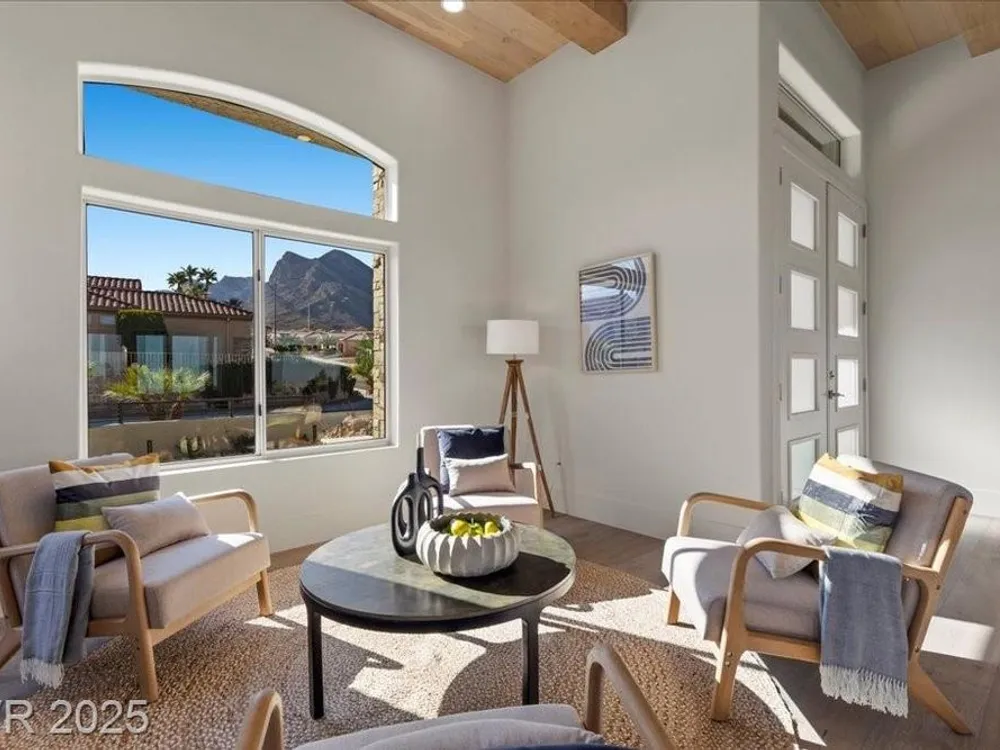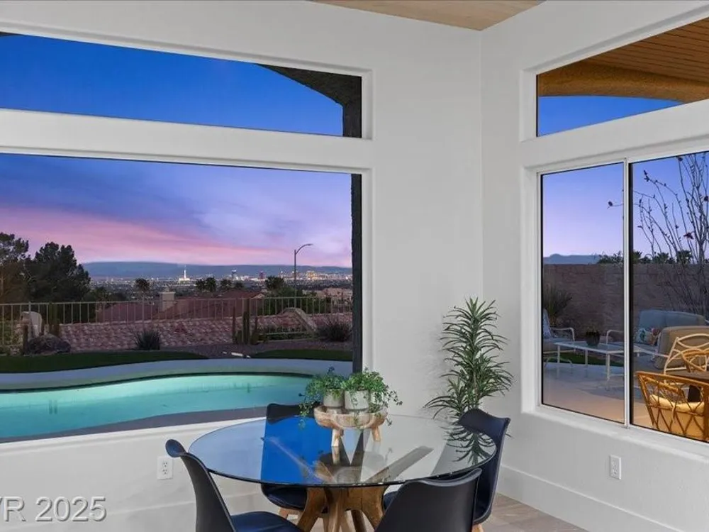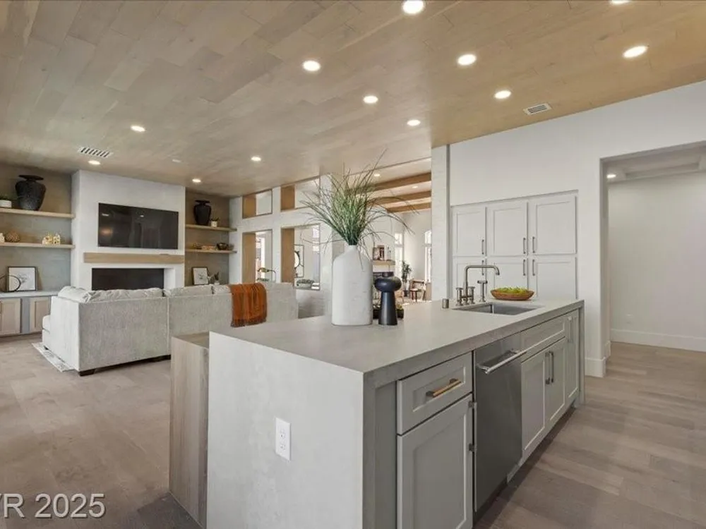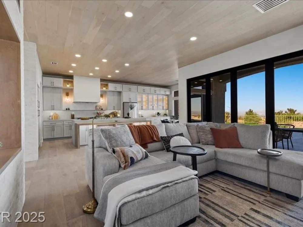 Premium design meets the ultimate 55+ lifestyle in this stunning Sun City Summerlin home. Enjoy iconic Strip views from the primary suite, kitchen, family room & backyard, while the front of the home captures breathtaking desert sunsets. Every detail has been thoughtfully curated, from the modern water-vapor fireplace & premium white oak engineered hardwood floors to custom wood-accent ceilings & designer walls that elevate the style throughout. At the heart of the home, the chef’s kitchen is a true showpiece with a spacious island, sleek quartz counters & open layout—perfect for entertaining or relaxing. A 15-ft panoramic sliding door of individual panels creates seamless indoor/outdoor living with twinkling city lights as your backdrop. Sun City Summerlin offers world-class amenities: 4 clubhouses, 3 golf courses, fitness center, pools, pickleball, social clubs & more. With shopping, dining & freeway access nearby, this home delivers the best of Las Vegas living.