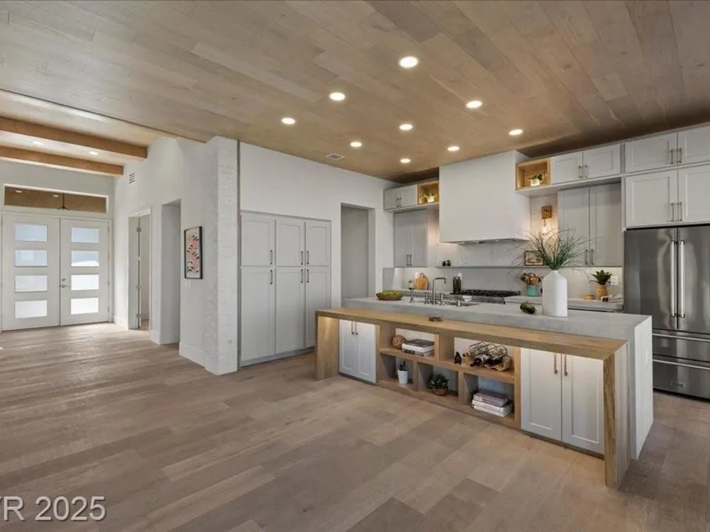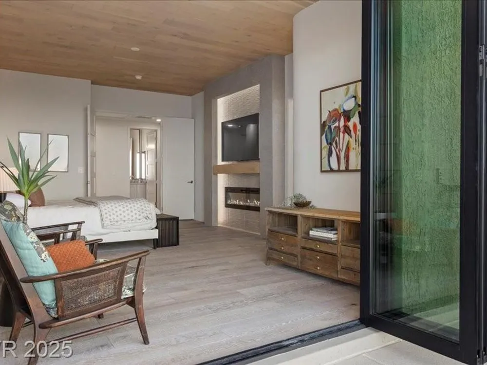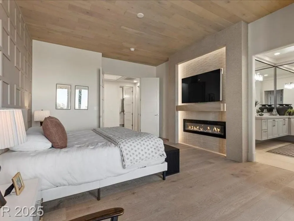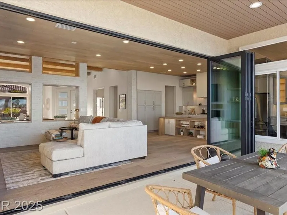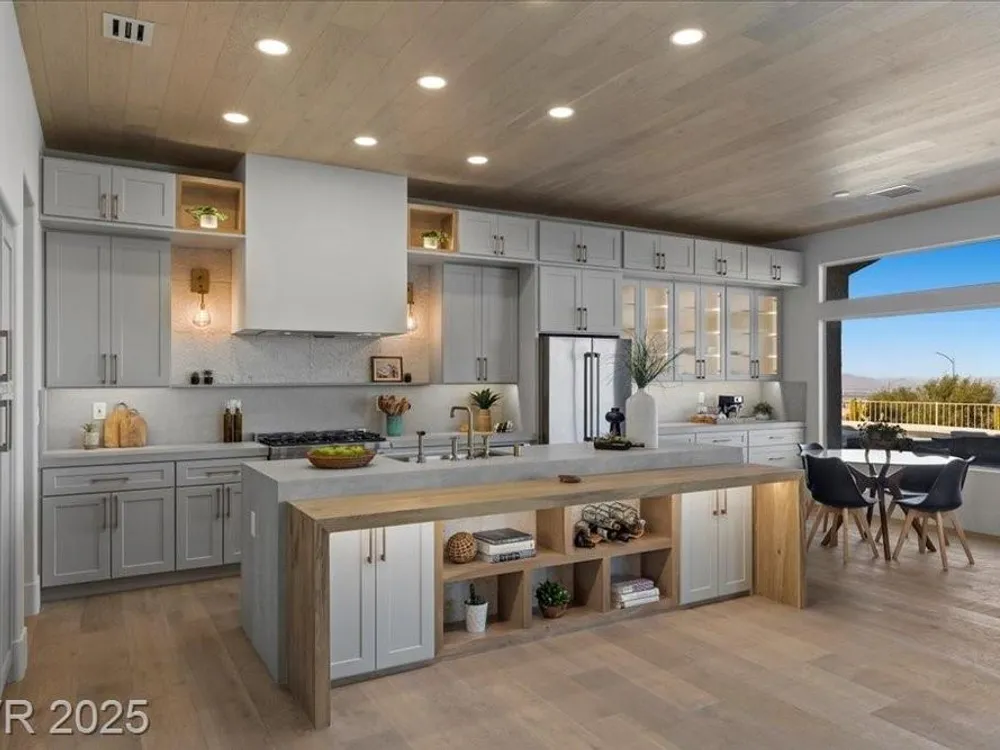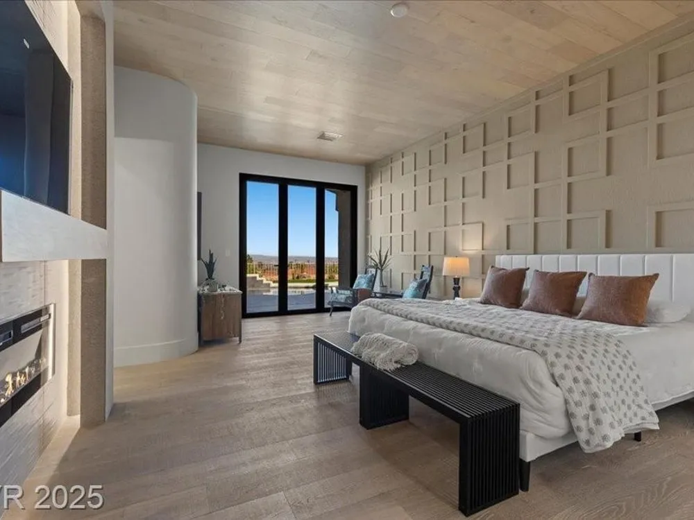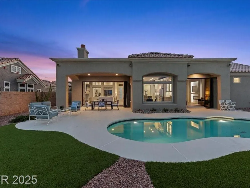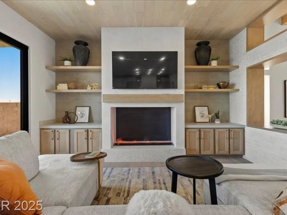 Premium design meets the ultimate 55+ lifestyle in this stunning Sun City Summerlin home. Enjoy iconic Strip views from the primary suite, kitchen, family room & backyard, while the front of the home captures breathtaking desert sunsets. Every detail has been thoughtfully curated, from the modern water-vapor fireplace & premium white oak engineered hardwood floors to custom wood-accent ceilings & designer walls that elevate the style throughout. At the heart of the home, the chef’s kitchen is a true showpiece with a spacious island, sleek quartz counters & open layout—perfect for entertaining or relaxing. A 15-ft panoramic sliding door of individual panels creates seamless indoor/outdoor living with twinkling city lights as your backdrop. Sun City Summerlin offers world-class amenities: 4 clubhouses, 3 golf courses, fitness center, pools, pickleball, social clubs & more. With shopping, dining & freeway access nearby, this home delivers the best of Las Vegas living.