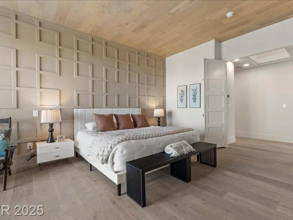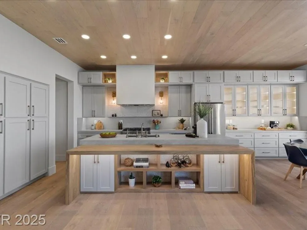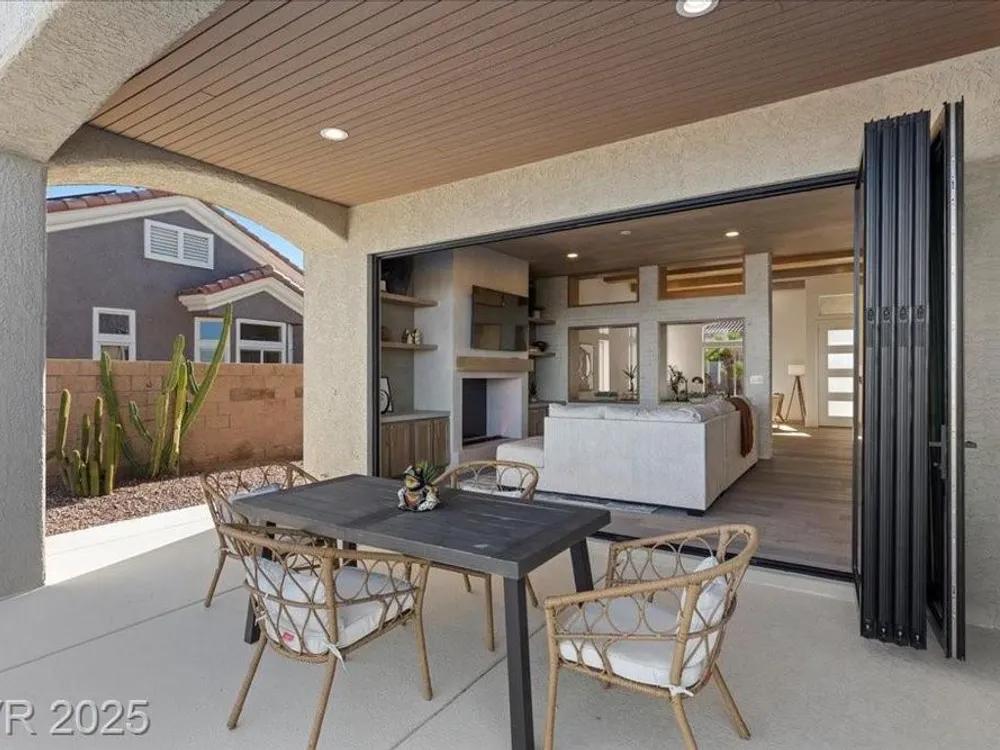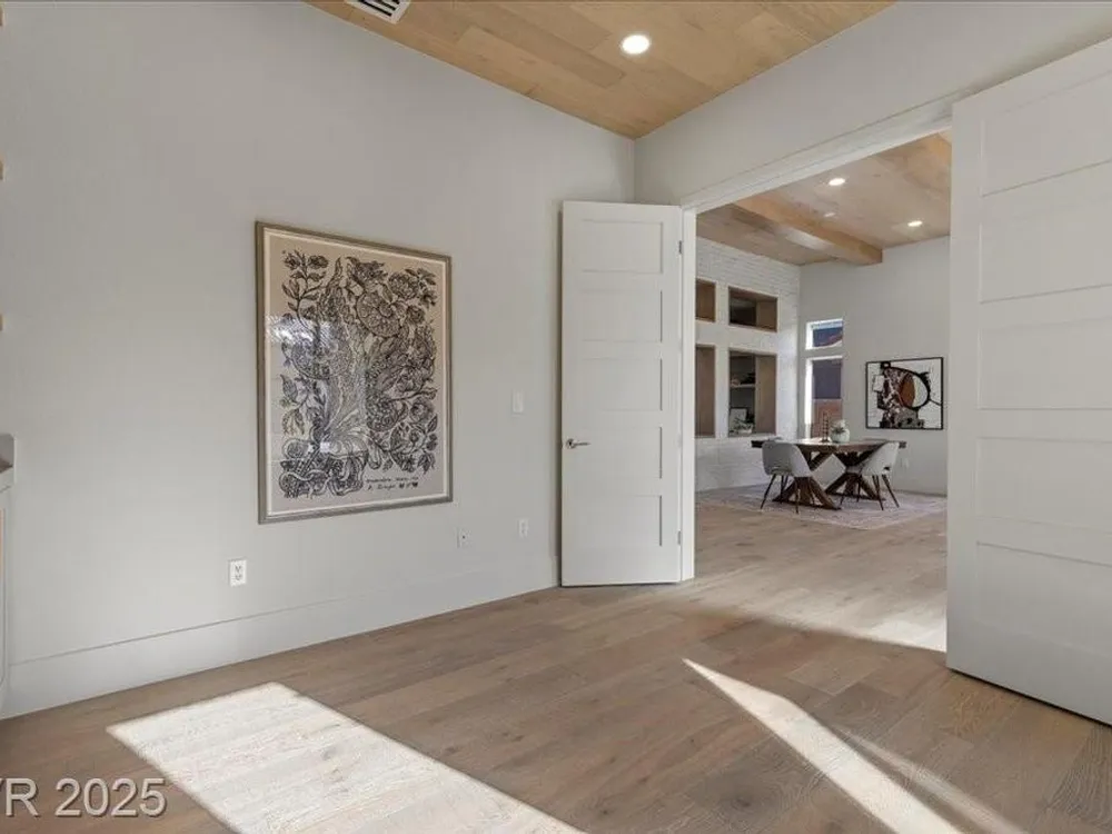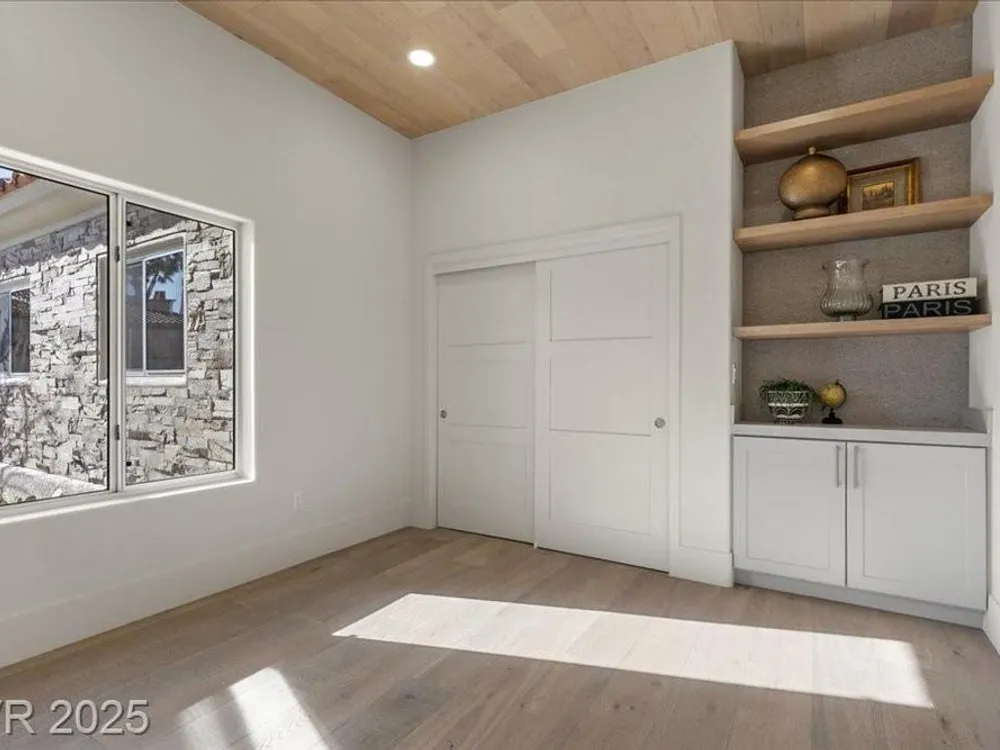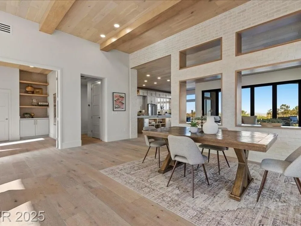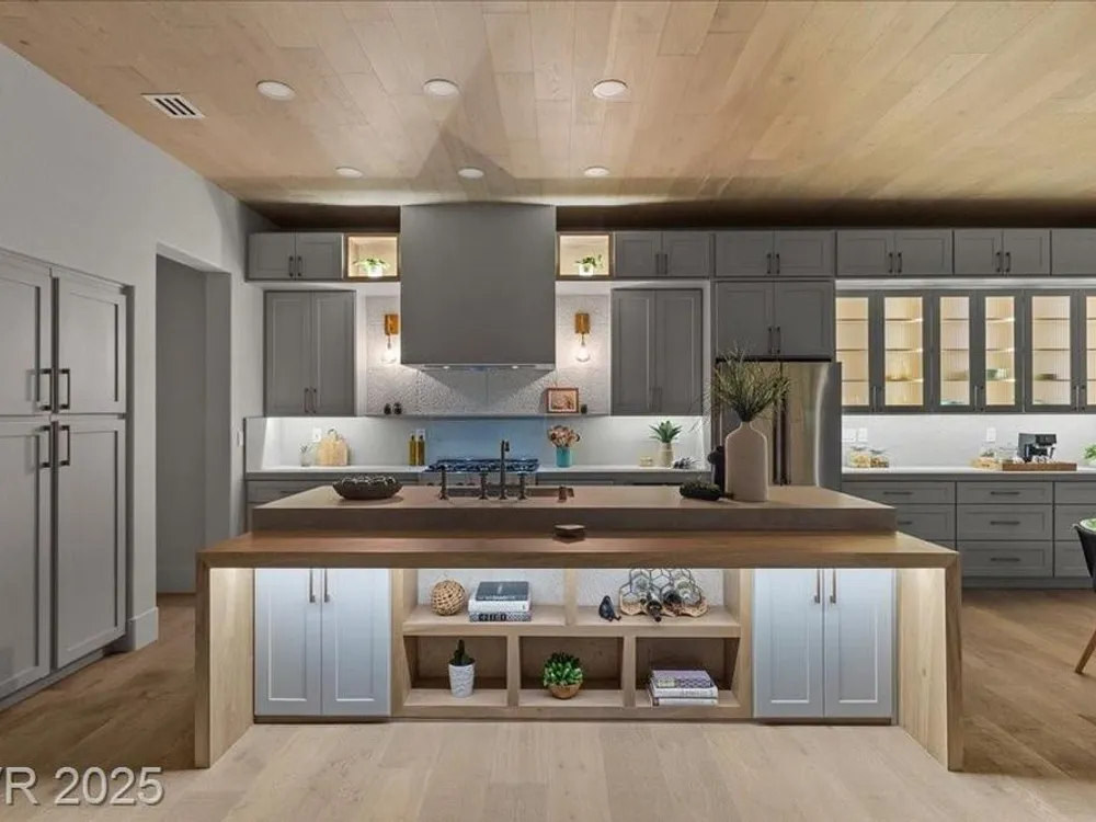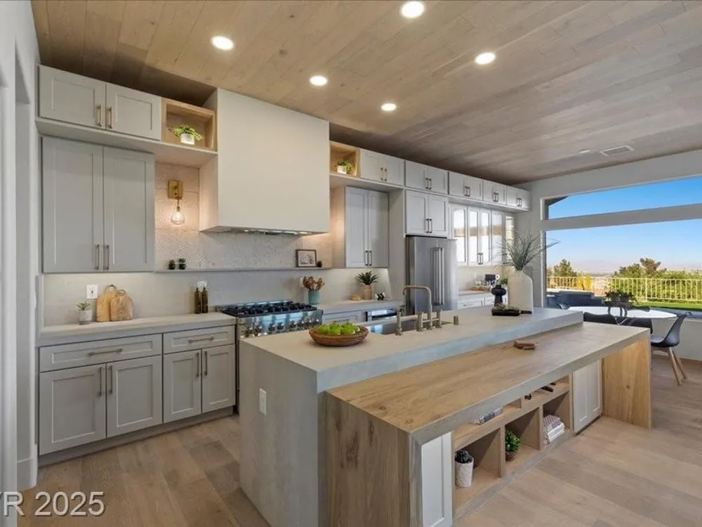 Premium design meets the ultimate 55+ lifestyle in this stunning Sun City Summerlin home. Enjoy iconic Strip views from the primary suite, kitchen, family room & backyard, while the front of the home captures breathtaking desert sunsets. Every detail has been thoughtfully curated, from the modern water-vapor fireplace & premium white oak engineered hardwood floors to custom wood-accent ceilings & designer walls that elevate the style throughout. At the heart of the home, the chef’s kitchen is a true showpiece with a spacious island, sleek quartz counters & open layout—perfect for entertaining or relaxing. A 15-ft panoramic sliding door of individual panels creates seamless indoor/outdoor living with twinkling city lights as your backdrop. Sun City Summerlin offers world-class amenities: 4 clubhouses, 3 golf courses, fitness center, pools, pickleball, social clubs & more. With shopping, dining & freeway access nearby, this home delivers the best of Las Vegas living.