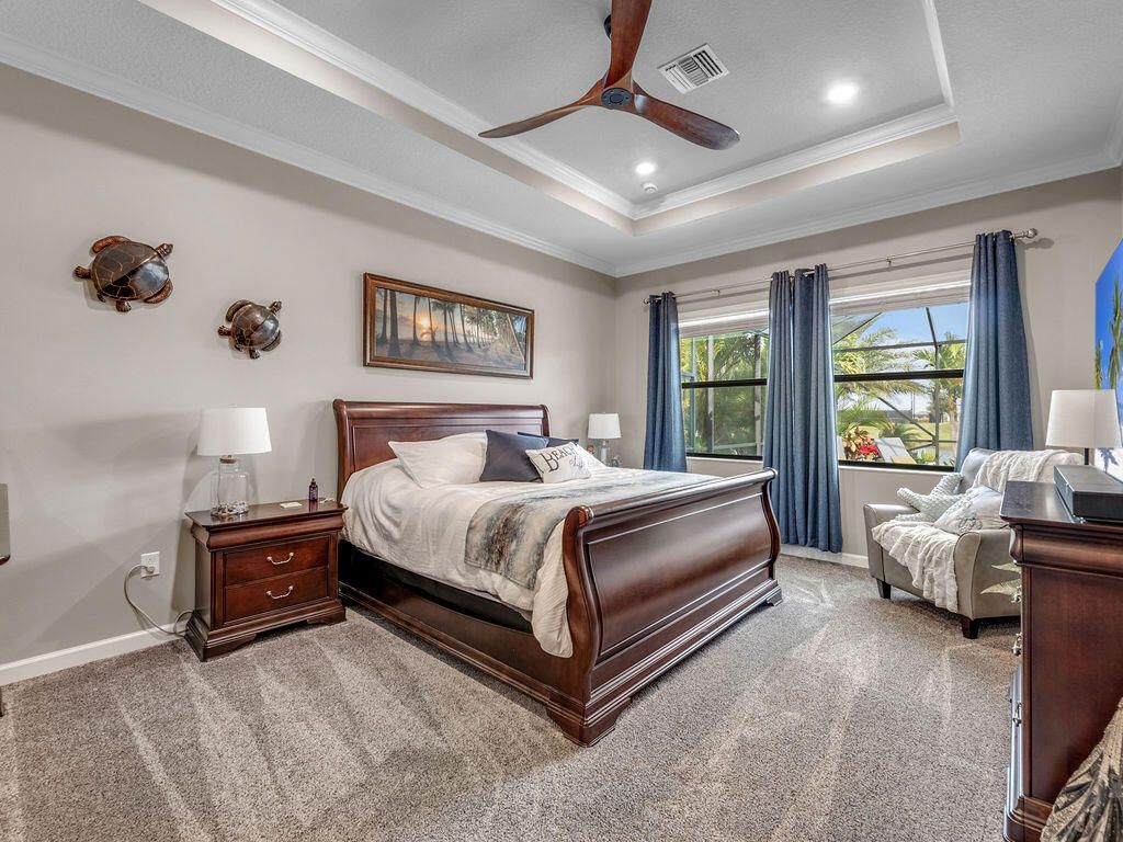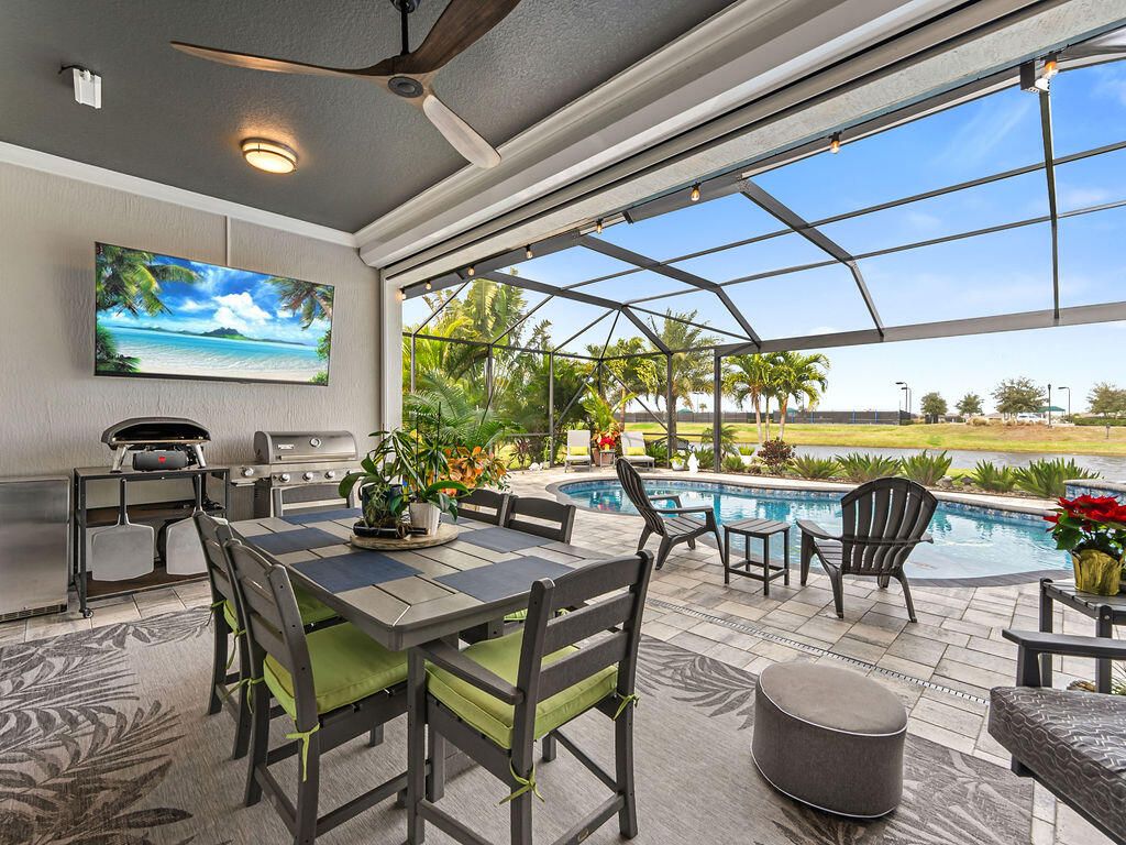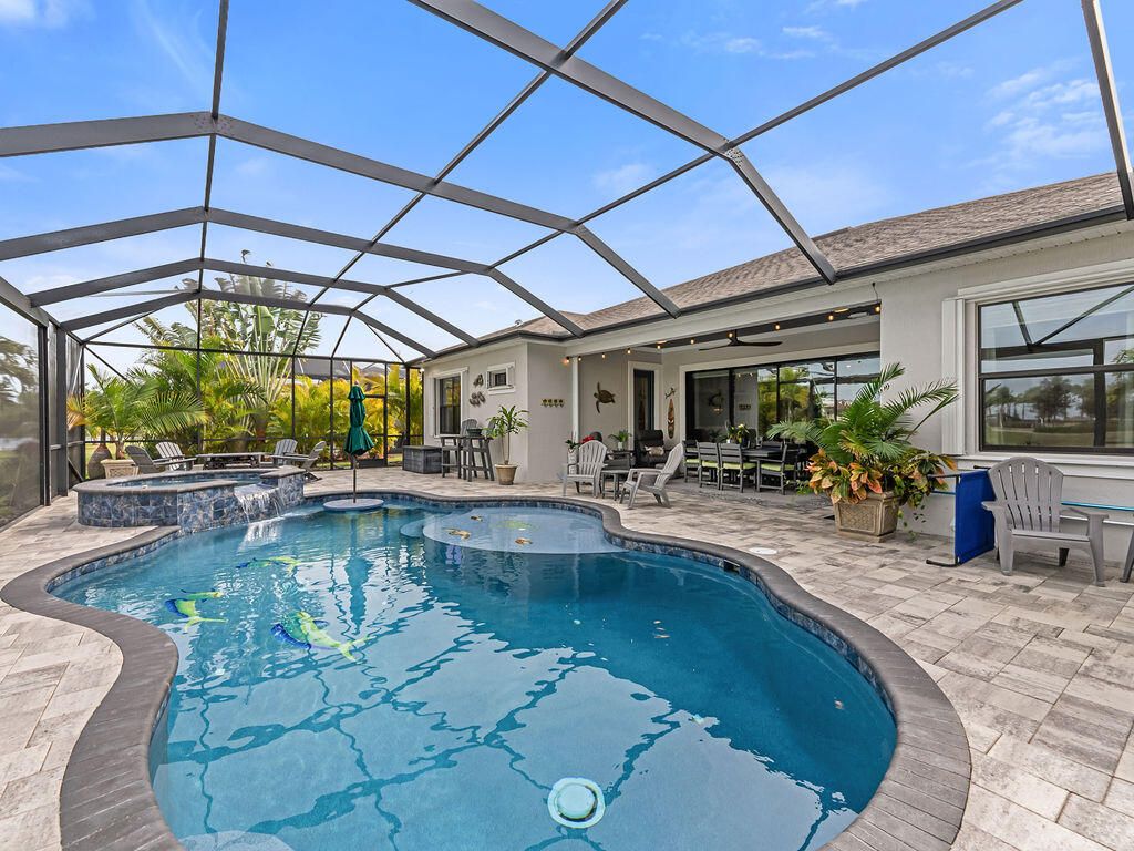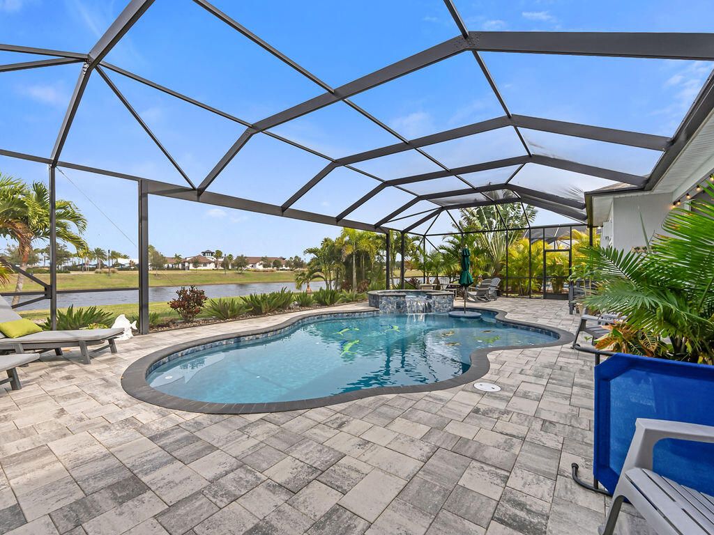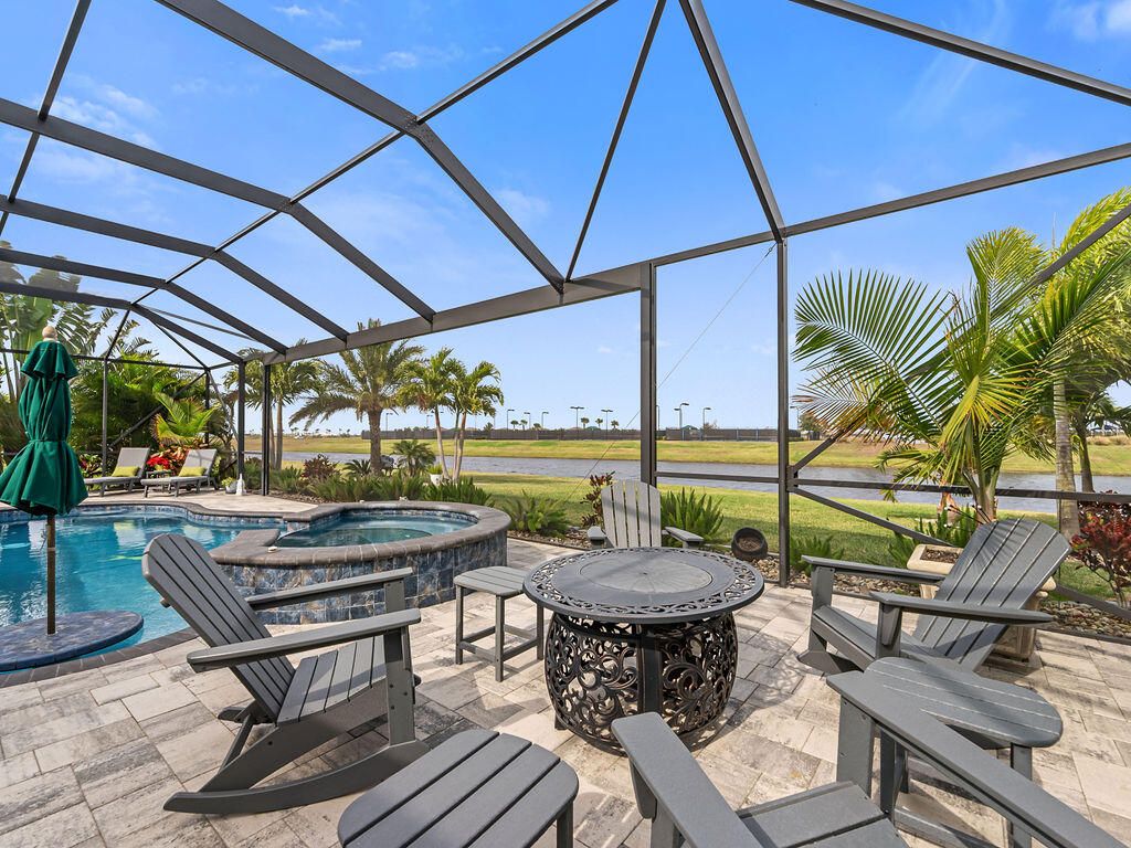 Look at this nearly new 4 Bedroom lakefront home in a premier 55+ Central Viera community! It features a private heated pool and spa, 3-car split garage and double driveway. Enjoy the open, light filled floorplan with spacious living areas and 3 full bathrooms. This house is storm ready with accordion and electric shutter and paid off solar panels. The community provides resort style amenities including clubhouse, fitness center, cafe, movie theater, pickleball, tennis, and a jam packed social calendar with non stop events and live music. Bring your golf cart and never leave home!