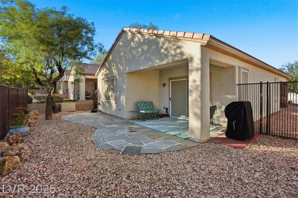 Beautiful Lewis Model with an inviting stacked-stone entrance and a bright, open layout. This 2-bed, 2-bath home features upgraded designer tile flooring throughout—no carpet. The kitchen includes granite counters, stainless steel appliances, and plenty of workspace. Enjoy a private, fully fenced backyard with a covered patio and easy-care landscaping. The garage provides excellent storage, and all appliances remain with the home. Premium Boss Security Screens (over $10,000 value) offer added comfort and protection, and a safe is located in the primary closet. Situated in the sought after Solera at Anthem, an active 55+ Del Webb community with lots of amenities, close to shopping and dining. Immaculate, well-kept, and move-in ready!