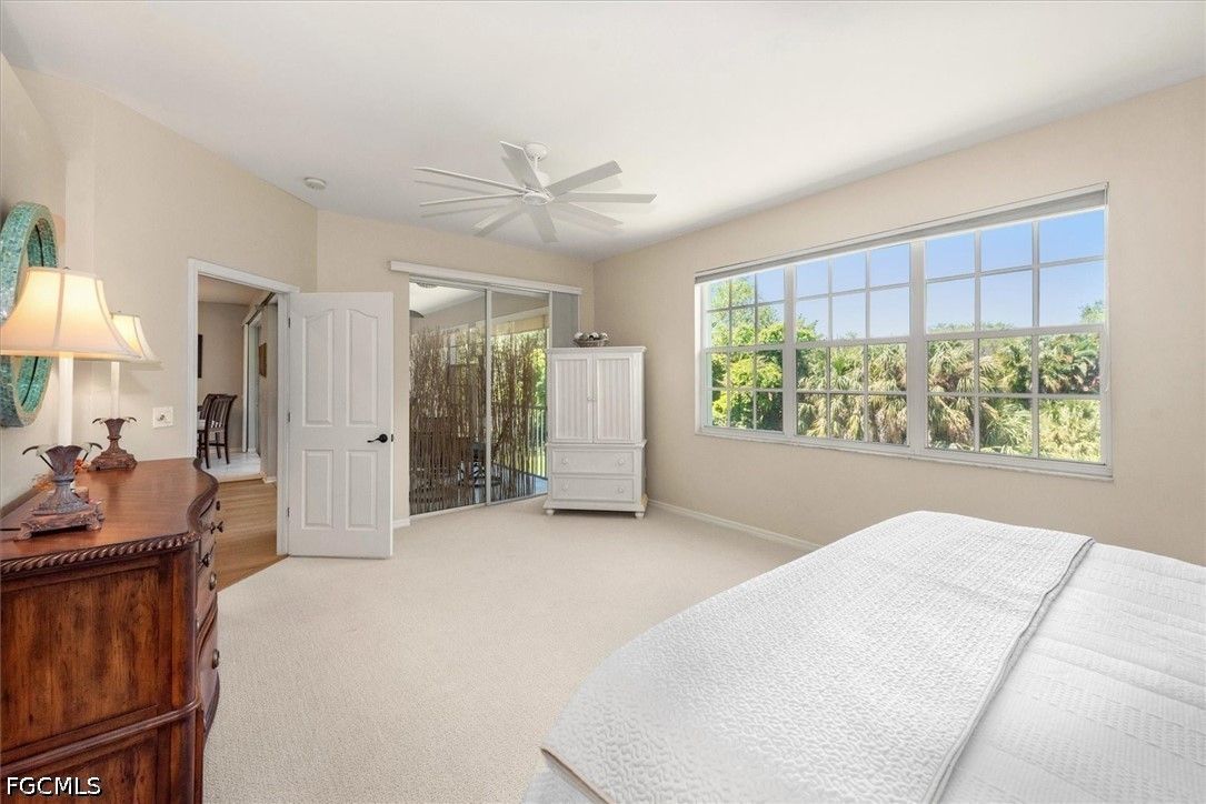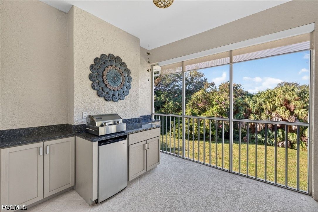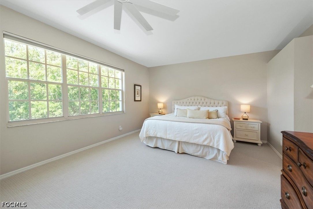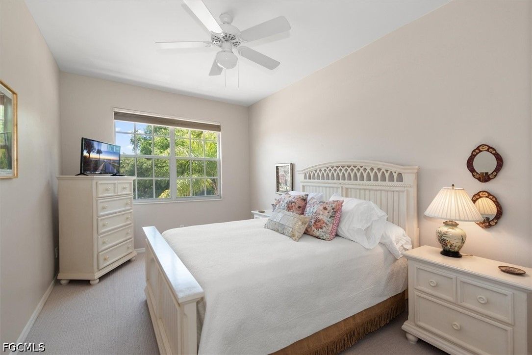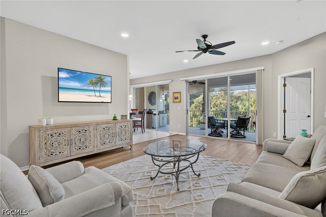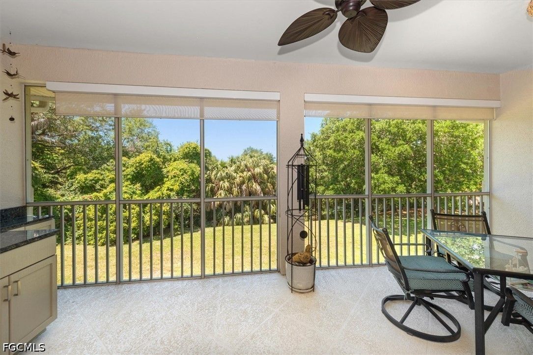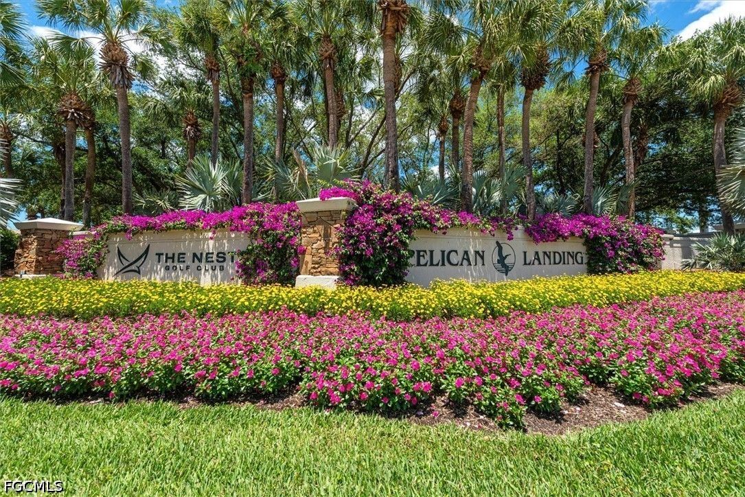 Tucked on a low traffic cul-de-sac street among peaceful treetop and creek views, this spacious second-floor carriage home offers over 2,100 square feet of beautifully designed living space with 3 bedrooms, 2 baths, and an attached one-car garage. Offered turnkey, the residence is tastefully furnished and completely move-in ready—just bring your suitcase and start enjoying life. The open-concept floor plan is ideal for both everyday living and entertaining, featuring engineered wood flooring, upgraded kitchen cabinetry, Corian countertops, and stylish finishes throughout. The kitchen flows seamlessly into the main living area and out to the screened lanai, where a rare outdoor kitchen showcases a built-in JennAir electric grill, refrigerator, and granite counters creating the perfect setting for effortless alfresco dining. The primary suite is a true retreat, complete with a beautifully renovated bath featuring a walk-in shower, soaking tub, custom cabinetry, and a built-in vanity with under cabinet lighting and custom mirrors. Guest bedrooms are thoughtfully separated for privacy and offer an updated bath along with newer upgraded carpeting. Additional highlights include a tankless water heater, recently replaced air conditioning system, Hunter Douglas energy-efficient blinds, and a fully renovated laundry room with stacked washer and dryer, utility sink hookup, and extra storage. Residents enjoy access to the private Southbridge pool, along with all the exceptional amenities of Pelican Landing, including a community center, fitness facility, tennis and pickleball courts, kayak and canoe park, sailing center, marina, scenic walking and biking paths, butterfly garden, and a 34-acre private beach park with boat shuttle. Optional golf memberships may be available. Ideally located near shopping, dining, and just a short drive to Southwest Florida International Airport, this home offers the perfect blend of comfort, convenience, and resort-style living.