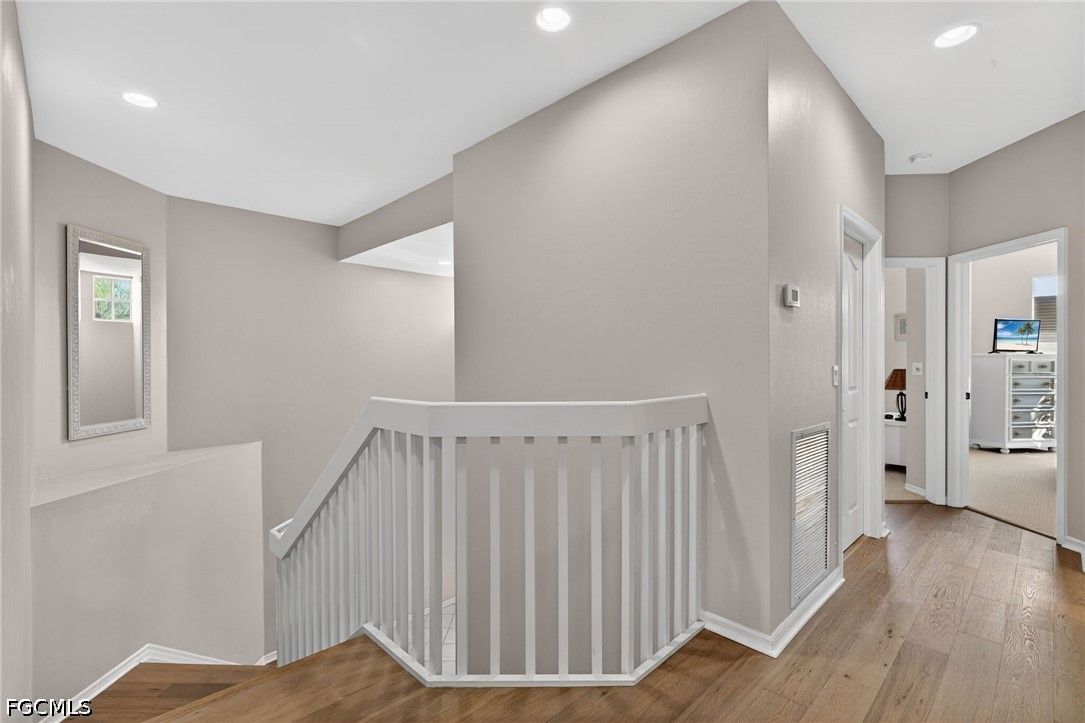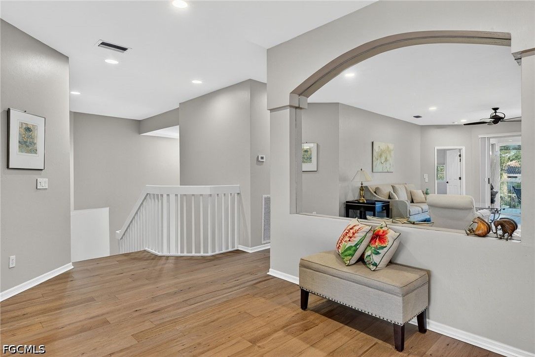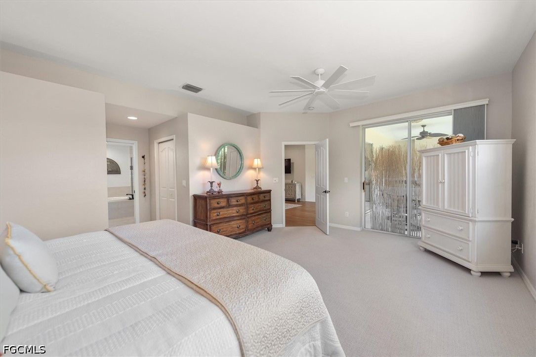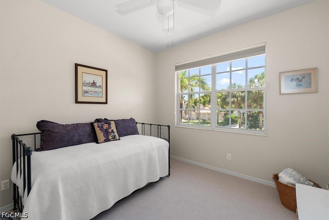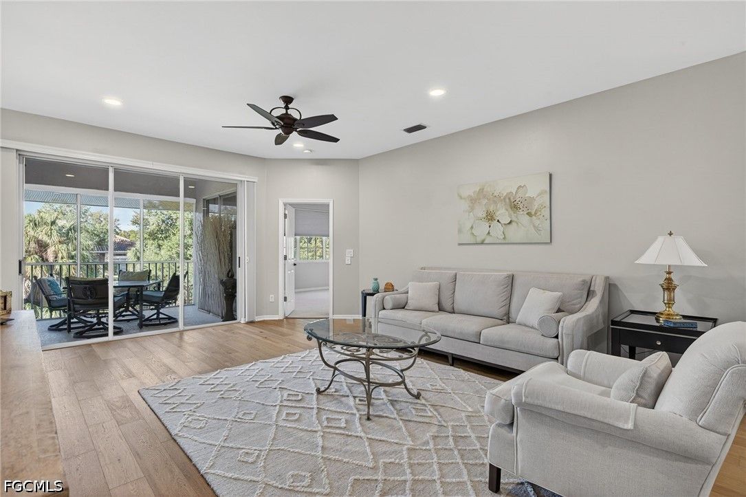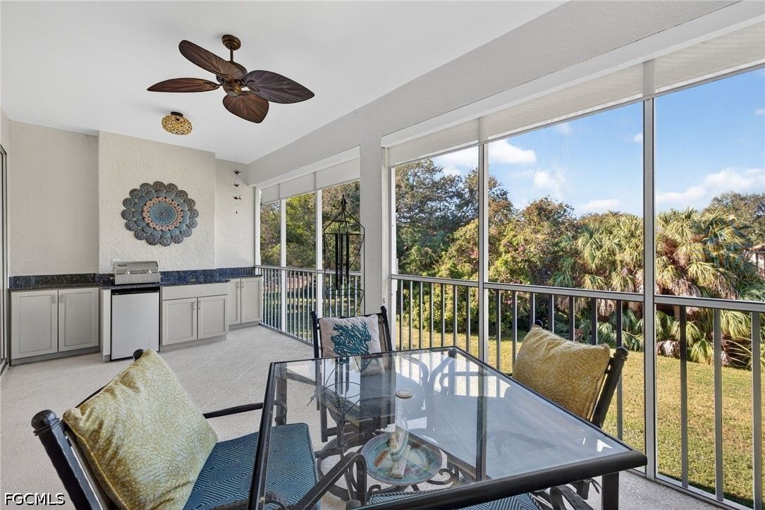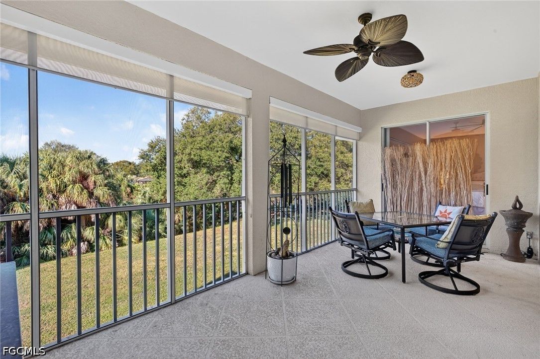 Tucked on a low traffic cul-de-sac street among peaceful treetop and creek views, this spacious second-floor carriage home offers over 2,100 square feet of beautifully designed living space with 3 bedrooms, 2 baths, and an attached one-car garage. Offered turnkey, the residence is tastefully furnished and completely move-in ready—just bring your suitcase and start enjoying life. The open-concept floor plan is ideal for both everyday living and entertaining, featuring engineered wood flooring, upgraded kitchen cabinetry, Corian countertops, and stylish finishes throughout. The kitchen flows seamlessly into the main living area and out to the screened lanai, where a rare outdoor kitchen showcases a built-in JennAir electric grill, refrigerator, and granite counters creating the perfect setting for effortless alfresco dining. The primary suite is a true retreat, complete with a beautifully renovated bath featuring a walk-in shower, soaking tub, custom cabinetry, and a built-in vanity with under cabinet lighting and custom mirrors. Guest bedrooms are thoughtfully separated for privacy and offer an updated bath along with newer upgraded carpeting. Additional highlights include a tankless water heater, recently replaced air conditioning system, Hunter Douglas energy-efficient blinds, and a fully renovated laundry room with stacked washer and dryer, utility sink hookup, and extra storage. Residents enjoy access to the private Southbridge pool, along with all the exceptional amenities of Pelican Landing, including a community center, fitness facility, tennis and pickleball courts, kayak and canoe park, sailing center, marina, scenic walking and biking paths, butterfly garden, and a 34-acre private beach park with boat shuttle. Optional golf memberships may be available. Ideally located near shopping, dining, and just a short drive to Southwest Florida International Airport, this home offers the perfect blend of comfort, convenience, and resort-style living.