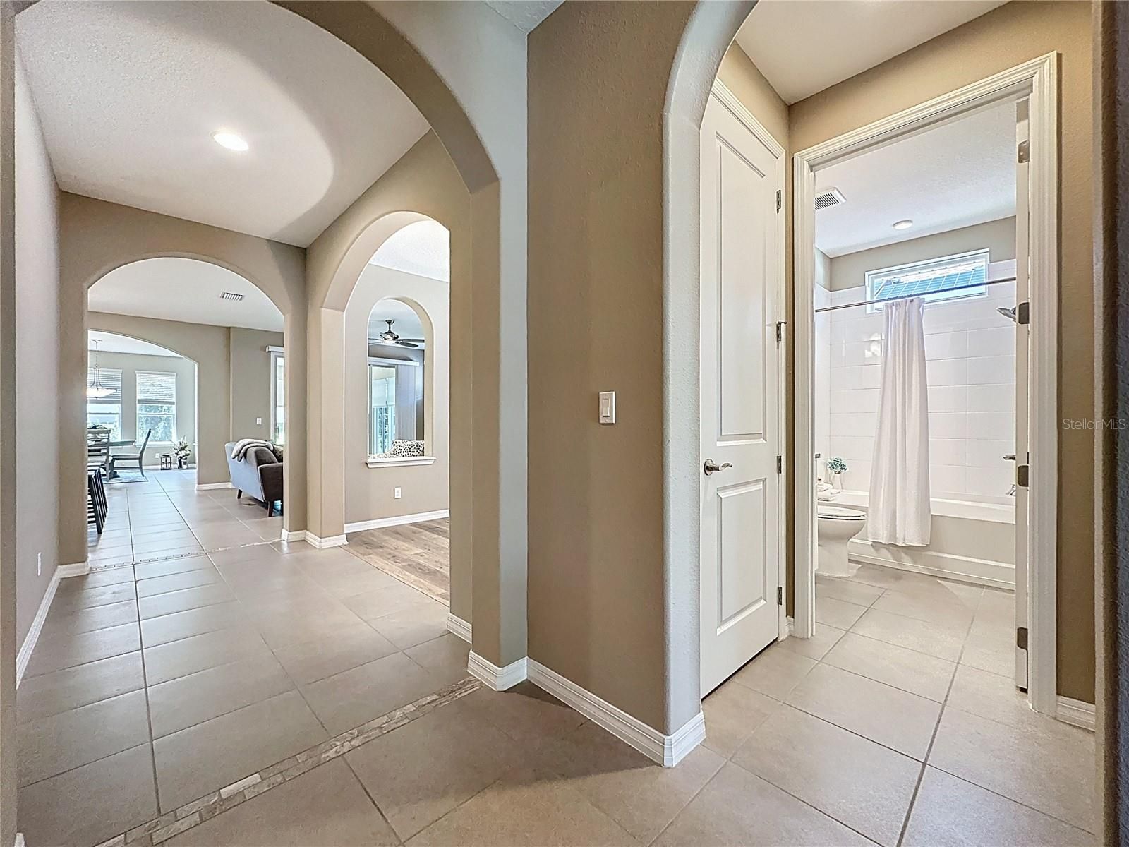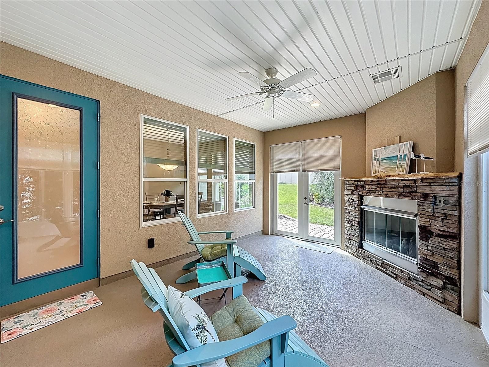This beautifully maintained Shea Homes Larkspur model, built in 2017, offers 1,925 sq. ft. of luxurious living space with thoughtful upgrades throughout. This home combines modern design with convenience and comfort. The exterior was recently repainted in 2024, giving it fresh curb appeal, and the interior was painted 9/2025. The home is move-in ready with 2025 HOA PAID IN FULL. No HOA payments due until January 2026. Inside, the open floorplan includes engineered wood flooring in the Primary and Guest bedrooms and luxury vinyl plank flooring in the Den. Custom blinds are installed throughout the home, enhancing the elegance of the space. The renovated Primary bathroom is a highlight, with a custom walk-in shower, decorative tile, upgraded fixtures, porcelain tile floors, and beautiful granite vanity tops. The oversized laundry room, which serves as a “Smart Space,” offers abundant cabinetry, counter space, a built-in desk, and a utility sink. Included are the GE front-load washer and gas dryer, both under an extended, transferable service plan. The gourmet kitchen features a GE refrigerator and an upgraded Bosch dishwasher, both with transferable service plans, ensuring long-term value. For outdoor living, the enclosed lanai boasts insulated windows, French doors, and transom windows for added ventilation. A natural gas fireplace in the lanai provides warmth and ambiance, while a motorized SunPro awning with LED lighting offers shade and a perfect setup for outdoor entertaining. The paver patio outside the lanai includes a natural gas “stub-out” for grilling. The yard is beautifully landscaped with mature plants, stepping stones, and decorative stone and concrete edging, offering a serene environment for relaxation. This home is also equipped with a Tesla Energy/Solar City solar package, including a transferable 20-year lease that began in July 2017. The lease is paid in full. One of the many benefits of the lease is that Tesla will handle all repairs and replacements of the solar panels, and they will even remove and reinstall the panels during roof replacement, all at no additional cost. Additional features include a transferable termite bond and bi-annual HVAC service since 2017, providing peace of mind for years to come. With its prime location, extensive upgrades, and energy-efficient features, this home is truly a must-see. Move-in ready and thoughtfully designed, it’s the perfect place to call home.
