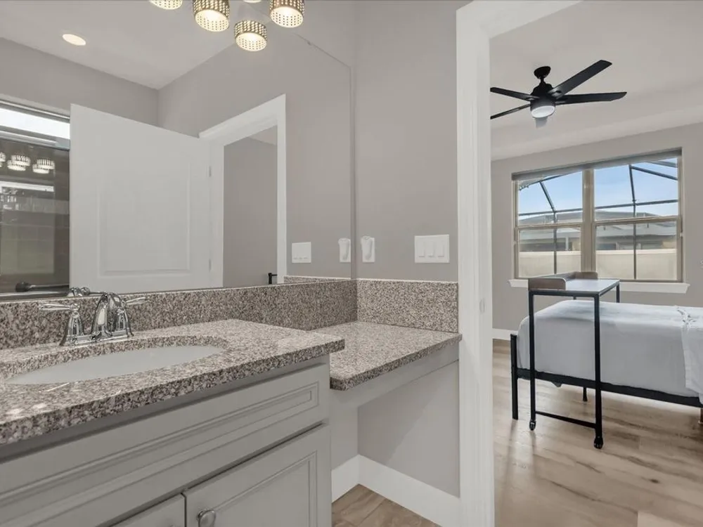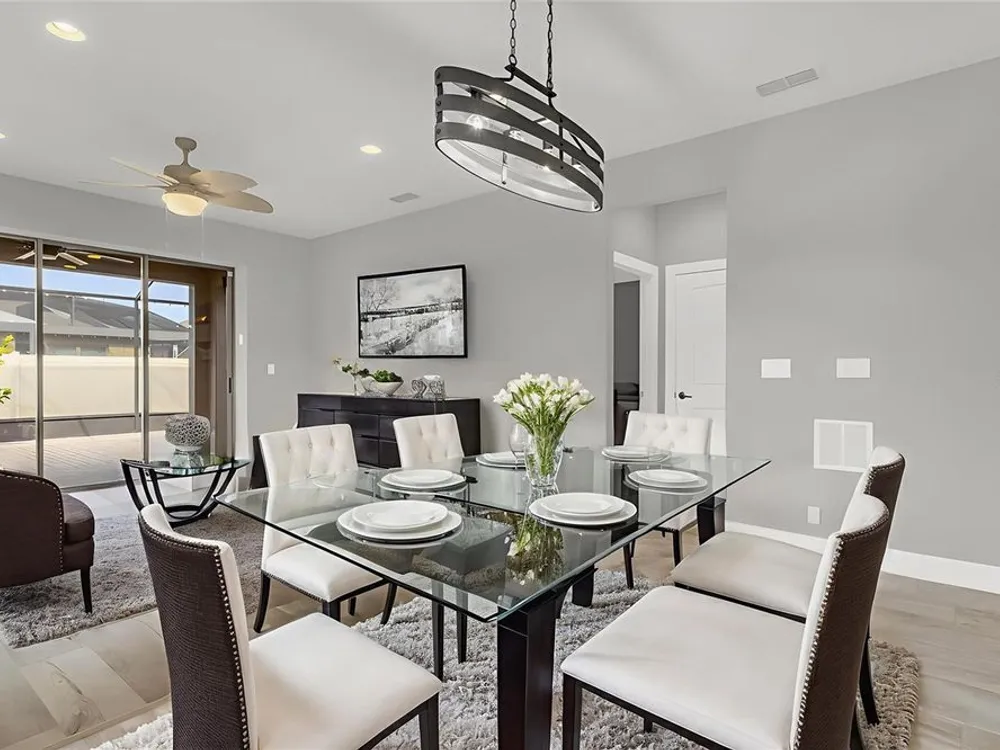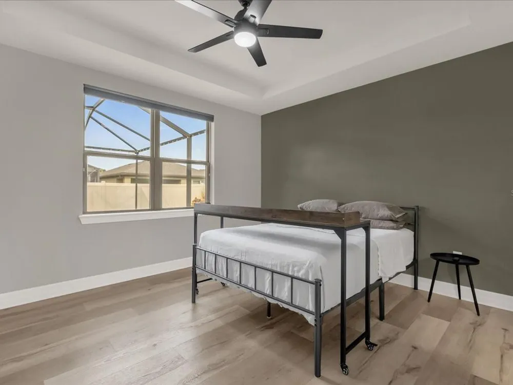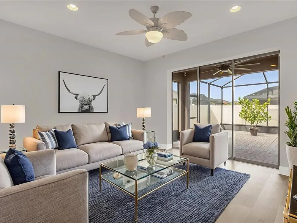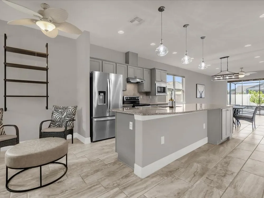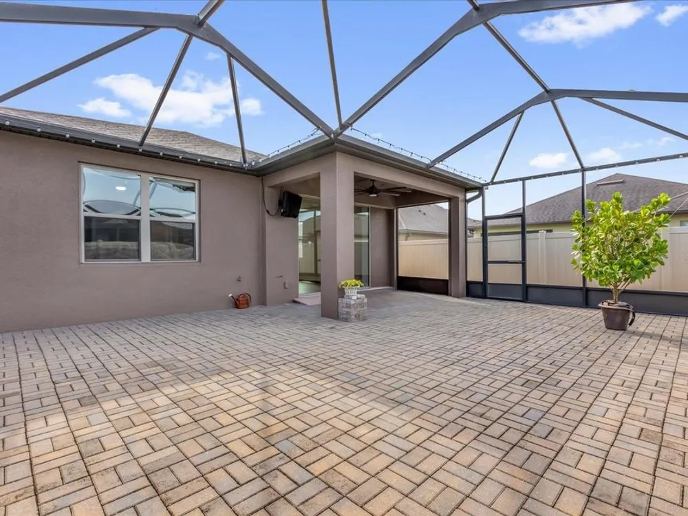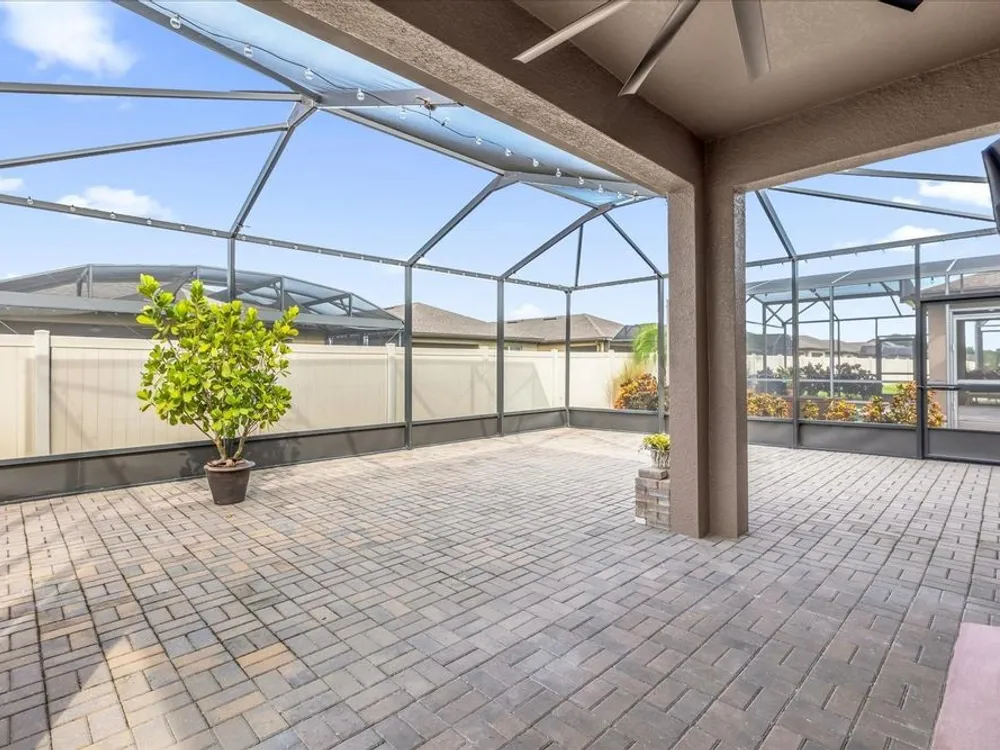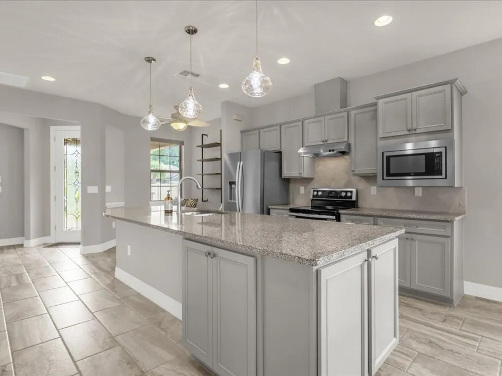 Pristine Condition! Enjoy resort style living in this beautiful 55+ guard-gated community of Ridgewood Lakes! Step into this stunning Del Webb Orlando home where style, comfort, and convenience meet. A wide 3-panel sliding door fills the open floor plan with natural light and creates a seamless flow to the large screened lanai with extended paver patio—perfect for entertaining or quiet evenings outdoors. The fenced yard with gas grill hookup and privacy features add extra peace of mind. Inside, the well-appointed kitchen shines with custom cabinetry, granite countertops, oversized island, stainless steel appliances, double oven, and abundant storage. The spacious dining room and inviting living room are designed for both everyday living and special gatherings. A split bedroom layout ensures privacy, with the primary suite offering an ensuite bath featuring his+hers sinks, granite countertops, separate shower, and walk-in closet. Upgrades throughout include plank flooring, ceiling fans, four mounted TVs (all convey), insulated garage with epoxy flooring, surround sound wiring, and an upgraded energy package. Even the driveway is paved, leading to your 2-car garage and a 4 Ft EXTENDED GARAGE which accommodates larger vehicles as well as offering that much needed additional storage space. Located in a quiet, and centrally located community, this home offers unmatched amenities. Homeowners enjoy exclusive access to the 30,000 sq ft Montecito Clubhouse featuring a ballroom, tavern, gym, craft rooms, and a resort-style pool. Outdoor activities abound with tennis, pickleball, bocce, two dog parks, and even a playground for visiting grandchildren. Golf enthusiasts will appreciate the 18-hole White Heron Golf Club with on-site restaurant, right within Ridgewood Lakes. Don’t miss the chance to own this immaculate home in one of the area’s most beautiful and active communities!