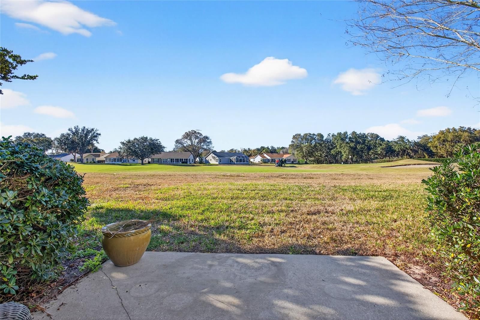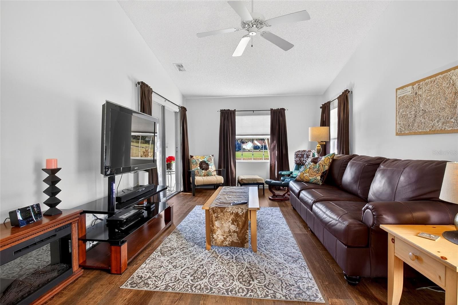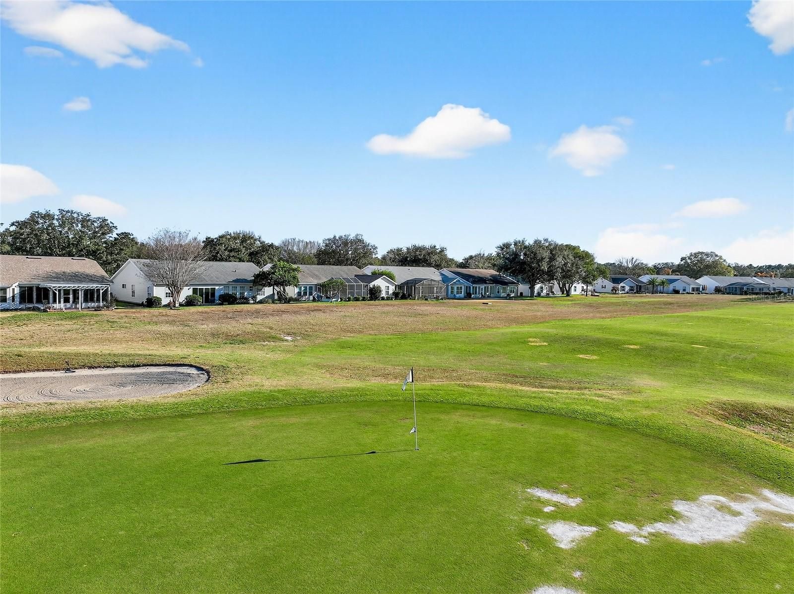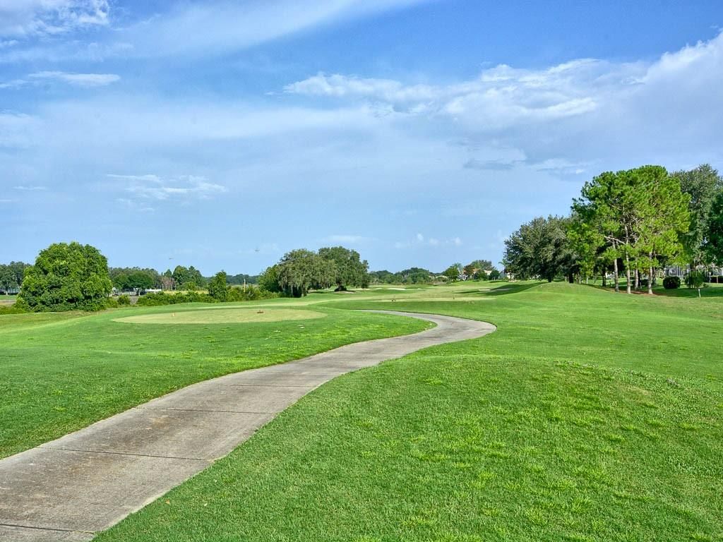 This immaculate 3-bedroom, 2-bathroom home sits right on the 18th green of Otters Creek Golf Course in Plantation at Leesburg. Its split floor plan ensures privacy for both owners and guests, while the spacious open living and dining area, highlighted by a cathedral ceiling, creates a warm and inviting atmosphere. There's also a Florida room offering beautiful golf course views and easy access to the back patio through sliding glass doors. The layout provides a welcoming spot for gatherings with friends and family. Laminate flooring throughout except the bathrooms and indoor laundry. The kitchen features plentiful cabinets, a pantry, a new stainless-steel stove and refrigerator, and a large breakfast area nearby. The primary suite includes his and hers walk-in closets, dual vanities, a walk-in shower, and a garden tub. Combined with the extensive amenities available at Plantation at Leesburg, this home represents a fantastic opportunity that is sure to go quickly. Schedule a viewing today to experience this charming property firsthand. This 55+ gated community has amenities galore with 36 holes of golf, 3 recreation centers and pools, a softball field, tennis courts, numerous clubs and activities and a restaurant and pub. This home comes with a 13 MONTH HOME WARRANTY. The roof is 2016 and the A/C is 2021.