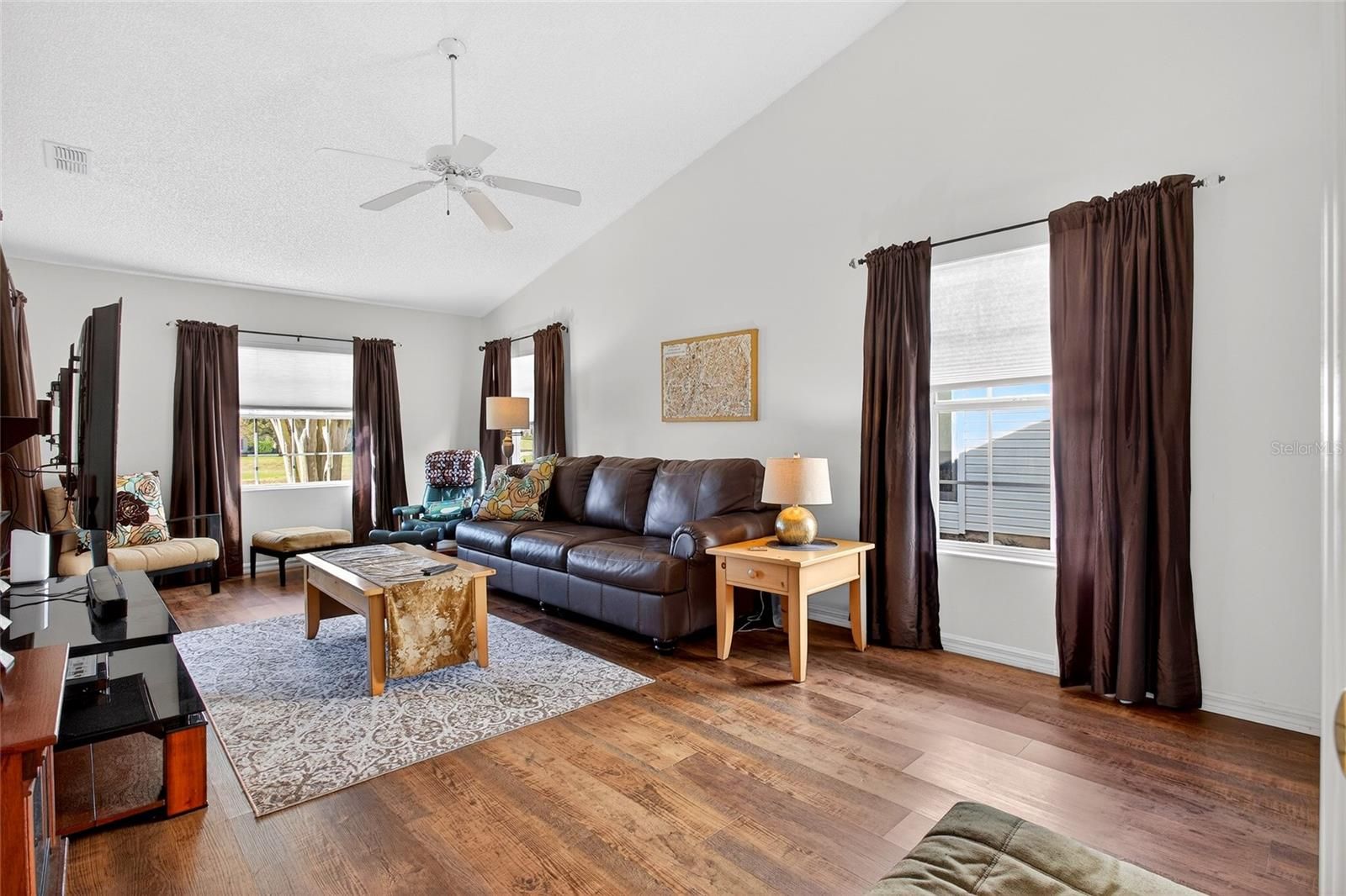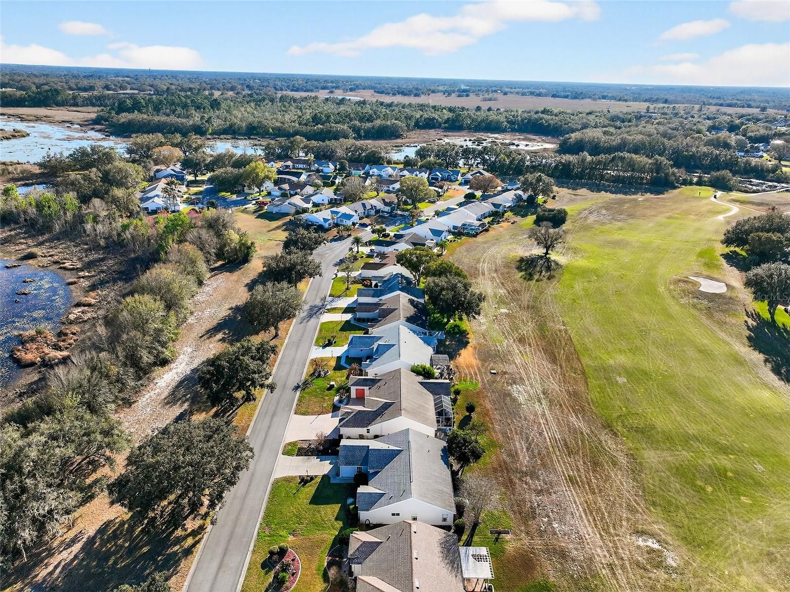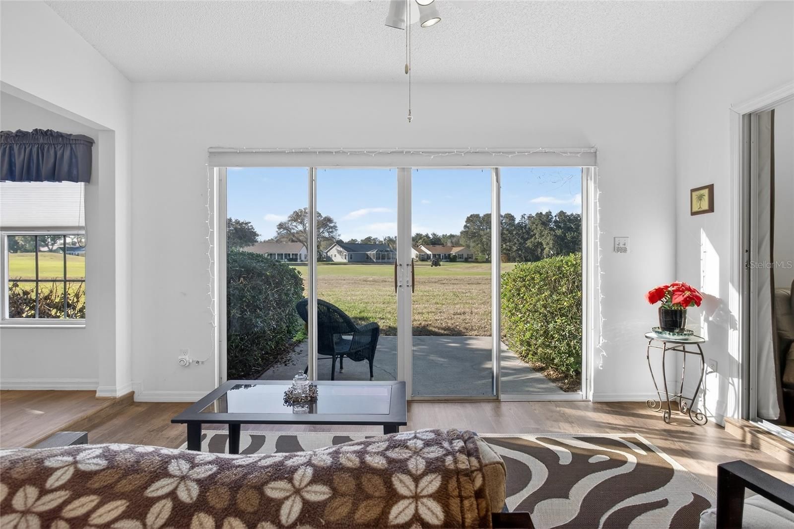 This immaculate 3-bedroom, 2-bathroom home sits right on the 18th green of Otters Creek Golf Course in Plantation at Leesburg. Its split floor plan ensures privacy for both owners and guests, while the spacious open living and dining area, highlighted by a cathedral ceiling, creates a warm and inviting atmosphere. There's also a Florida room offering beautiful golf course views and easy access to the back patio through sliding glass doors. The layout provides a welcoming spot for gatherings with friends and family. Laminate flooring throughout except the bathrooms and indoor laundry. The kitchen features plentiful cabinets, a pantry, a new stainless-steel stove and refrigerator, and a large breakfast area nearby. The primary suite includes his and hers walk-in closets, dual vanities, a walk-in shower, and a garden tub. Combined with the extensive amenities available at Plantation at Leesburg, this home represents a fantastic opportunity that is sure to go quickly. Schedule a viewing today to experience this charming property firsthand. This 55+ gated community has amenities galore with 36 holes of golf, 3 recreation centers and pools, a softball field, tennis courts, numerous clubs and activities and a restaurant and pub. This home comes with a 13 MONTH HOME WARRANTY. The roof is 2016 and the A/C is 2021.