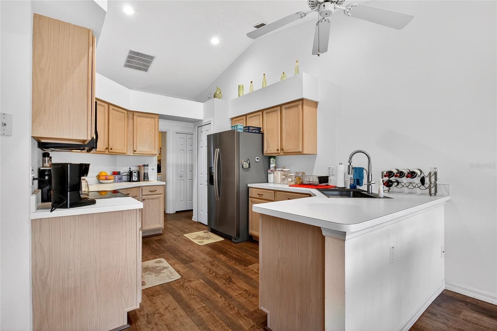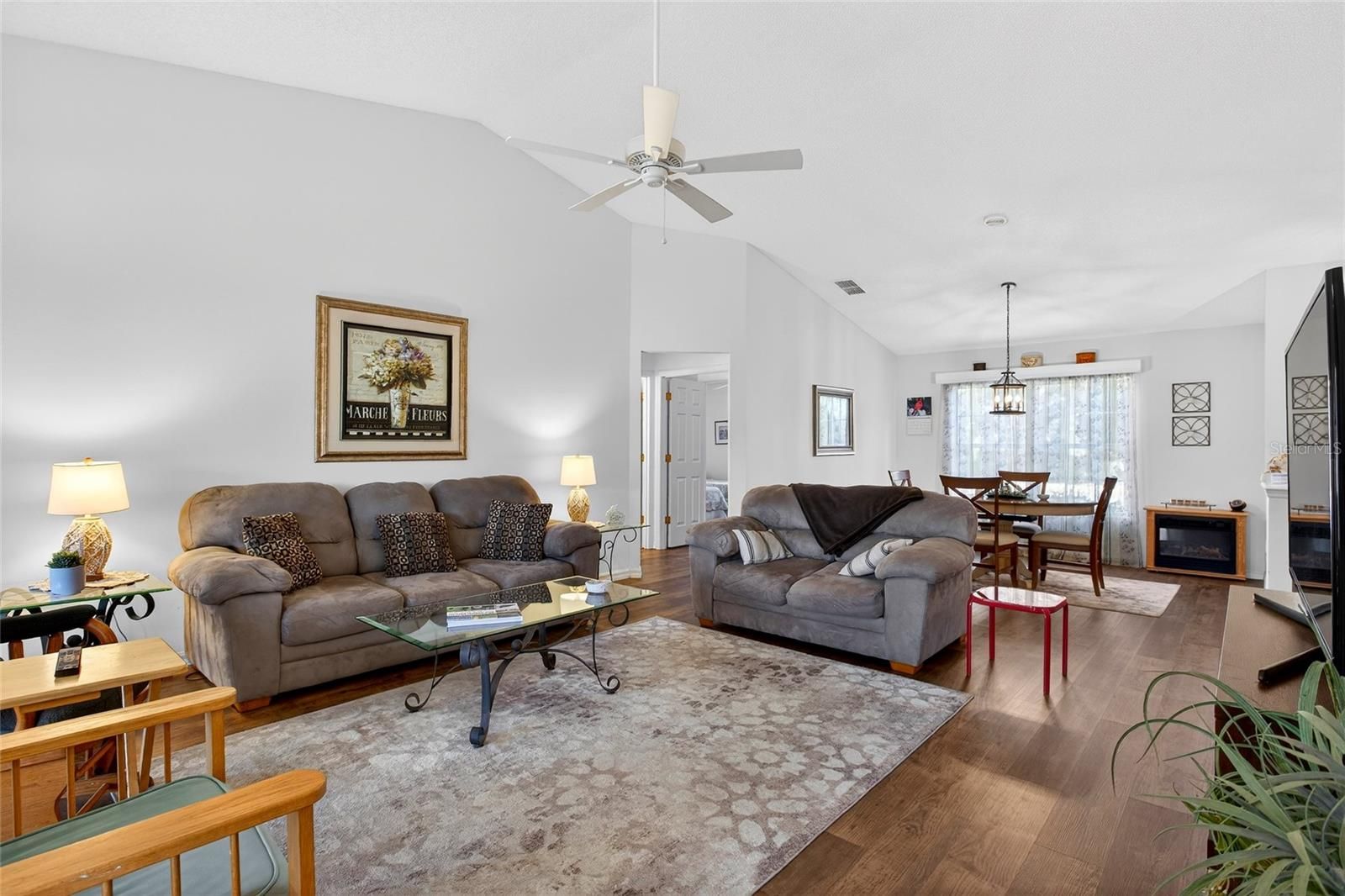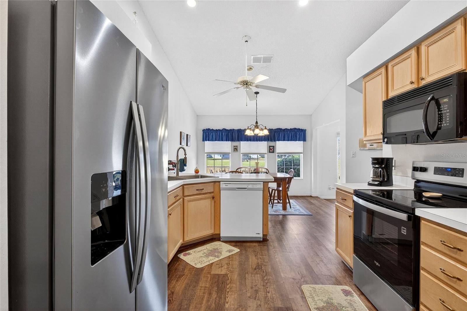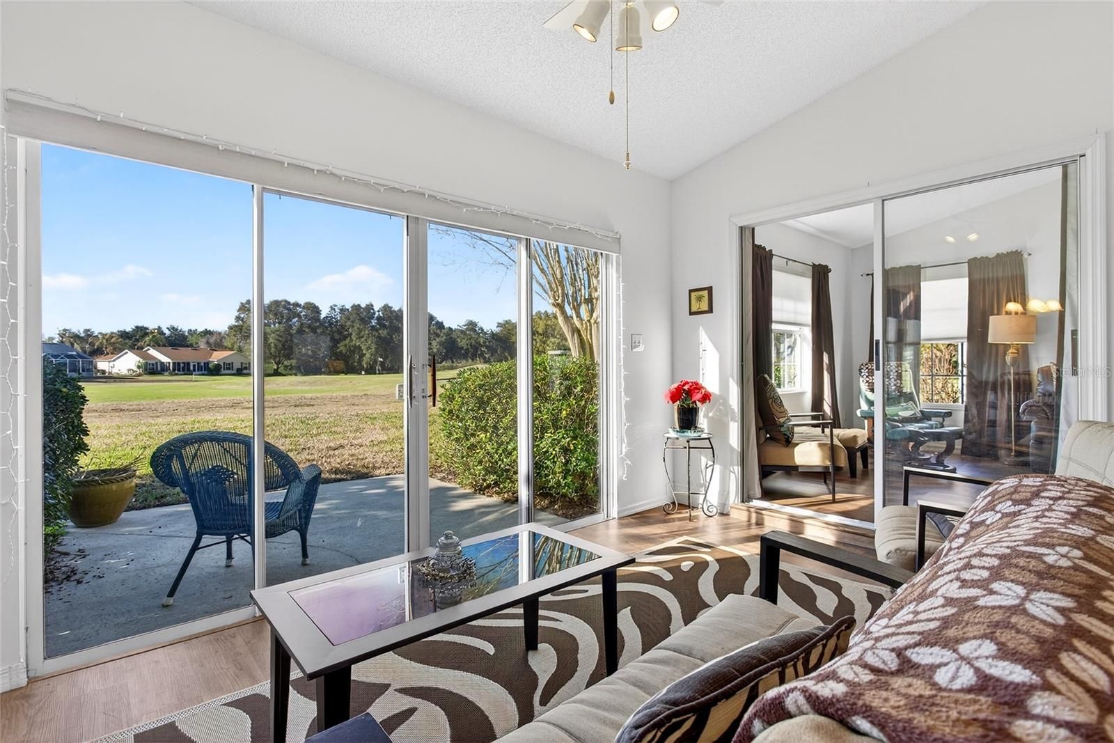This immaculate 3-bedroom, 2-bathroom home sits right on the 18th green of Otters Creek Golf Course in Plantation at Leesburg. Its split floor plan ensures privacy for both owners and guests, while the spacious open living and dining area, highlighted by a cathedral ceiling, creates a warm and inviting atmosphere. There's also a Florida room offering beautiful golf course views and easy access to the back patio through sliding glass doors. The layout provides a welcoming spot for gatherings with friends and family. Laminate flooring throughout except the bathrooms and indoor laundry. The kitchen features plentiful cabinets, a pantry, a new stainless-steel stove and refrigerator, and a large breakfast area nearby. The primary suite includes his and hers walk-in closets, dual vanities, a walk-in shower, and a garden tub. Combined with the extensive amenities available at Plantation at Leesburg, this home represents a fantastic opportunity that is sure to go quickly. Schedule a viewing today to experience this charming property firsthand. This 55+ gated community has amenities galore with 36 holes of golf, 3 recreation centers and pools, a softball field, tennis courts, numerous clubs and activities and a restaurant and pub. This home comes with a 13 MONTH HOME WARRANTY. The roof is 2016 and the A/C is 2021.