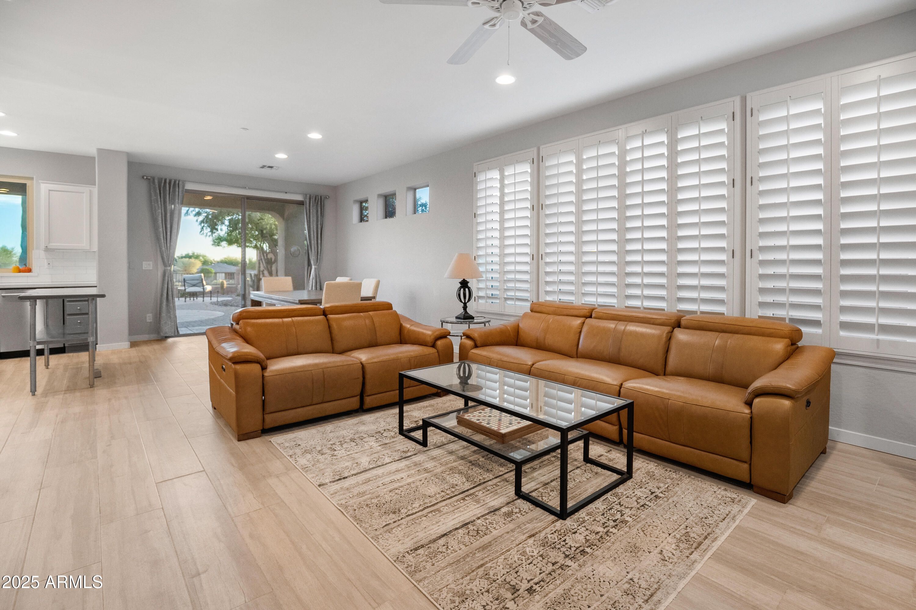 Wake up to sweeping Arizona skies from the extended master suite, where golf course views set the tone for your day. Sunlight streams through a kitchen skylight and newer windows into the flowing great room, anchored by a stacked stone wall and LED fireplace. The secondary bedroom's built-in Murphy bed makes hosting easy, while wood-look tile floors and plantation shutters give the home a calm, airy feel throughout. Outside, the backyard is a true retreat: heated spool, extended patio, and plenty of space to relax, entertain, or just enjoy sunsets under open skies. With a newer roof, HVAC, water systems, and attic insulation, the big stuff is done-this home is ready for life lived beautifully!