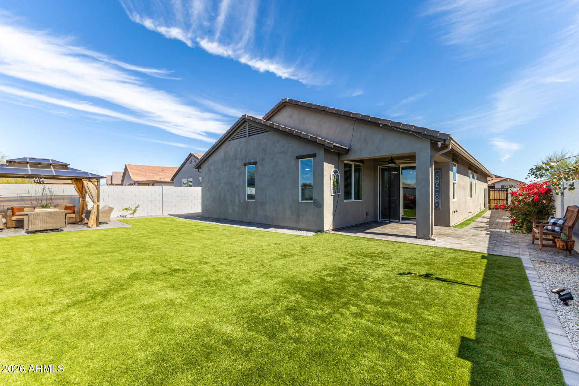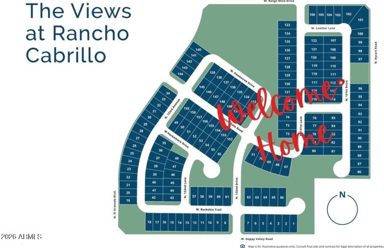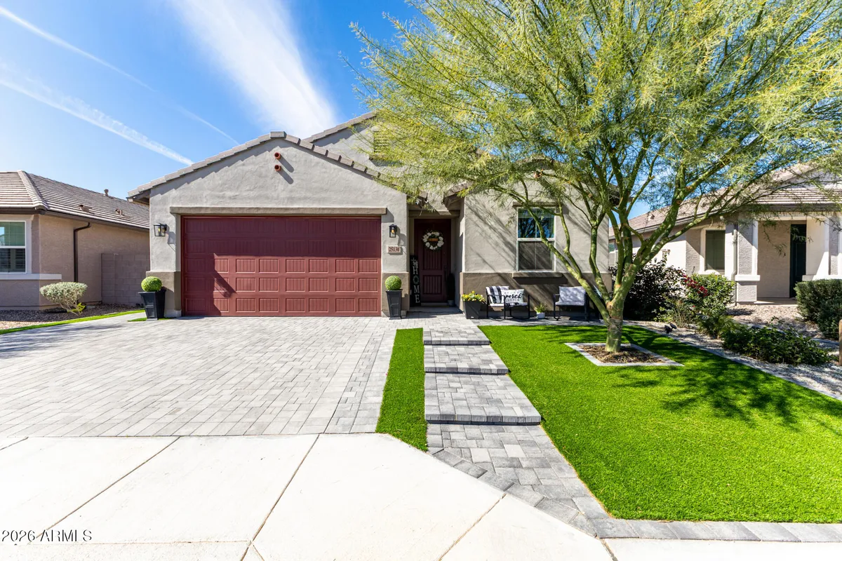 Welcome to this extensively upgraded Scott Communities home located in The Views at Rancho Cabrillo in North Peoria. This desirable Plan 3513 offers approximately 1,958 sq ft on an oversized premium lot with no backyard neighbors, beautiful open sky views, and mountain views from both the backyard and the primary bathroom. With over $70,000 in upgrades completed since June 2023, this home stands apart from typical builder properties and is truly move-in ready. The home features 4 bedrooms with all walk-in closets, 2.5 bathrooms, which one is a custom added half bathroom within the laundry room. The open-concept layout offers a large great room (approx. 17'4'' x 23'0'') flowing seamlessly into the kitchen and dining area, creating ideal space for entertaining. The kitchen has been upgraded with extended quartz countertops, a custom porcelain sink, and an upgraded brass faucet. Tahoe Maple Slate cabinetry has been enhanced with custom brass hardware throughout. The stainless gas appliance package, island seating, and pantry space complete the functional and modern kitchen design. Interior upgrades include custom lighting in the entrance hallway and dining room, and LED lighting throughout the entire home for energy efficiency and a clean modern feel. Oversized smart ceiling fans have been installed in the living room, primary suite, and patio, with additional smart fans installed in all remaining rooms. Custom blinds and blackout shades have been installed throughout. Interior paint has been refreshed. All interior door handles and hinges have been upgraded from chrome to black, creating a cohesive contemporary finish throughout the home. The main front door has also been upgraded with a smart lock system for added security and convenience. The laundry room has been fully customized and includes a newly added half bathroom. A Smart LG stacked washer and dryer set is included. The primary suite offers a spacious layout (approx. 14' x 12'8"), dual sinks, cultured marble finishes, upgraded low-wall shower configuration with 42" x 42" shower pan, slide-in garden tub, walk-in closet, and mountain views from the bathroom window. Structural upgrades include a 2' garage extension and an upgraded 8' garage door. The extended driveway accommodates up to 3 vehicles. The garage includes new LED lighting and a smart garage door system. The exterior has been professionally upgraded with approximately $25,000 invested in synthetic grass in both the front and backyard, pavers, decorative rock, plants, irrigation system (drip and sprinkler components), custom steps, and a pergola. There is no dirt backyard or unfinished desert landscaping. The yard includes mature bougainvillea, guava tree, pomegranate tree, miniature lime and orange trees, and a mini palm tree, creating a private outdoor retreat with no rear neighbors. Additional features include: - Post-tension slab construction - Energy Star efficiency - Dual-pane Low-E windows - R-38 ceiling insulation and R-19 wall insulation - 15 SEER high-efficiency A/C - 40-gallon gas water heater - Soft water loop - Structured media wiring with TV outlets in great room and primary bedroom - Smart thermostat - Upgraded exterior front porch lighting - Block-fenced rear yard - Paver driveway and walkway The home is located near a newly built approximately 5-acre community park featuring two dog parks, five pergolas, two playgrounds, a basketball court, and a large open turf area suitable for soccer or baseball, adding significant lifestyle value to the neighborhood. The property remains covered by a 10-year construction warranty along with a 10-year A/C warranty. Located near hiking trails, parks, Loop 303 access, and North Peoria amenities, this property offers privacy, smart upgrades, premium lot positioning, and outstanding community features. Move-in ready and extensively upgraded -- this home is ready for its next owner.