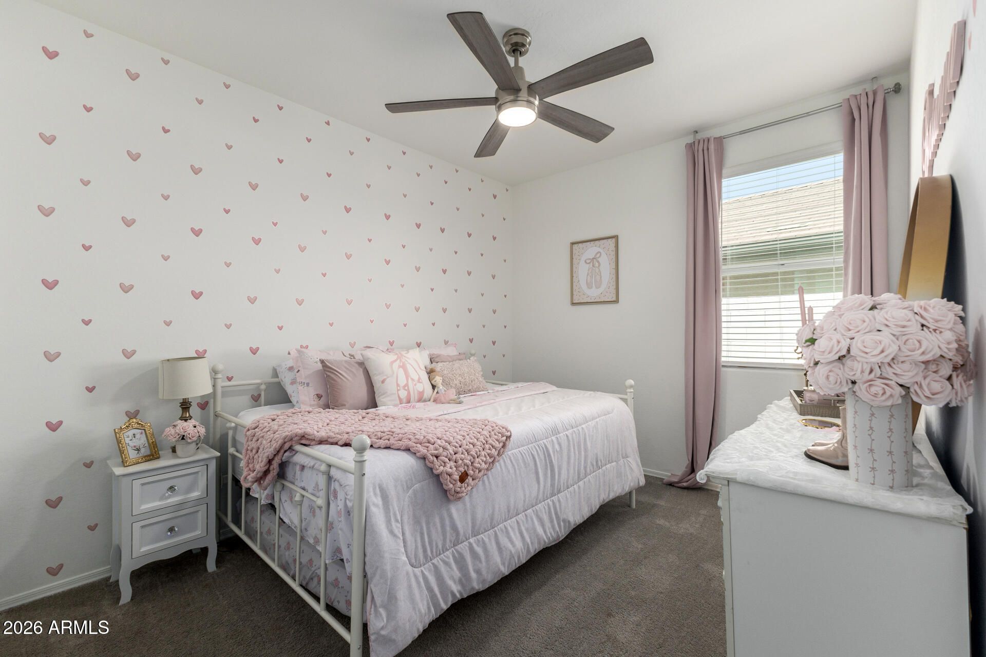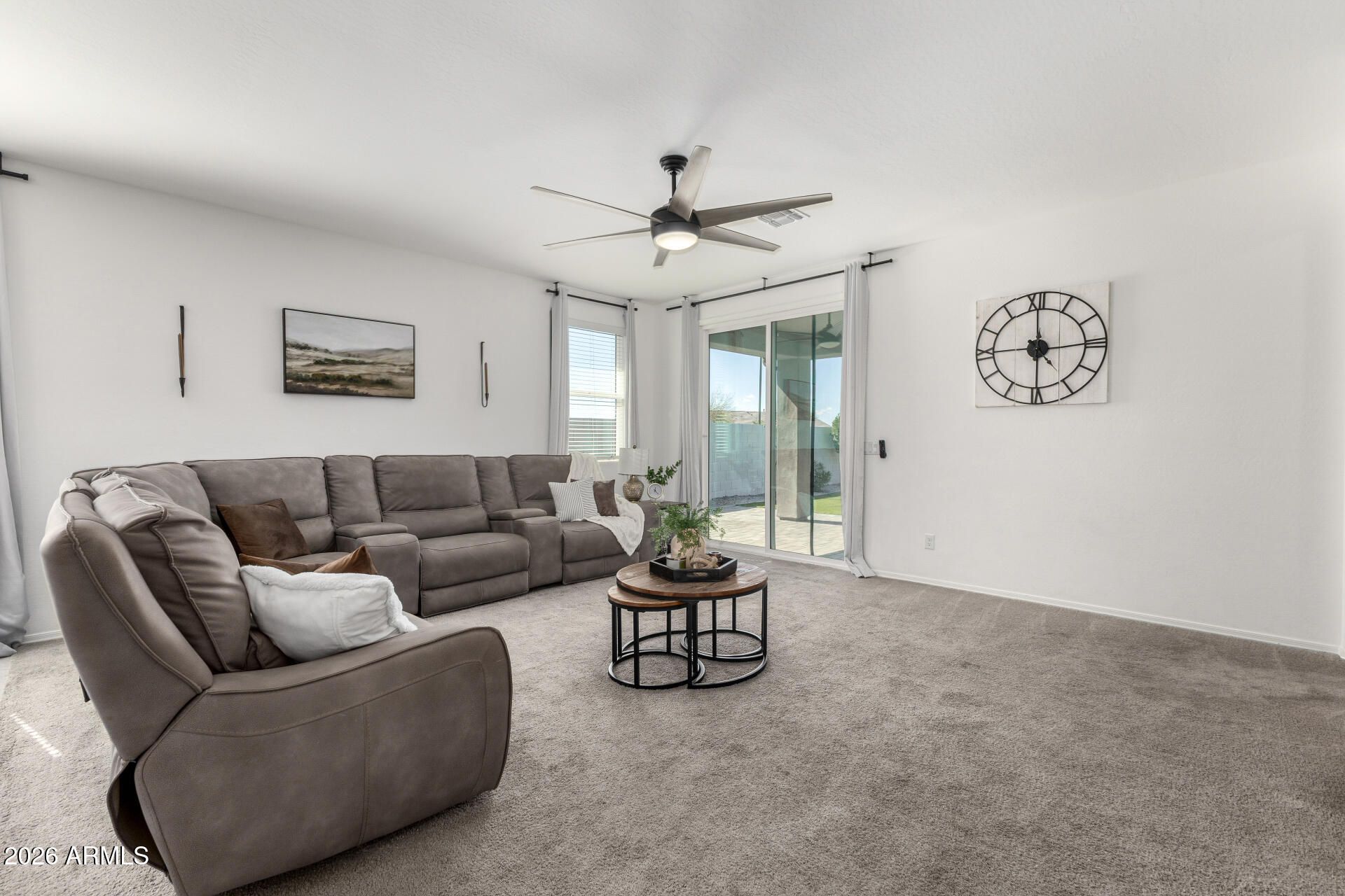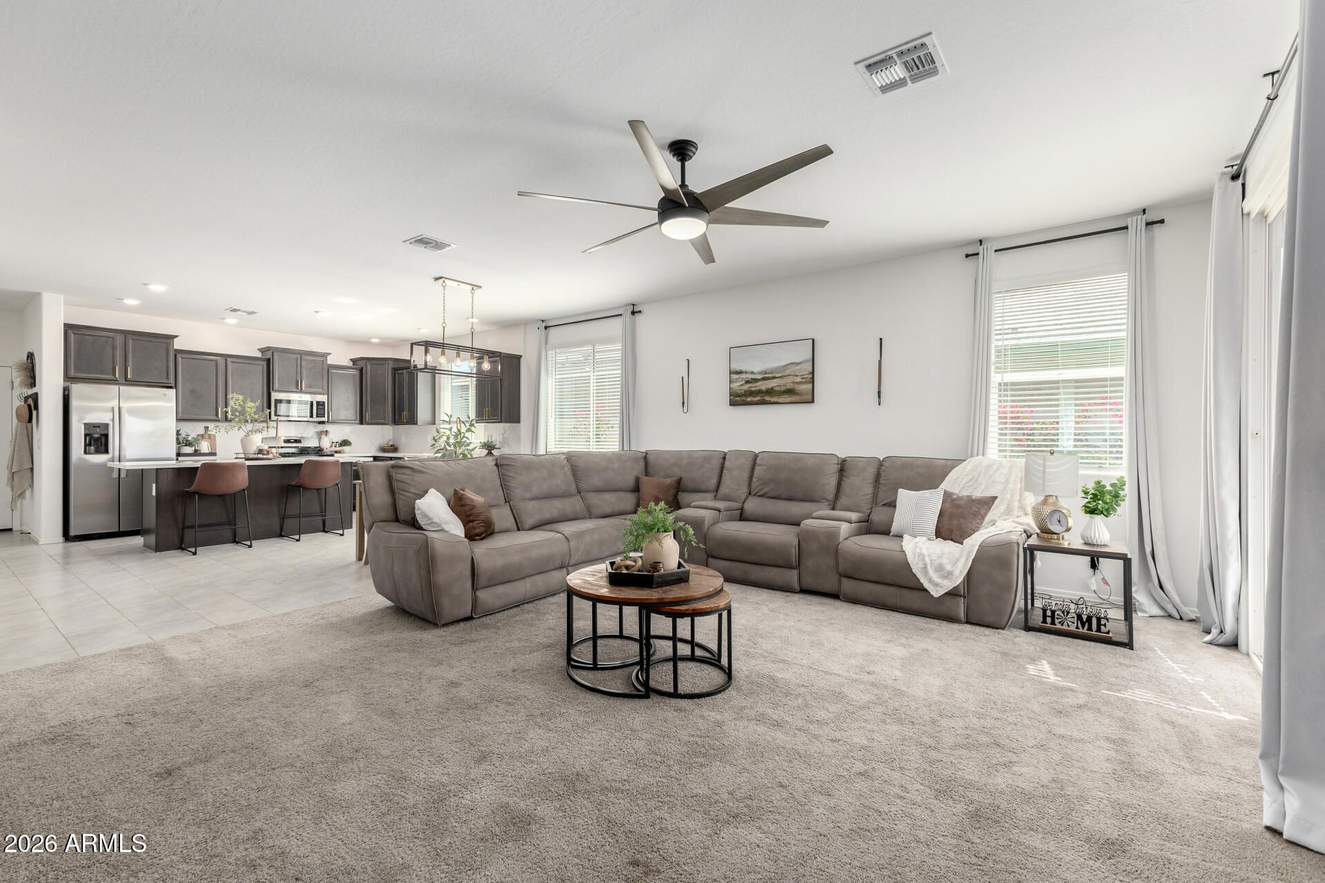 Welcome to this extensively upgraded Scott Communities home located in The Views at Rancho Cabrillo in North Peoria. This desirable Plan 3513 offers approximately 1,958 sq ft on an oversized premium lot with no backyard neighbors, beautiful open sky views, and mountain views from both the backyard and the primary bathroom. With over $70,000 in upgrades completed since June 2023, this home stands apart from typical builder properties and is truly move-in ready. The home features 4 bedrooms with all walk-in closets, 2.5 bathrooms, which one is a custom added half bathroom within the laundry room. The open-concept layout offers a large great room (approx. 17'4'' x 23'0'') flowing seamlessly into the kitchen and dining area, creating ideal space for entertaining. The kitchen has been upgraded with extended quartz countertops, a custom porcelain sink, and an upgraded brass faucet. Tahoe Maple Slate cabinetry has been enhanced with custom brass hardware throughout. The stainless gas appliance package, island seating, and pantry space complete the functional and modern kitchen design. Interior upgrades include custom lighting in the entrance hallway and dining room, and LED lighting throughout the entire home for energy efficiency and a clean modern feel. Oversized smart ceiling fans have been installed in the living room, primary suite, and patio, with additional smart fans installed in all remaining rooms. Custom blinds and blackout shades have been installed throughout. Interior paint has been refreshed. All interior door handles and hinges have been upgraded from chrome to black, creating a cohesive contemporary finish throughout the home. The main front door has also been upgraded with a smart lock system for added security and convenience. The laundry room has been fully customized and includes a newly added half bathroom. A Smart LG stacked washer and dryer set is included. The primary suite offers a spacious layout (approx. 14' x 12'8"), dual sinks, cultured marble finishes, upgraded low-wall shower configuration with 42" x 42" shower pan, slide-in garden tub, walk-in closet, and mountain views from the bathroom window. Structural upgrades include a 2' garage extension and an upgraded 8' garage door. The extended driveway accommodates up to 3 vehicles. The garage includes new LED lighting and a smart garage door system. The exterior has been professionally upgraded with approximately $25,000 invested in synthetic grass in both the front and backyard, pavers, decorative rock, plants, irrigation system (drip and sprinkler components), custom steps, and a pergola. There is no dirt backyard or unfinished desert landscaping. The yard includes mature bougainvillea, guava tree, pomegranate tree, miniature lime and orange trees, and a mini palm tree, creating a private outdoor retreat with no rear neighbors. Additional features include: - Post-tension slab construction - Energy Star efficiency - Dual-pane Low-E windows - R-38 ceiling insulation and R-19 wall insulation - 15 SEER high-efficiency A/C - 40-gallon gas water heater - Soft water loop - Structured media wiring with TV outlets in great room and primary bedroom - Smart thermostat - Upgraded exterior front porch lighting - Block-fenced rear yard - Paver driveway and walkway The home is located near a newly built approximately 5-acre community park featuring two dog parks, five pergolas, two playgrounds, a basketball court, and a large open turf area suitable for soccer or baseball, adding significant lifestyle value to the neighborhood. The property remains covered by a 10-year construction warranty along with a 10-year A/C warranty. Located near hiking trails, parks, Loop 303 access, and North Peoria amenities, this property offers privacy, smart upgrades, premium lot positioning, and outstanding community features. Move-in ready and extensively upgraded -- this home is ready for its next owner.