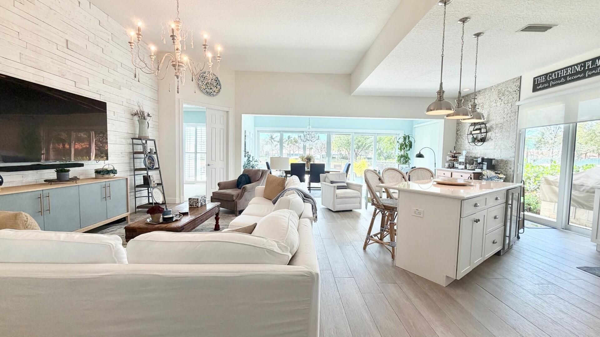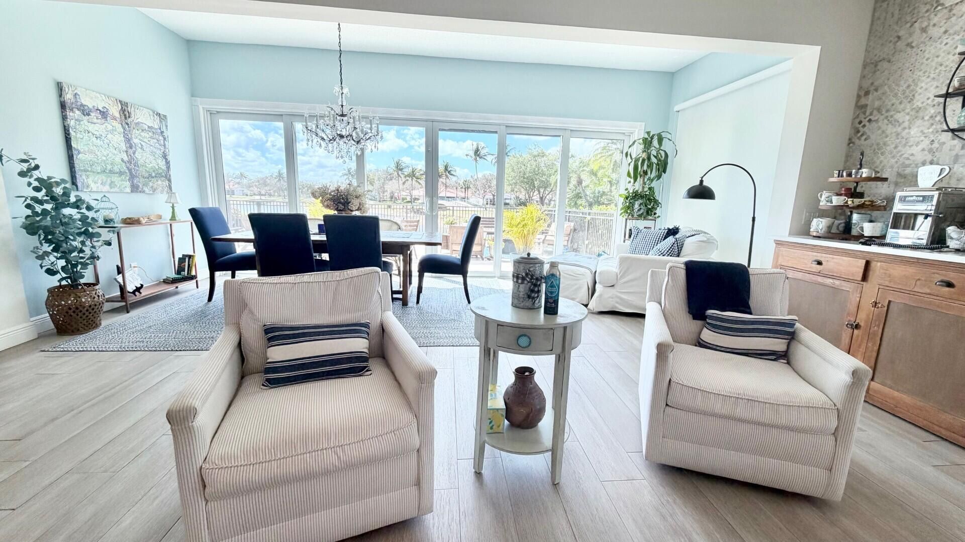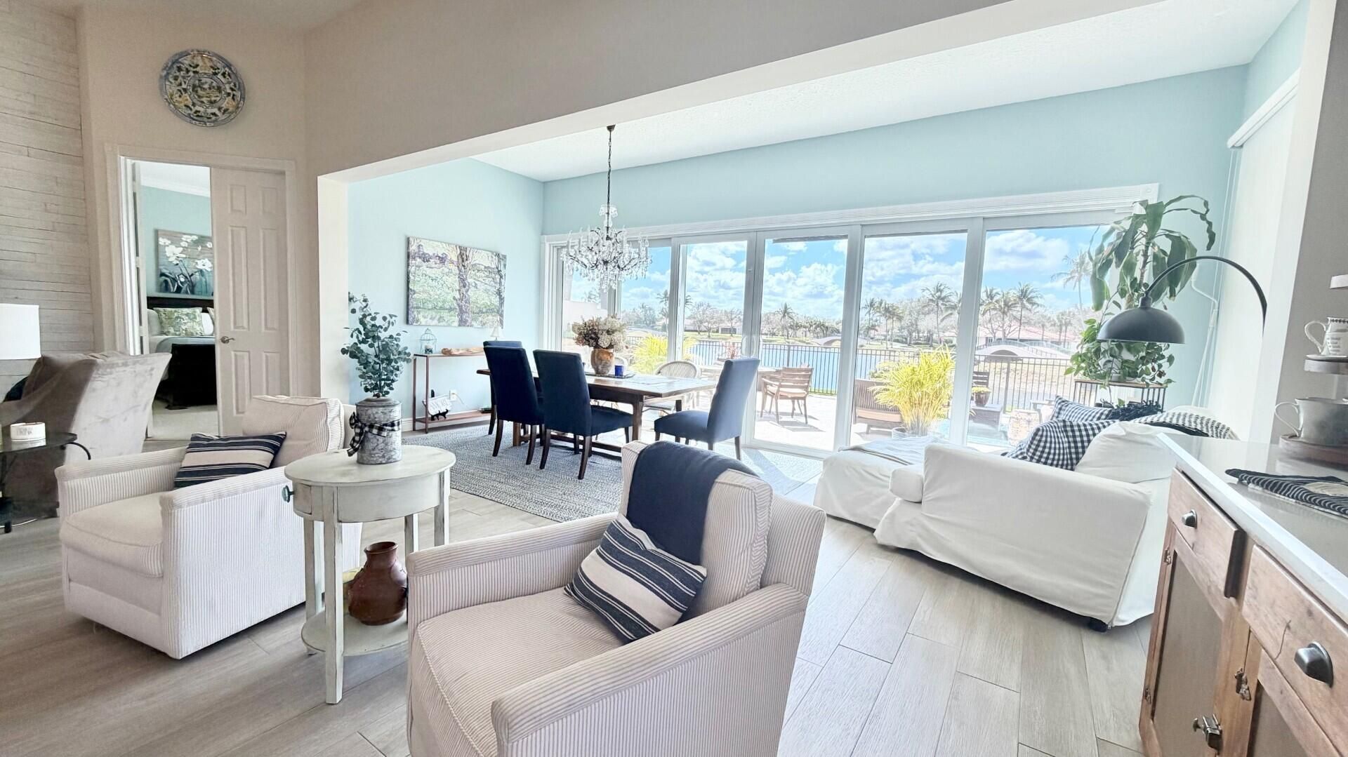 This stunningly renovated home offers modern luxury and peace of mind w/extensive high-end upgrades. The exterior is anchored by a new roof and AC system, complemented by new impact-resistant, fully insulated windows for maximum efficiency and security. Inside new porcelain flooring flows through the main living areas, accented by elegant plantation shutters throughout. The heart of the home is a designer kitchen featuring new appliances, an advanced induction oven & a dedicated coffee bar. The layout includes three fully renovated separate bathrooms, each finished with contemporary fixtures. The living space extends outdoors to a lakeside oasis. This exterior retreat features a full outdoor kitchen and a lakeside patio equipped with two automatic awnings. For seamless indoor-outdoor living, the lakeside sliders are fitted with automatic screens, all overlooking an incredible unobstructed water view. We have saved a few surprises that we will tell you about when we see you. Call us now! The heart of this unique residential community is its waterfront Town Center where you can grab lunch or dinner at the on-site "Centanni" Italian restaurant; enjoy the tennis and pickle ball experience on the eight Har-tru lighted courts with on-site tennis instructor and active tennis program. Take a swim in one of the three heated pools, fish from one of the many picturesque bridges; stop by the library, play ping pong or pool. Also located in the Town Center is the full service Illustrated Properties real estate office, beauty salon, mail facility and children's playground. Enjoy 12 miles of scenic pedestrian pathways, take a bike ride or enjoy a vigorous work out in the renovated fitness center or play bocce - all for the exclusive use of River Walk residents! Yoga, mahjong, bridge, aqua aerobics, foreign language classes, crafts and more are some of the other fun activities offered! River Walk offers luxury resort-style living, without extravagant ''country club'' fees! Conveniently located near the turnpike, Palm Beach International Airport, the Outlet Malls, Kravis Center, Downtown, and Palm Beach Island.