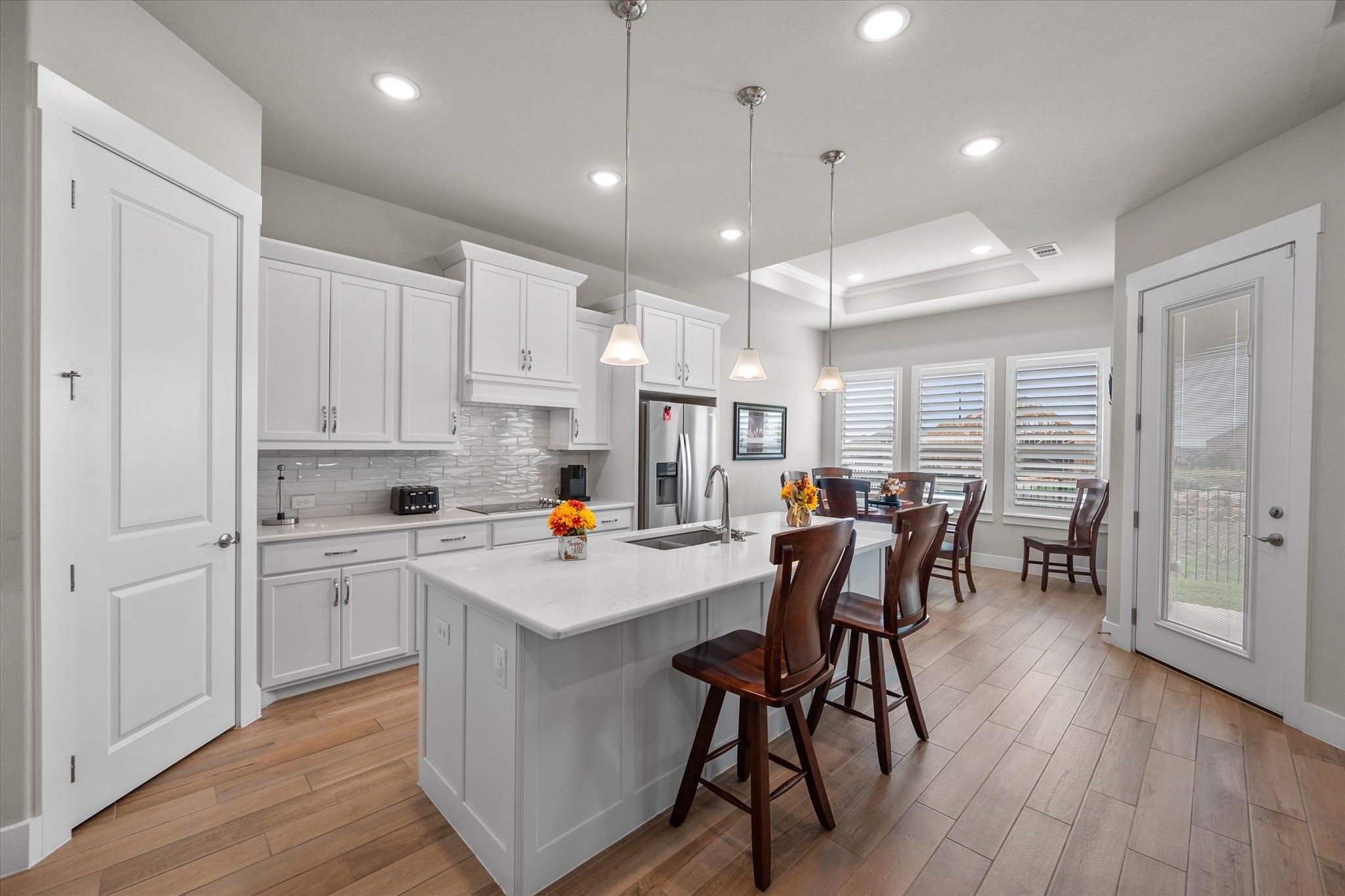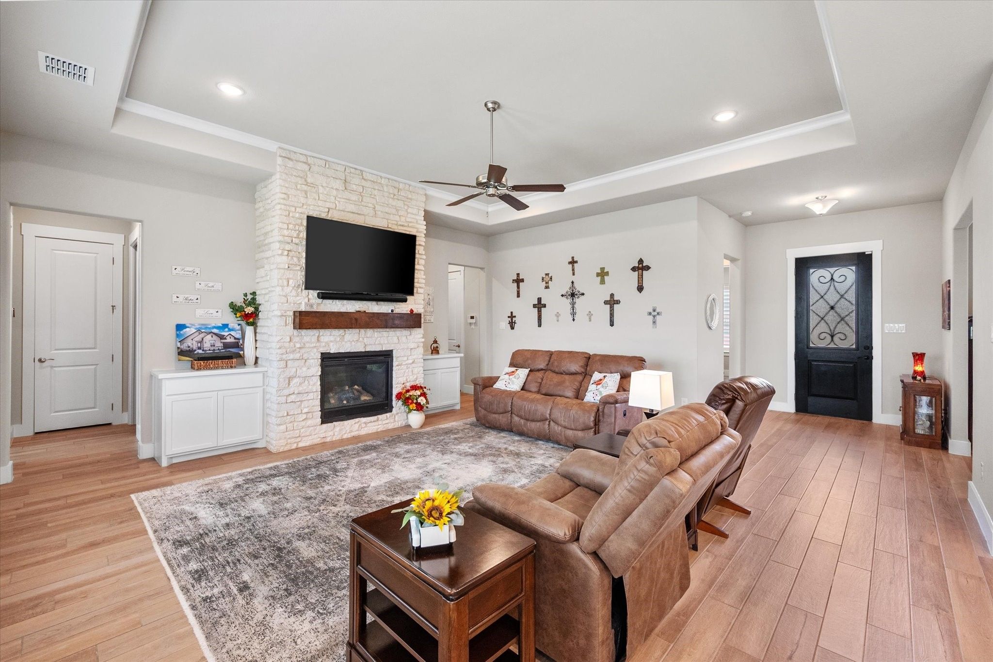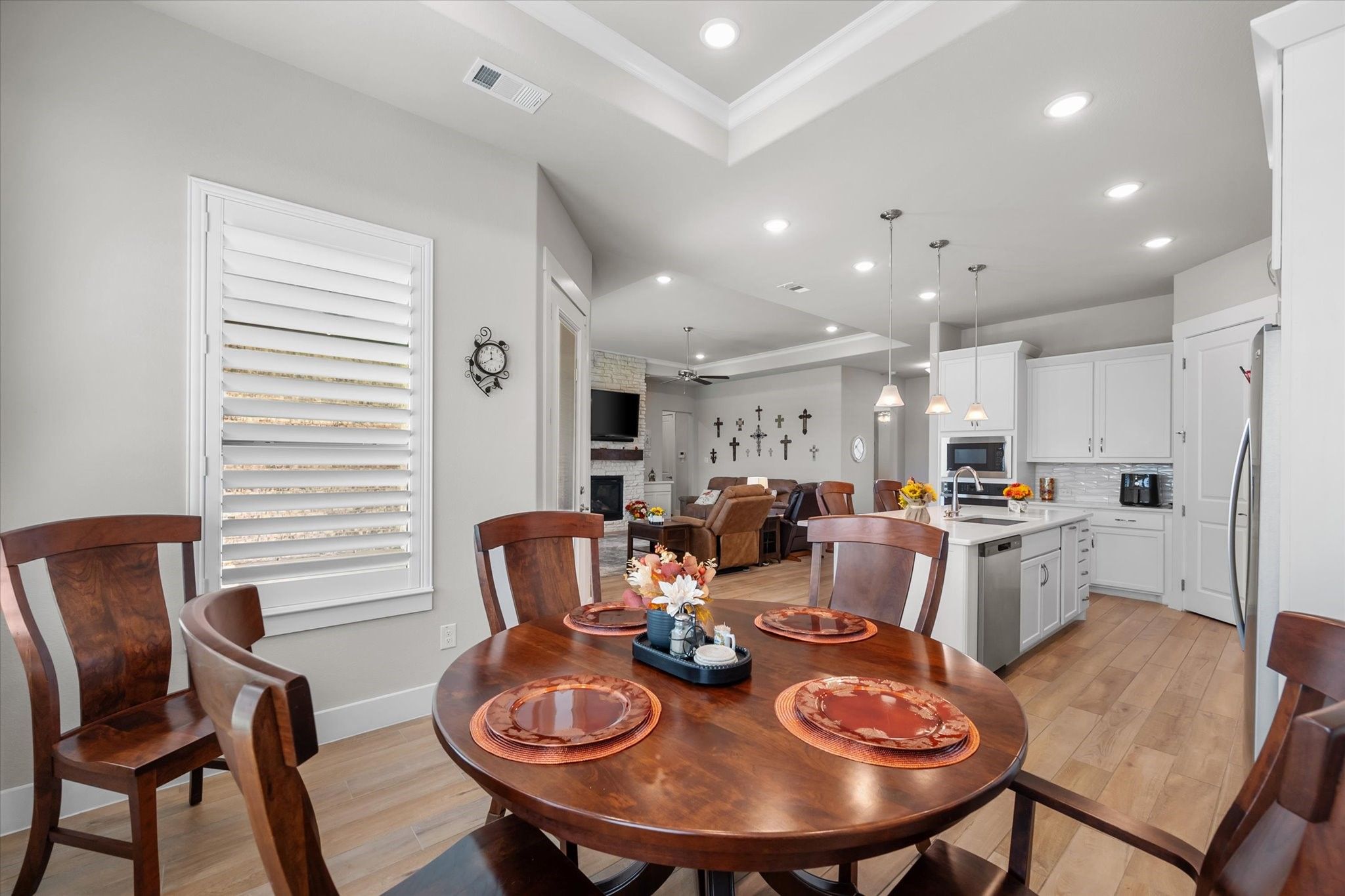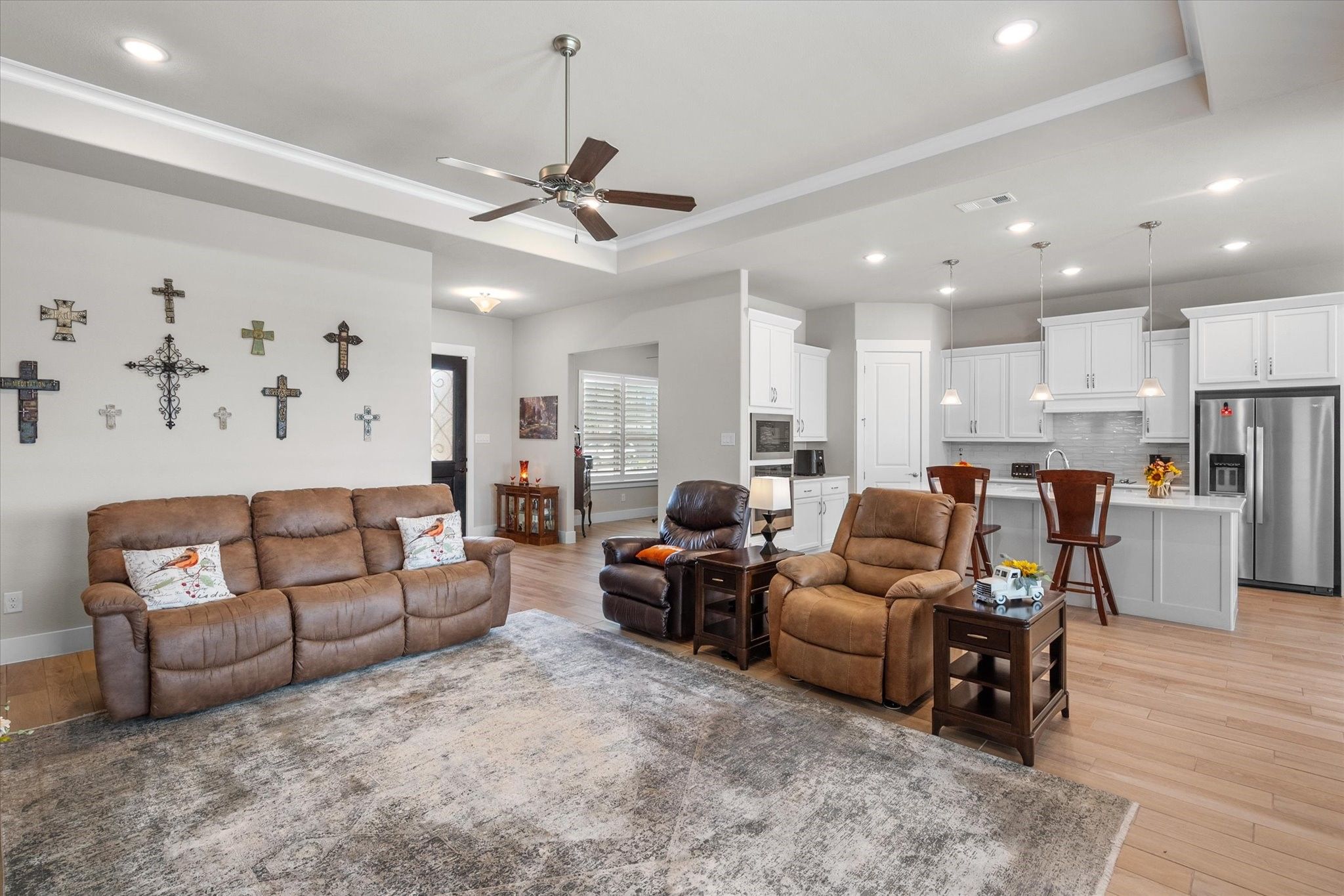 Finished dream home in a brand-new neighborhood — with nearly $60,000 in upgrades that a new buyer at Ladera would have to pay a premium for. Compare these upgrades to a new build. See Transaction desk for upgrade details. More value for your money, and no builder wait time. Enjoy the convenience and ease of an active adult lock-and-leave lifestyle. Ladera is ideally located just minutes from Joe Pool Lake and both Hwy 360 & 287. Residents enjoy an impressive list of amenities: pickleball courts, resort-style pool, fitness center, indoor & outdoor gathering areas, firepit, outdoor fireplace, putting green, walking trails, “The Hub” for social events, and “The Shack” for smaller gatherings with poker & ping pong tables, dartboard, and more. COA dues even include Spectrum internet and TV service. The Avanti floor plan offers an open layout perfect for hosting friends & family. The beautiful kitchen features a quartz island with breakfast bar, a large walk-in pantry, and stainless appliances — opening to the spacious living area with tray ceilings, gas-log fireplace, and dining space. The oversized primary suite offers a spa-like bath with walk-in shower, his & her sinks, linen closet, and generous walk-in closet. A second bedroom makes the perfect guest suite, while the flex room can serve as a cozy den or media room. Bonus: All three large-screen TVs stay with the home, making it truly move-in ready. All information deemed reliable but not guaranteed; buyer to verify.