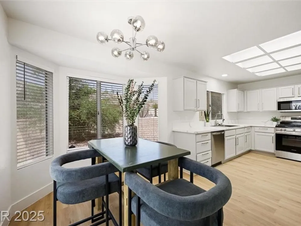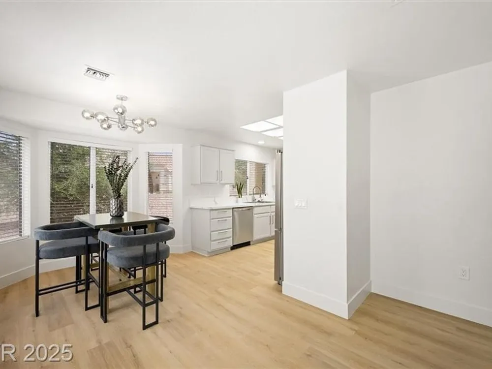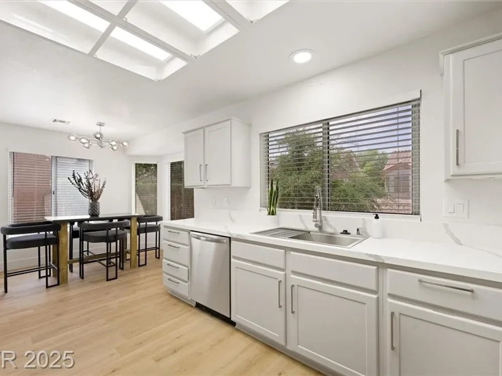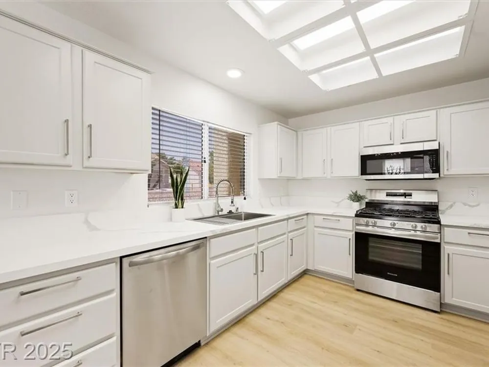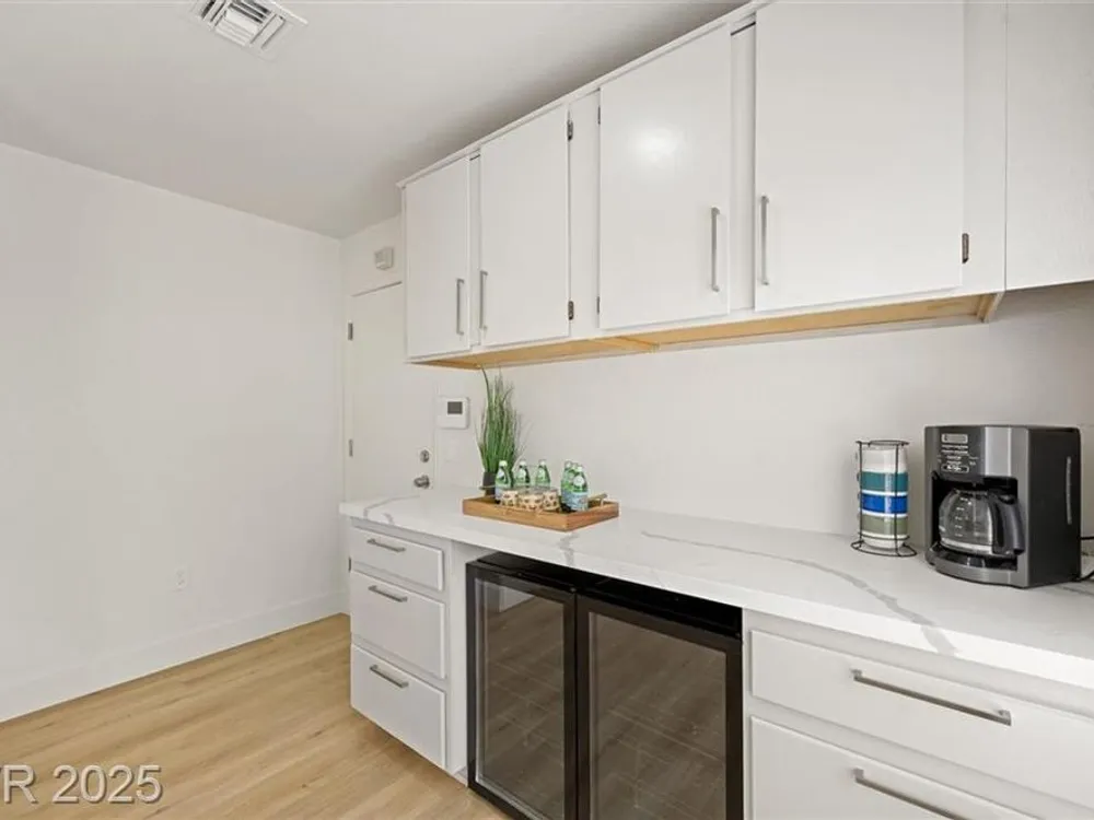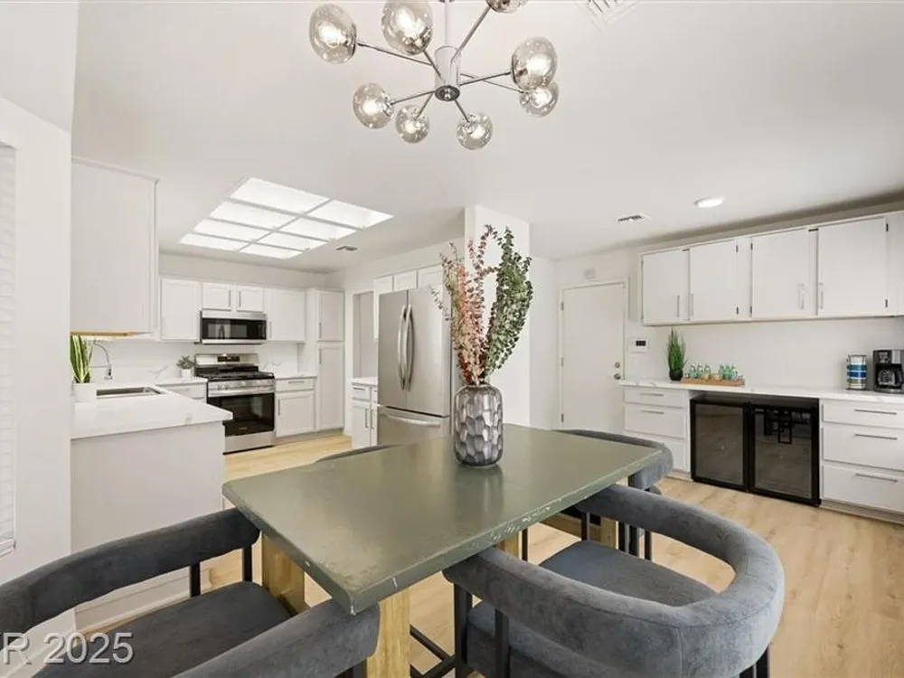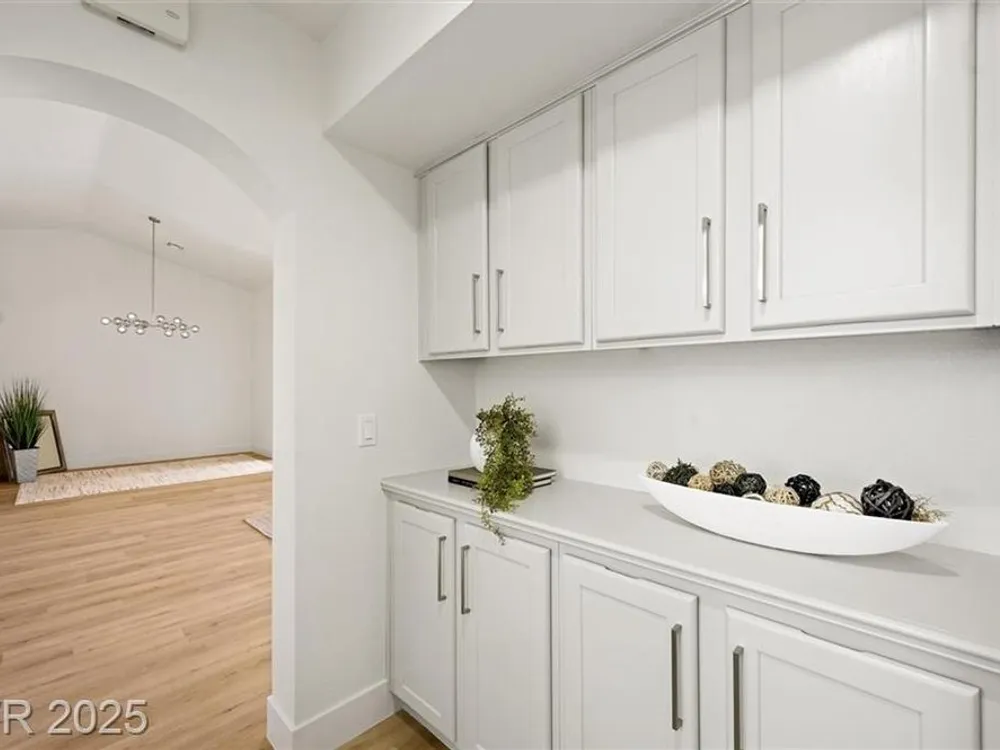 Step into luxury in this beautifully remodeled 2Bd, 2Ba home located in the highly sought-after Sun City Summerlin community. Every inch of this home has been thoughtfully upgraded, offering the perfect blend of modern elegance and comfortable living. Fresh alabaster paint and new baseboards provide a crisp, clean look throughout, while luxury vinyl plank flooring flows seamlessly from room to room, adding both beauty and durability. The heart of the home is a show-stopping kitchen featuring chic greige cabinets, Carerra quartz countertops, and a spacious bar area complete with a wine fridge—perfect for entertaining. You'll love the single-basin stainless steel sink, stainless steel appliances, and abundant storage space. Or Retreat to the spacious bedrooms with updated bathrooms. Whether you’re relaxing at home or enjoying the vibrant lifestyle of Sun City, this home offers the perfect balance of peace and convenience.
