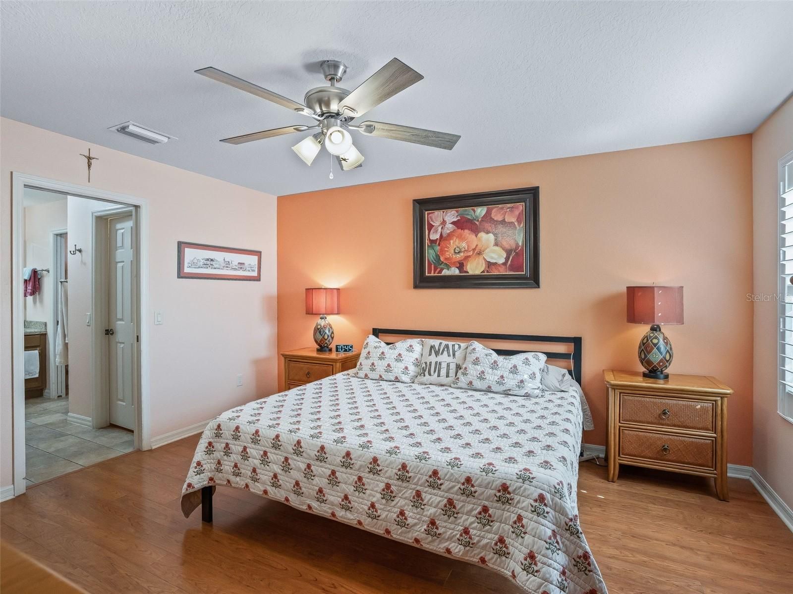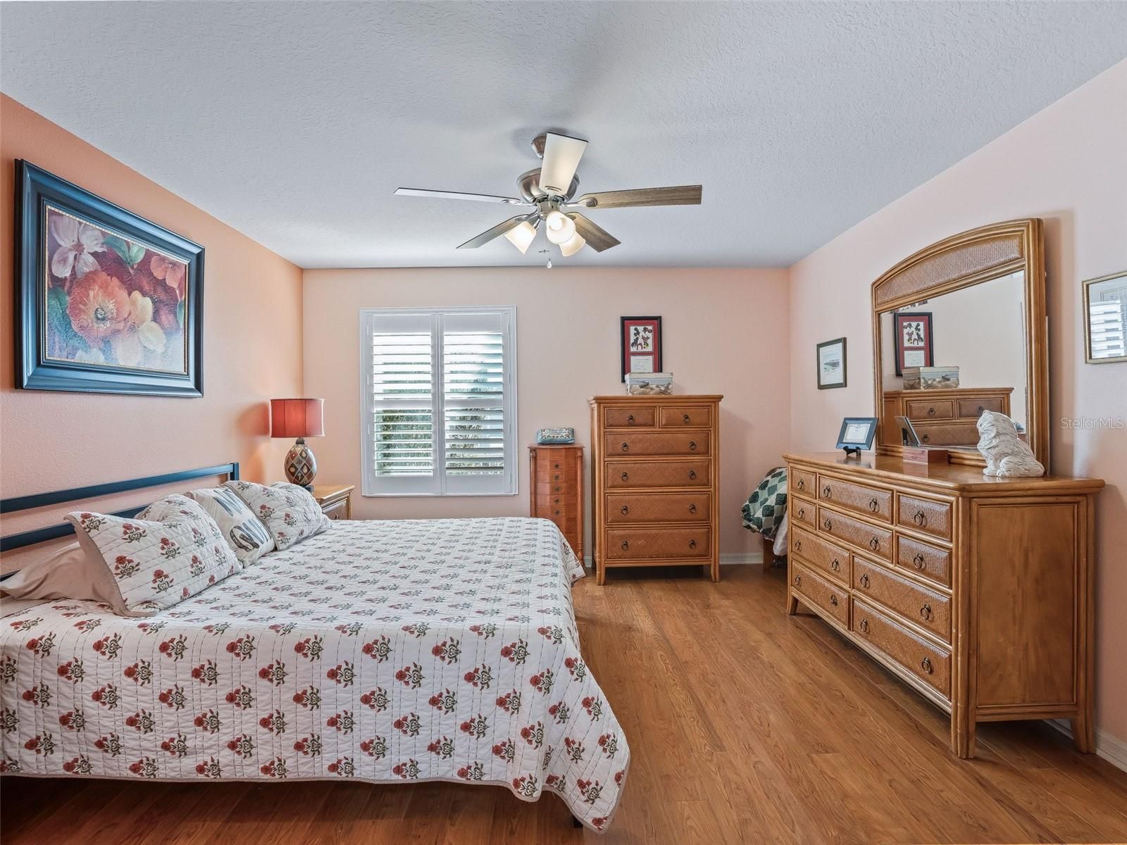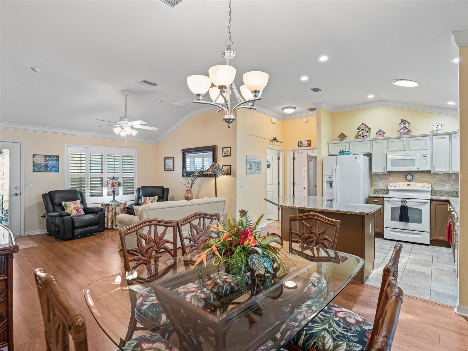 - Attic Ventilator, Cathedral Ceiling(s), Ceiling Fan(s), Eat-in Kitchen, Open Floorplan, Main Level Primary, Solid Surface Counters, Split Bedrooms, Thermostat, Vaulted Ceiling(s), Walk-In Closet(s), Window Treatments