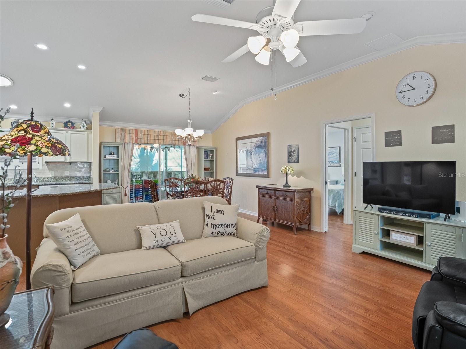 Welcome to this beautifully upgraded Bouganvillea model located in the highly desirable Village of Hadley in The Villages—where convenience, comfort, and style come together seamlessly. Even better, the BOND IS COMPLETELY PAID plus BEING SOLD FURNISHED, offering added value and peace of mind from day one. From the moment you arrive, you’ll notice the exceptional curb appeal, highlighted by professionally designed curbed landscaping, mature plantings, and a charming screened front porch—the perfect spot for morning coffee or evening breezes. Step inside to discover a thoughtfully enhanced interior featuring wood flooring, solar tubes for natural light, and a flowing floor plan with split bedrooms designed for easy living and entertaining. The kitchen shines with solid-surface granite countertops, pull-out shelving, and a full suite of newer, well-maintained appliances, making meal prep both functional and enjoyable. The home is being offered fully furnished, allowing you to move right in and start enjoying The Villages lifestyle immediately. Enjoy Florida living year-round in the screened lanai with tile flooring, plus a conditioned glass-enclosed covered porch (not included in the total square footage) that provides additional flexible living space. The garage is equally impressive with extra shelving, a utility sink, painted floors, insulated garage door, attic fan, and even a stand-up freezer that conveys. Additional upgrades include landscape security sensor lighting, extra closet storage in bedrooms, and a roof that’s only 5 years old—all contributing to a home that has been meticulously maintained and thoughtfully improved. Ideally situated between Lake Sumter Landing and Brownwood Paddock Square, this location offers quick access to shopping, dining, grocery stores, and medical facilities along CR 466 and CR 466A. You’re just minutes to Odell Recreation Center, Hadley Pool, Havana Country Club, Mallory Hill Country Club, and an abundance of neighborhood pools, pickleball courts, and recreation centers—all easily accessible by golf cart. This home truly offers the perfect balance of upgrades, thoughtful design, and an unbeatable central location. Please watch our WALK-THROUGH VIDEO of this fantastic home and call today to schedule your private showing and to see our personal property website—this one is a must-see! ROOF (2021) HVAC (2021)