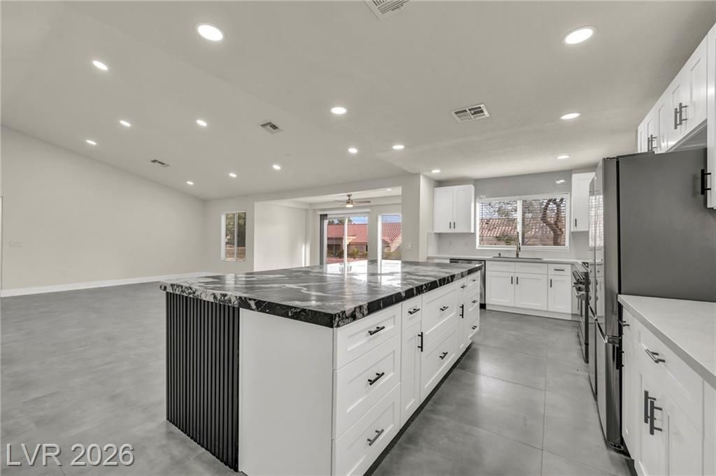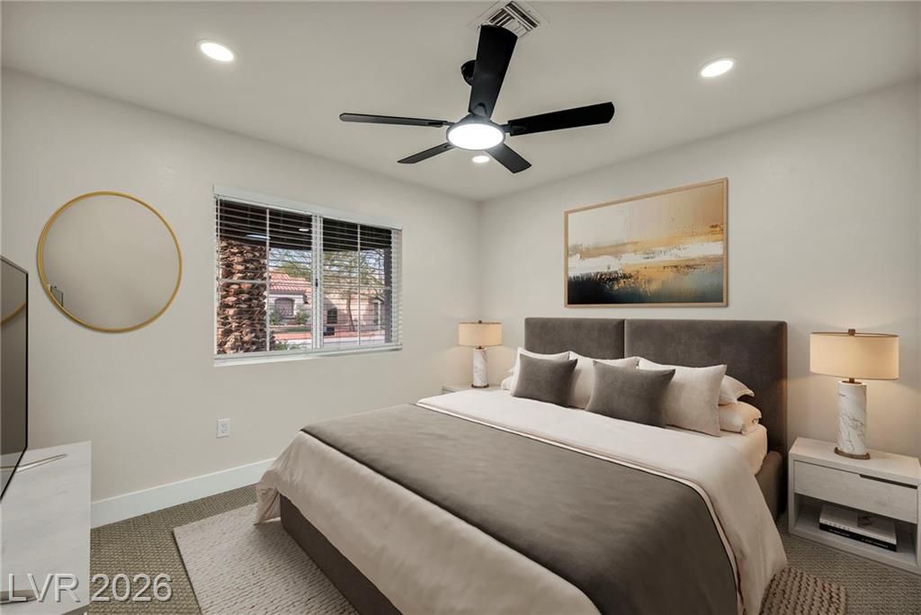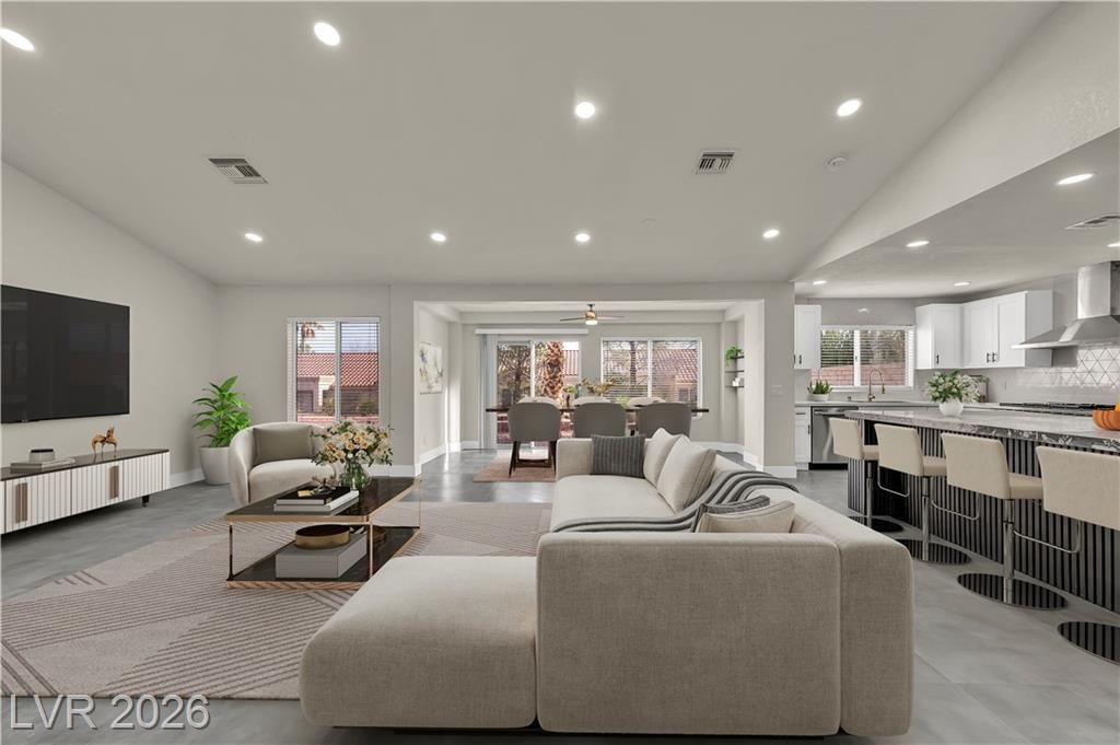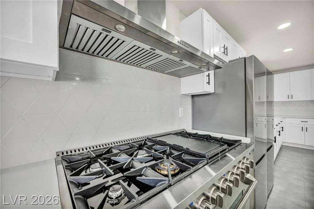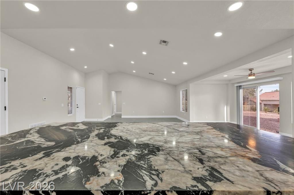 Welcome to Sun City Summerlin, This one-of-a-kind, top-of-the-line, fully upgraded home showcases luxury living at its finest. The designer open-concept floor plan centers around a stunning Italian extra-large marble island in a top-of-the-line gourmet kitchen featuring brand-new stainless steel appliances, oversized refrigerator, dishwasher, and a premium dual-fuel slide-in range with a gas cooktop and electric convection oven. An extra-large single-bowl sink with a drying area, gas hood, abundant custom cabinetry, High vaulted ceilings, recessed lighting throughout, luxury high baseboards, premium carpeting in bedrooms, ceiling fans, and generous walk-in closets, extra-large walk-in showers and dual vanities.Tankless water heater, screen door, finished garage flooring, and a brand-new, top-of-the-line oversized washer and dryer. Thoughtfully designed, fully renovated, and truly move-in ready — this luxury home stands in a class of its own. This house looks even better in person!