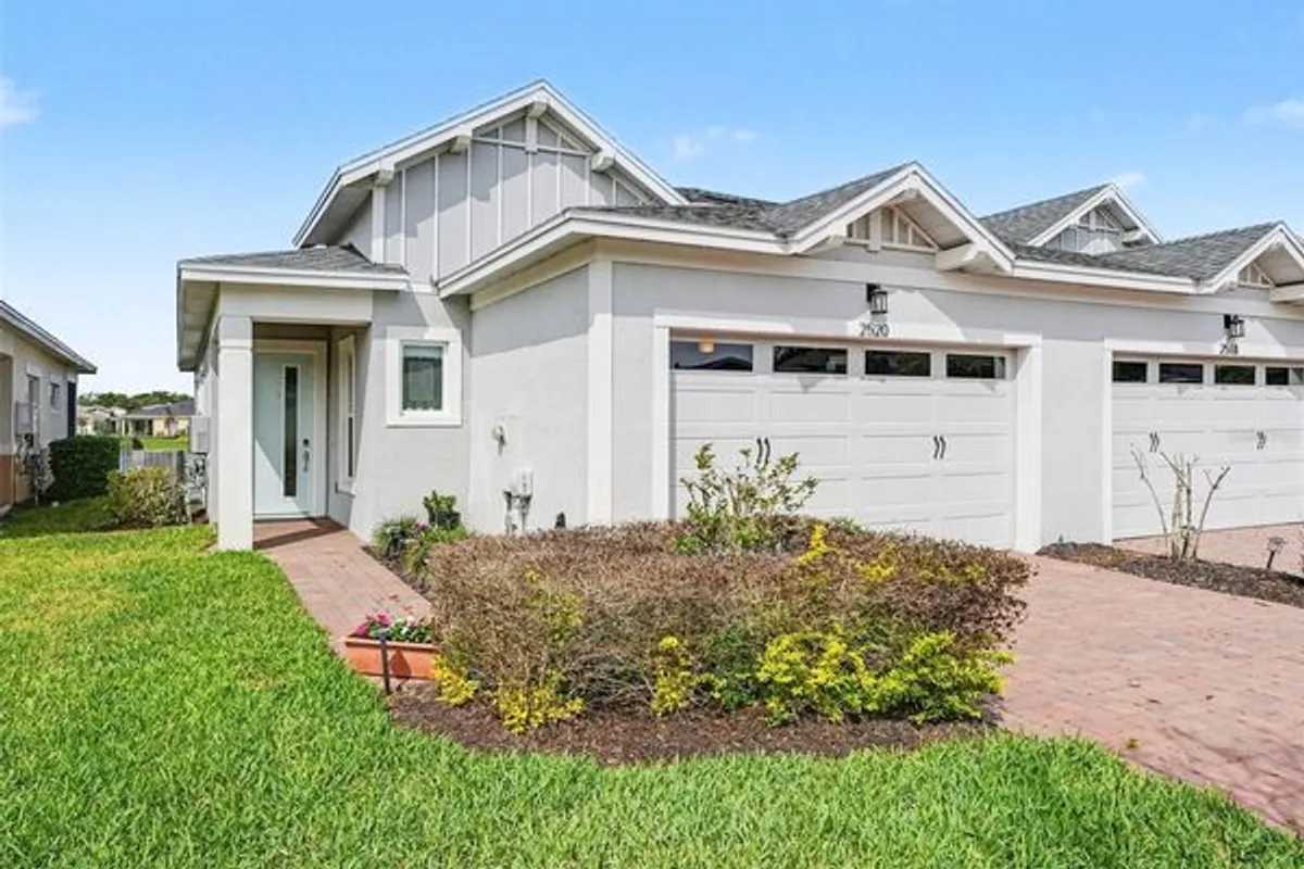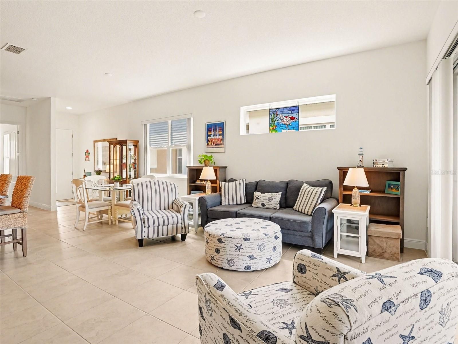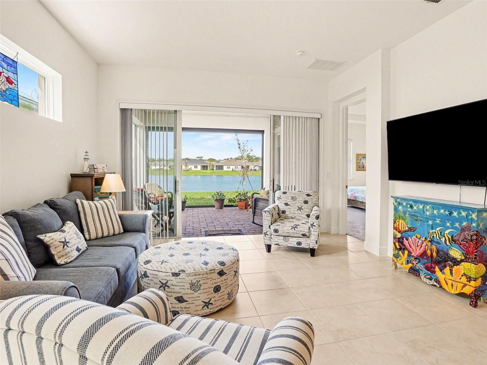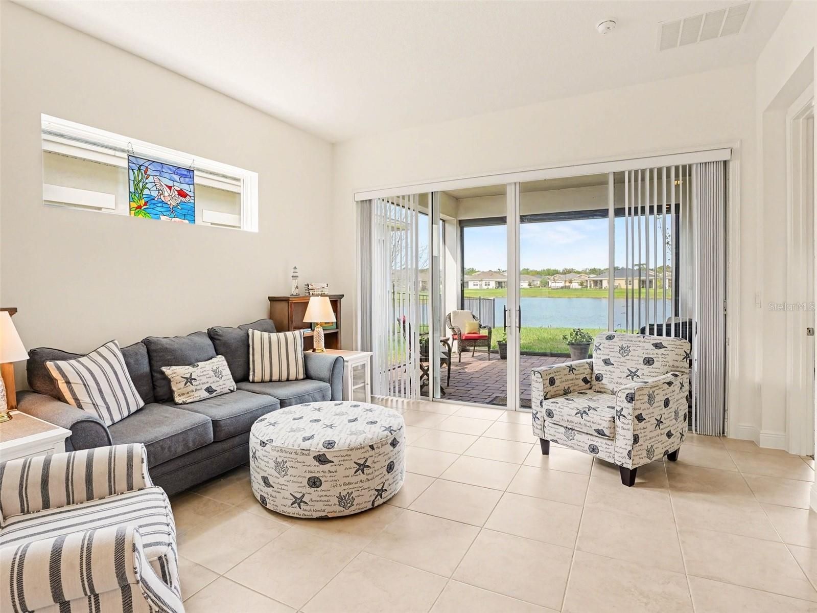 Rare WATERFRONT HOME OPPORTUNITY with gorgeous Florida SUNSET VIEWS from nearly every room in your home! The enchantment begins when you step in the front door and the relaxing WATERFRONT VIEWS sweep you away! Welcome to this meticulously cared for 2 bed/2 bath villa located in the highly desirable 55+ gated community of TWIN LAKES. The HOA is responsible for the complete care and maintenance of the EXTERIOR and ROOF. Expect to be impressed by the light, open floor plan, neutral tile floors and 10FT HIGH CEILINGS with recessed lighting. Double slider doors open to the WATERFRONT SCREENED PORCH with attached pull down SUNSHADE. The gourmet kitchen features GRANITE countertops, an ISLAND WITH SINK, STAINLESS STEEL appliances, built in phone charging station, 52" wood cabinetry with tons of storage and a convenient WALK-IN PANTRY. This home is builder PREWIRED for the ethernet. The spacious primary bedroom offers WATER VIEWS, TRAY CEILING, WALK-IN CLOSET and an expansive bathroom and shower with two-sink vanity. Both bathrooms feature shower GRIP-ACCESSIBLE BARS. The SPLIT PLAN second bedroom located the front of the home could double as a private HOME OFFICE. The full-sized LAUNDRY ROOM has storage space galore, a full sink and WASHER/DRYER. ALL APPLIANCES STAY! The 1.5 garage offers a full parking space plus GOLF CART PARKING or EXTRA STORAGE. The community of TWIN LAKES offers a huge variety of AMENITIES from A to Z! You can immerse yourself in activities and social events offered by the full-time Activities Director or bask in the Florida sun at one of the (3) beautiful lakefront pools. The clubhouse is an impressive sprawling 20,000 sq ft of resort style luxuries to include flex spaces, bar with food service, state of the art fitness center, sauna, billiards, poker/gaming, arts & crafts, dance, yoga and fitness classes. Sport courts include tennis, bocce and pickle ball. Enjoy fishing, boating and kayaking from the LAKEFRONT PIER! Venture out on LIVE OAK LAKE in a community Jon or Pontoon boat. Got a green thumb? Enjoy tending to your parcel of the COMMUNITY GARDEN. Time to explore and enhance your Florida living experience at TWIN LAKES. Hurry on in and discover your carefree, restful and rejuvenating OASIS!