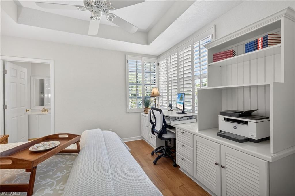 RARELY available, upstairs END condo residence "Windsor" floor plan featuring 3 bedrooms and 3 full baths with the TWO car attached garage. Wonderful location next to the Pelican Nest Clubhouse, nestled amid natural surroundings with private tree top views and beautifully upgraded with Plantation Shutters, wood moldings, custom built-ins in the third bedroom, window seat with storage in second bedroom and electric shutters on the lanai. Pelican Landing Amenities Include- Private Island Beach Park with Ferry Service from community marina, Kayaking/Canoeing, Sailing, Tennis Center, Pickleball, Bocce, Fitness Center & Active Community Calendar. Two optional Private Golf Clubs within the Community.
