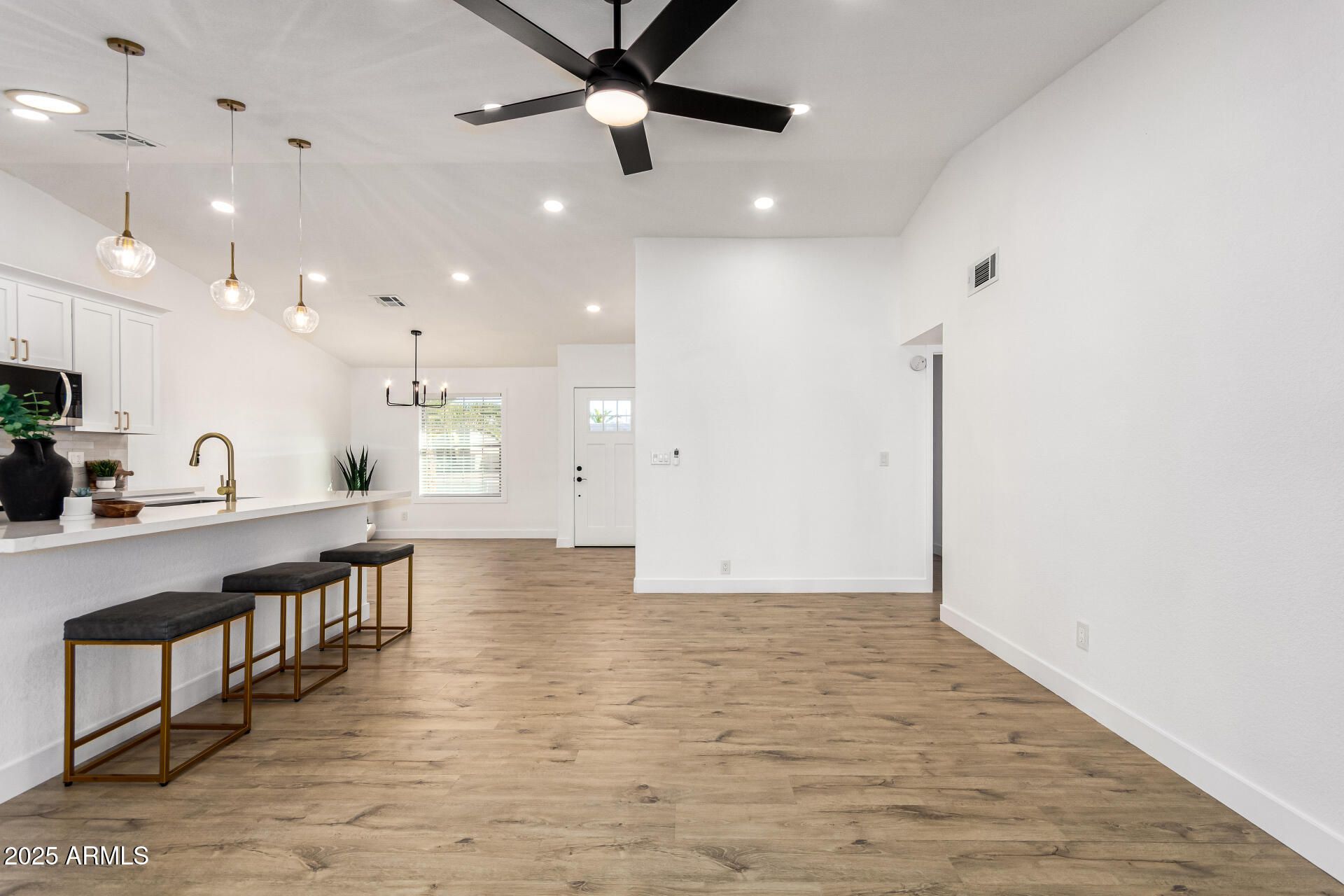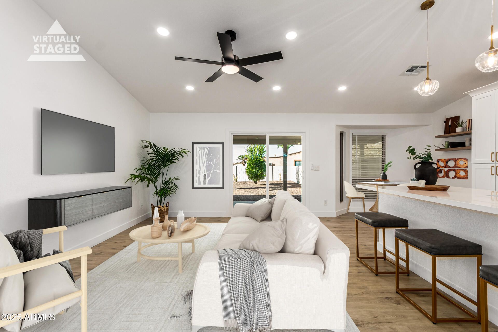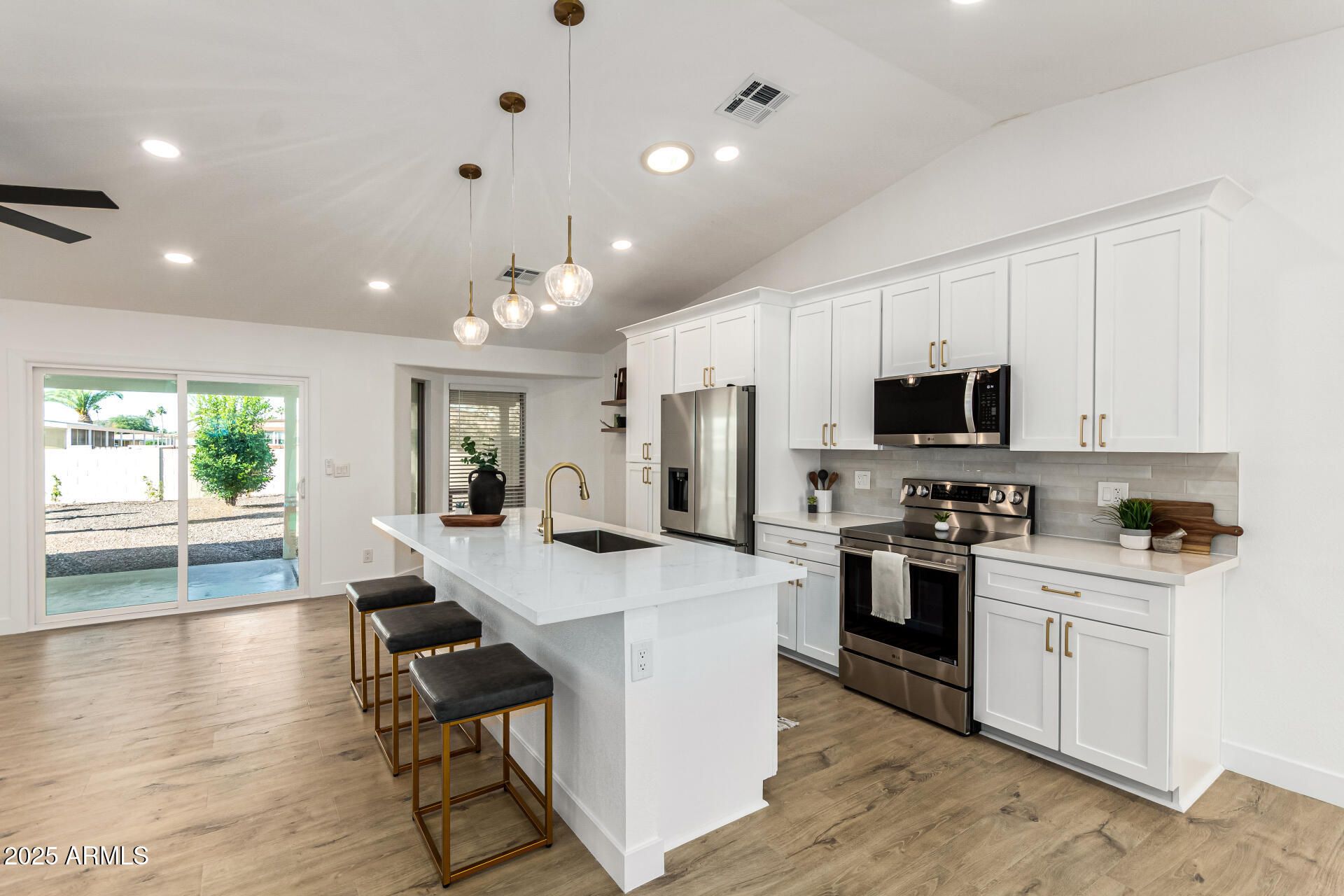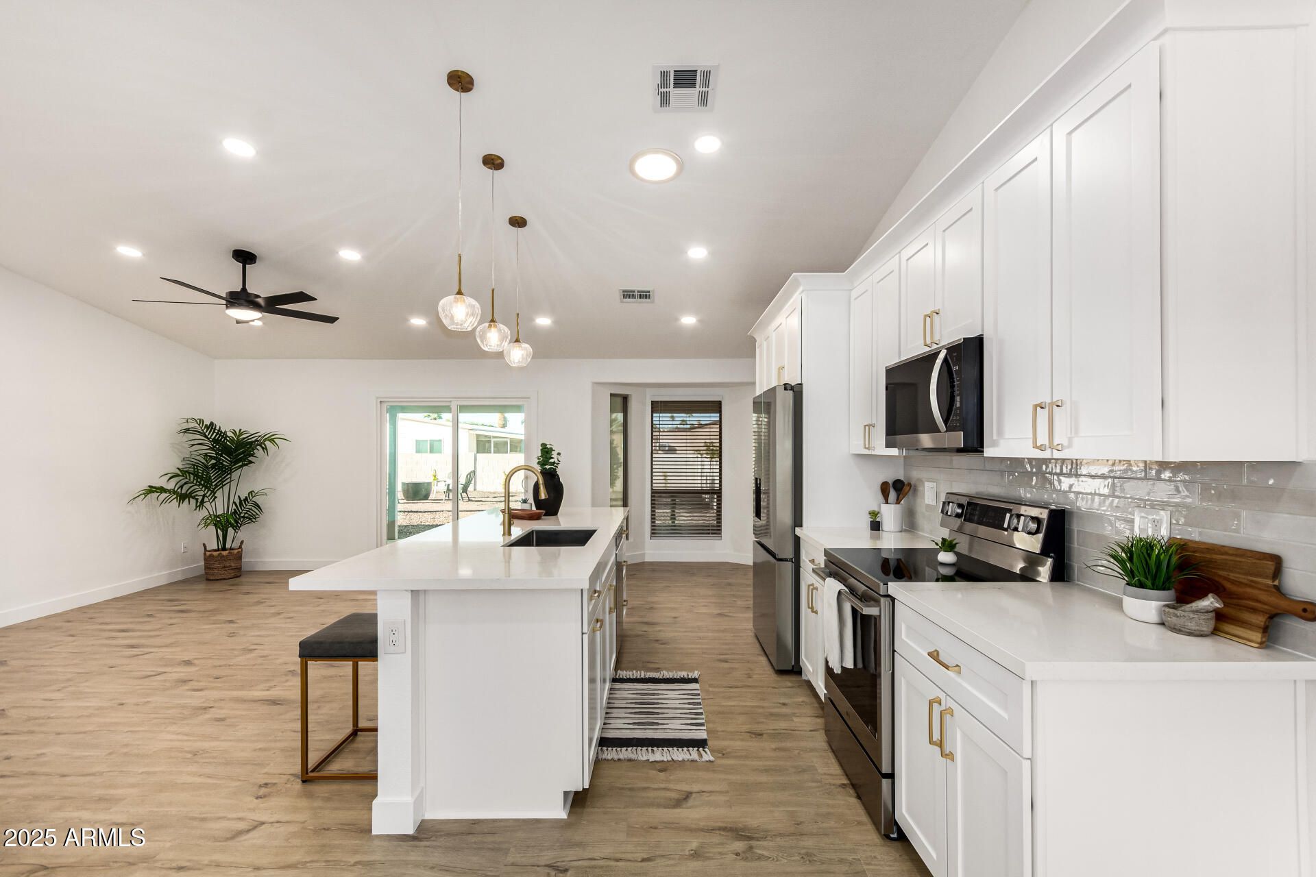 Welcome to your dream retreat in the Premier Active Adult Community of Sun Lakes. Perfectly situated on an inviting cul-de-sac, this impeccably remodeled 3-bedroom, 2-bath home blends modern design with comfort and functionality. Step inside to discover an open-concept living space featuring vaulted ceilings, a brand-new kitchen with soft-close white shaker cabinets, a spacious island ideal for entertaining, quartz counter tops, stainless steel appliances, and recessed lighting that brightens every corner. The pale oak luxury flooring adds warmth and elegance, while fresh paint and new ceiling fans create a crisp, move-in-ready atmosphere. Both bathrooms have been thoughtfully re-imagined with designer finishes—the perfect spaces to refresh and recharge. Outside, enjoy your private low-maintenance backyard and spacious covered patio [ideal for morning coffee, sunset dinners, or simply unwinding in your own oasis.] But the real magic is in the Sun Lakes lifestyle. Here, you'll enjoy all the amenities Sun Lakes has to offer including exclusive access to championship golf courses, multiple pools, fitness center, pickleball, tennis, bocce, billiards, and an abundance of social activities and clubs. From on-site dining and live entertainment to game nights and community celebrations, every day offers something new to explore. This isn't just a new home; it's a membership to the resort lifestyle you've worked for. Don't let this rare move-in-ready opportunity pass you by and start living the dream in Sun Lakes!