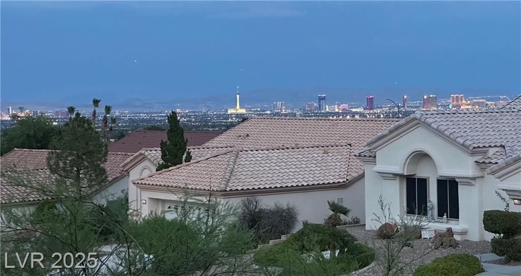 Imagine dining al fresco as you watch the sun setting over the city, mountains and Strip from your own backyard! This home sits on more than a quarter acre elevated corner lot! No visible neighbors behind and on one side offers a sense of privacy that is rare in Sun City. The elegant layout is a modified Hancock floor plan boasting dramatic high ceilings and many built-in cabinets for extra storage. The master suite has direct access to the backyard with a large covered slate patio. The sizeable master suite offers dual closets, separate soaking tub and shower with a dual vanity. Take full advantage of the social calendar and all the amenities within Sun City Summerlin geared toward active seniors. Community features include THREE 18-hole golf courses, four clubhouses with hobby and game rooms, multiple pools, extensive fitness center, tennis, racquetball and pickleball courts, restaurant, Starbright Theater for performances and movies, library, walking trails, and much more!