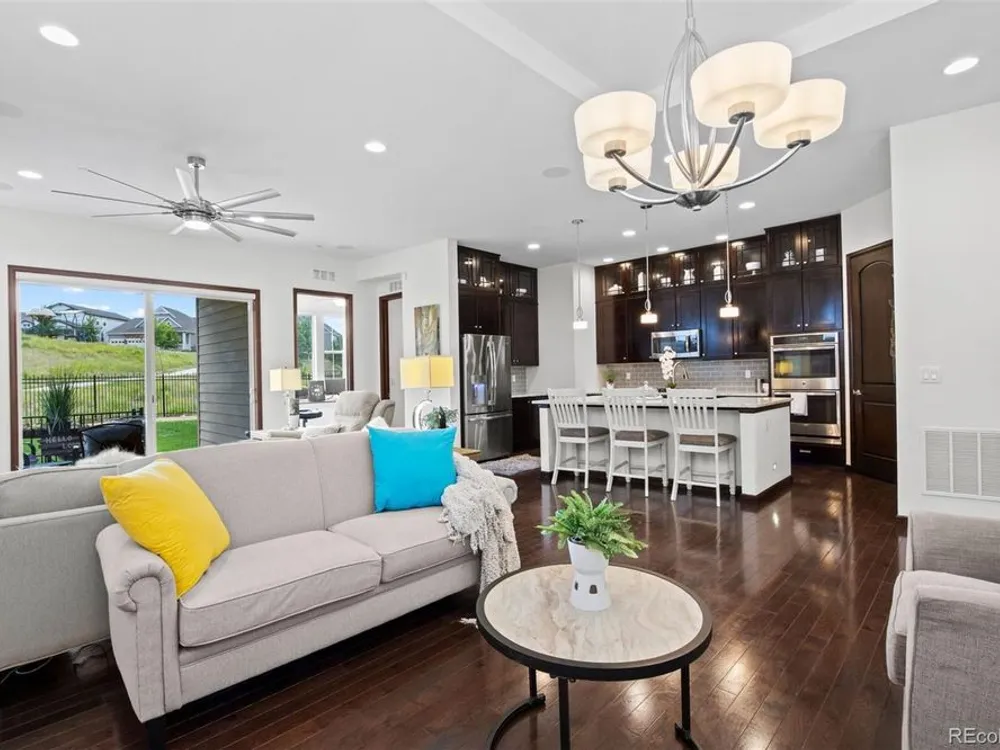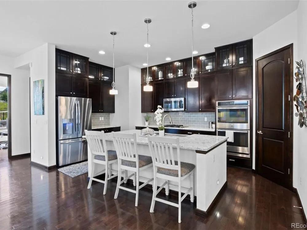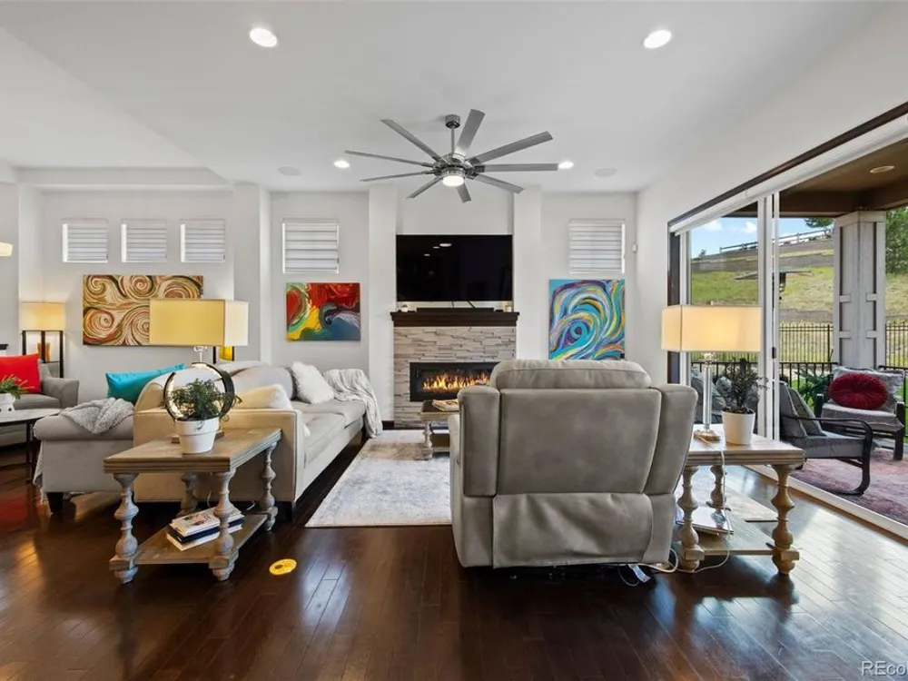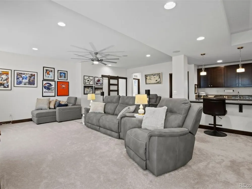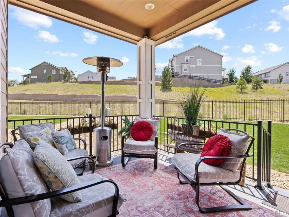 Located on a premium lot in New Haven at The Meadows, this beautifully upgraded ranch-style home offers 5 bedrooms, 4 baths, a home office, and nearly 4,200 SQFT of thoughtfully designed living space. Ideal for those seeking low-maintenance living, the HOA handles front yard care, snow removal of the driveway and sidewalks, and grants access to The Grange and Taft House pools. The main level features a spacious owner’s suite with a luxurious 5-piece bath and a custom walk-through closet, plus two additional bedrooms on either side of a full bath and a stylish sliding privacy door. High-end finishes include detailed wood trim, hardwood floors, remote-controlled transitional blinds, indoor lighted walking paths and a stunning fireplace. The gourmet kitchen is a chef’s dream, showcasing a large quartz island, farmhouse sink, walk-in pantry, stainless appliances, double ovens, gas cooktop, French door fridge, and built-in microwave. The open layout flows seamlessly into the great room and dining area, with built-in speakers that extend to the covered patio—ideal for indoor-outdoor entertaining. The finished basement offers two more bedrooms, a full bath, a large rec room, an upgraded wet bar, and a ~500 SQFT gym/playroom with mirrored walls and rubber flooring. GE washer/dryer are included. Close to parks, trails, shopping, dining, entertainment, and healthcare—conveniently located between Denver and Colorado Springs—this home offers both comfort and convenience in one of Castle Rock’s most desirable low-maintenance communities. The Meadows is a well-developed, amenity-rich community built for active and family-oriented lifestyles. It's ideal for those who value access to nature, quality schools, and community events—all within easy reach of Denver and Colorado Springs.