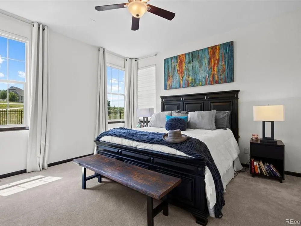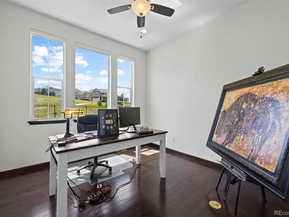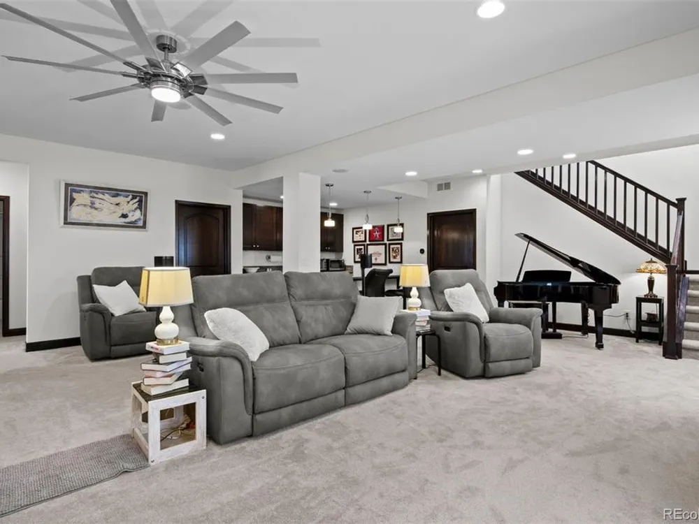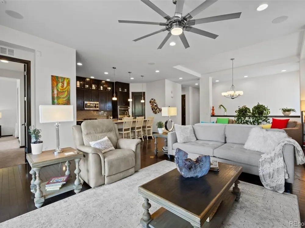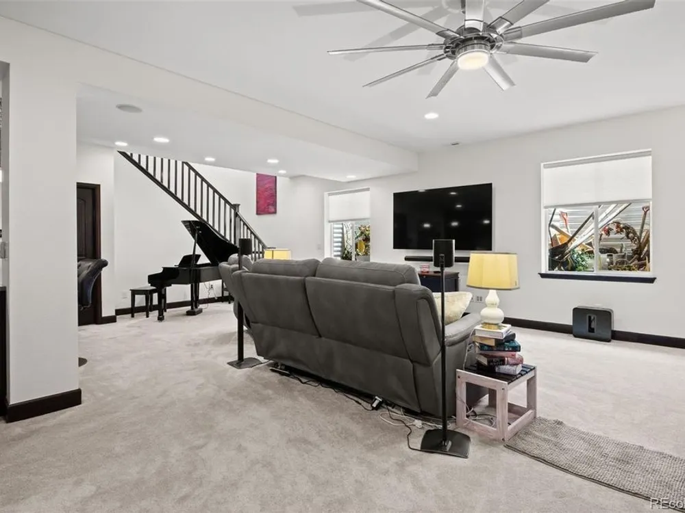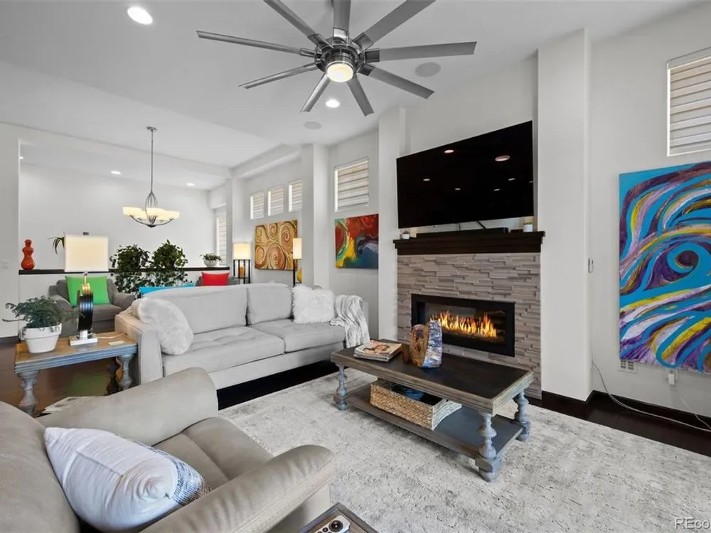 Located on a premium lot in New Haven at The Meadows, this beautifully upgraded ranch-style home offers 5 bedrooms, 4 baths, a home office, and nearly 4,200 SQFT of thoughtfully designed living space. Ideal for those seeking low-maintenance living, the HOA handles front yard care, snow removal of the driveway and sidewalks, and grants access to The Grange and Taft House pools. The main level features a spacious owner’s suite with a luxurious 5-piece bath and a custom walk-through closet, plus two additional bedrooms on either side of a full bath and a stylish sliding privacy door. High-end finishes include detailed wood trim, hardwood floors, remote-controlled transitional blinds, indoor lighted walking paths and a stunning fireplace. The gourmet kitchen is a chef’s dream, showcasing a large quartz island, farmhouse sink, walk-in pantry, stainless appliances, double ovens, gas cooktop, French door fridge, and built-in microwave. The open layout flows seamlessly into the great room and dining area, with built-in speakers that extend to the covered patio—ideal for indoor-outdoor entertaining. The finished basement offers two more bedrooms, a full bath, a large rec room, an upgraded wet bar, and a ~500 SQFT gym/playroom with mirrored walls and rubber flooring. GE washer/dryer are included. Close to parks, trails, shopping, dining, entertainment, and healthcare—conveniently located between Denver and Colorado Springs—this home offers both comfort and convenience in one of Castle Rock’s most desirable low-maintenance communities. The Meadows is a well-developed, amenity-rich community built for active and family-oriented lifestyles. It's ideal for those who value access to nature, quality schools, and community events—all within easy reach of Denver and Colorado Springs.