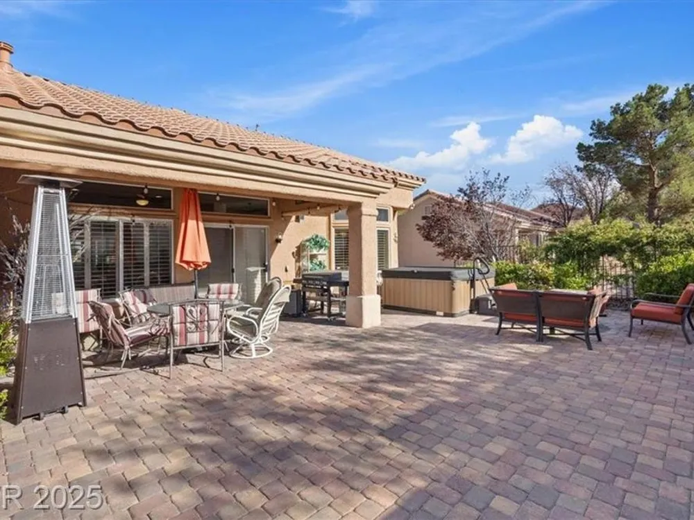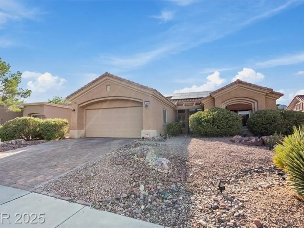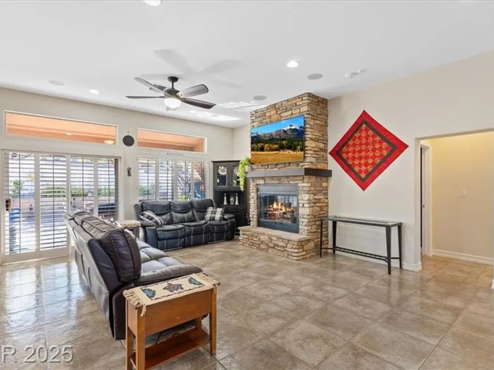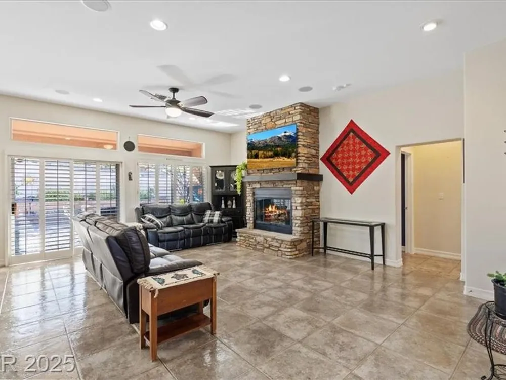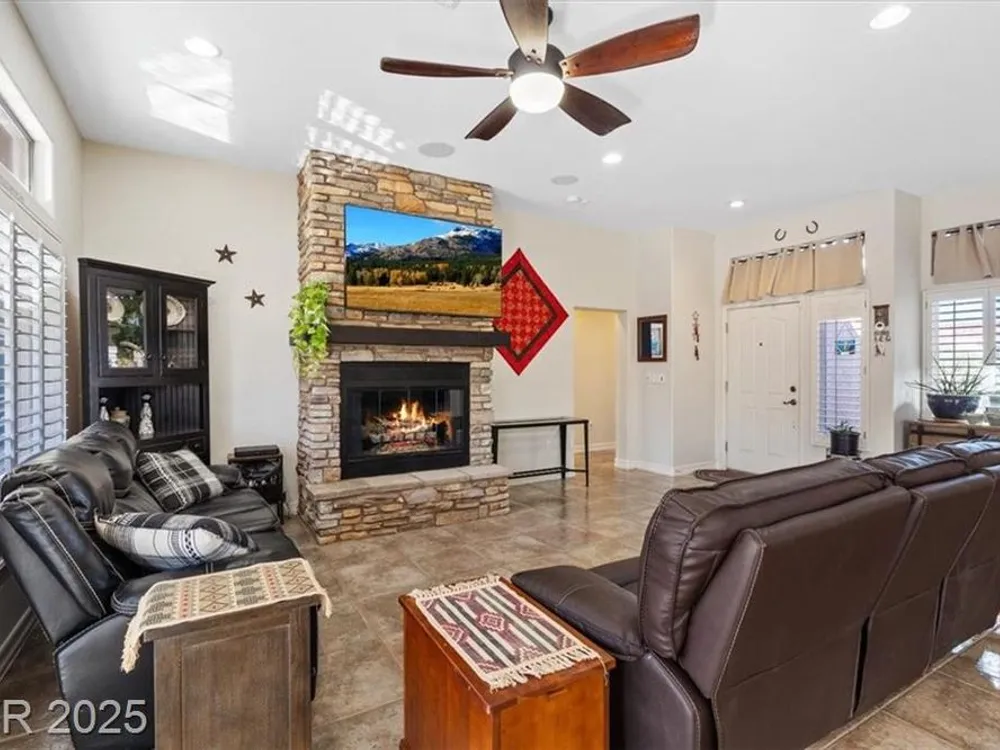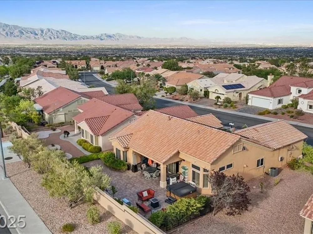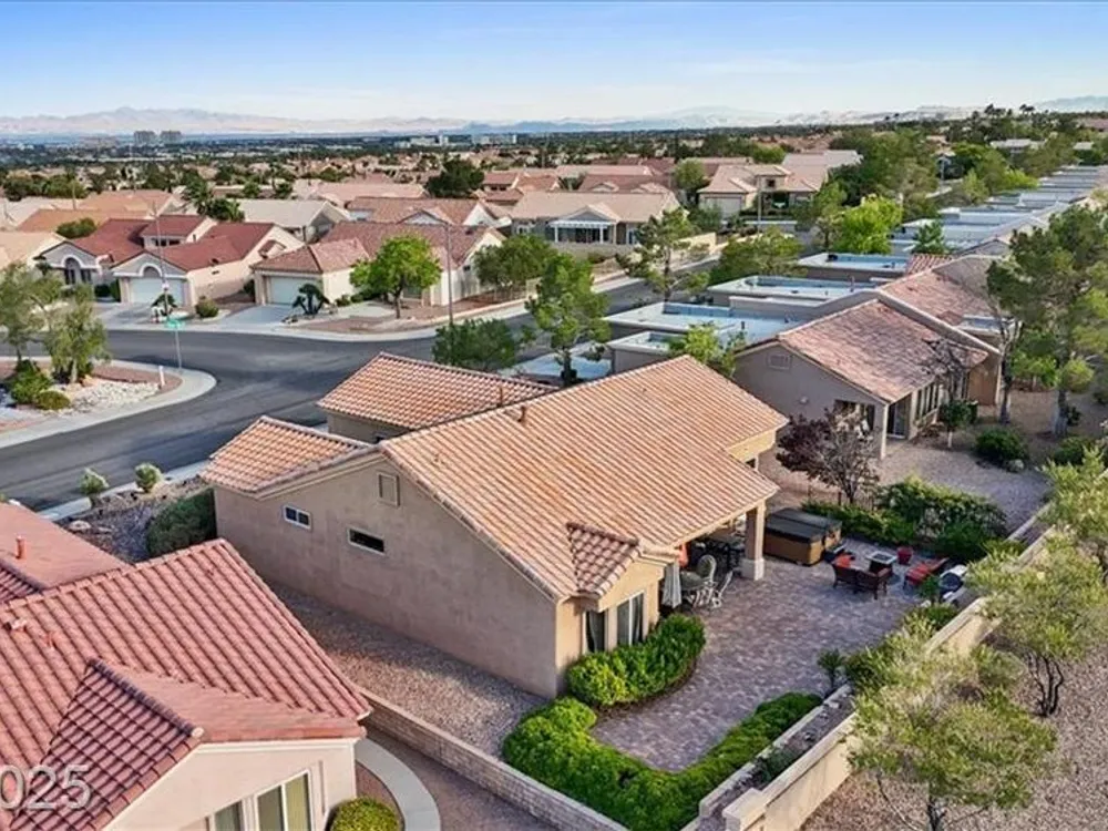 Welcome to a stunning single-story home that radiates pride of ownership from the moment you arrive. Offering 1,533 sq. ft. of comfortable living space, this beauty is adorned with ceramic tile flooring throughout, a charming real brick veneer fireplace, and a brick-accented kitchen island that adds a touch of timeless elegance. Recessed lighting, interior shutters, and low-maintenance desert landscaping create both style and convenience. Step outside to your covered patio and private backyard, perfect for entertaining or simply relaxing. Plus, enjoy lower energy bills with solar at just $127/month. Life in Sun City Summerlin means access to an exceptional lifestyle: three 18-hole golf courses, three community centers, and countless clubs and activities including ceramics, pottery, pickleball, baseball, and more. Don’t miss your chance to own a true slice of sunshine in one of Las Vegas’s most sought-after communities!