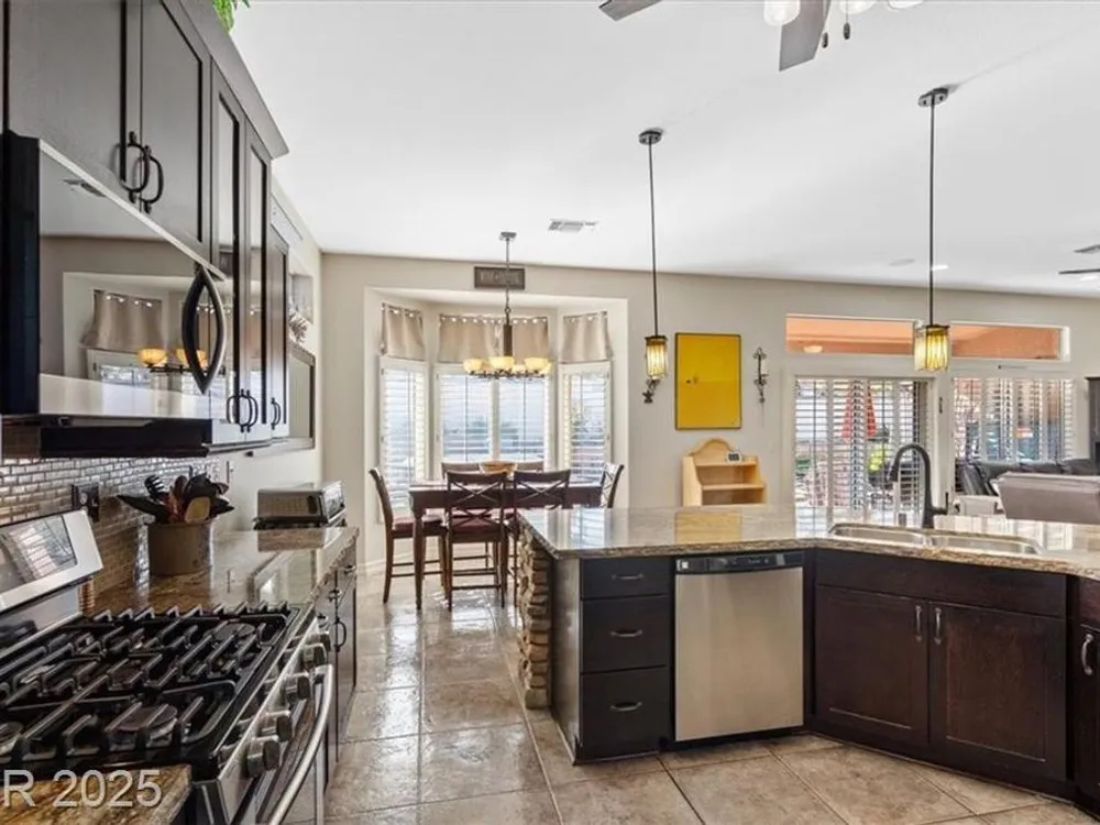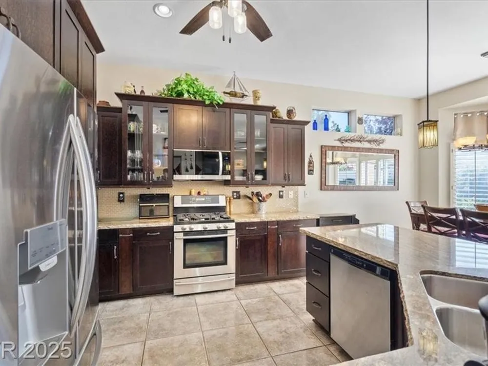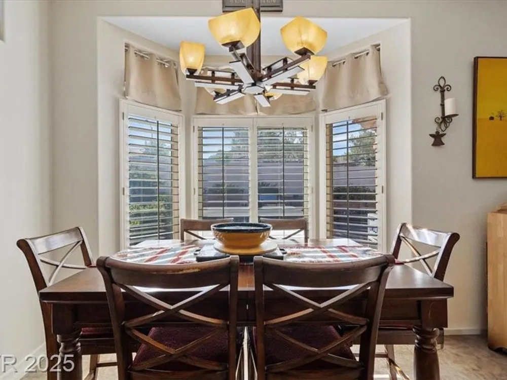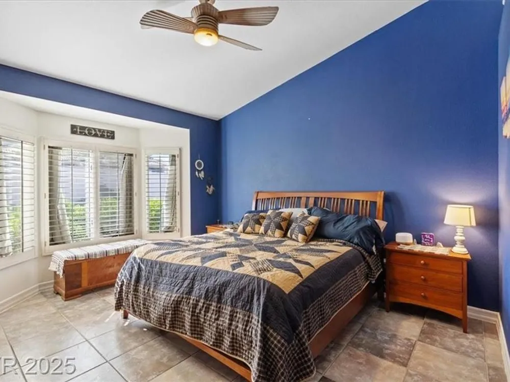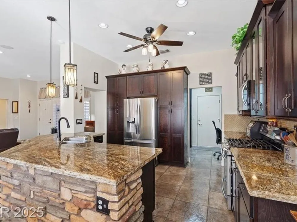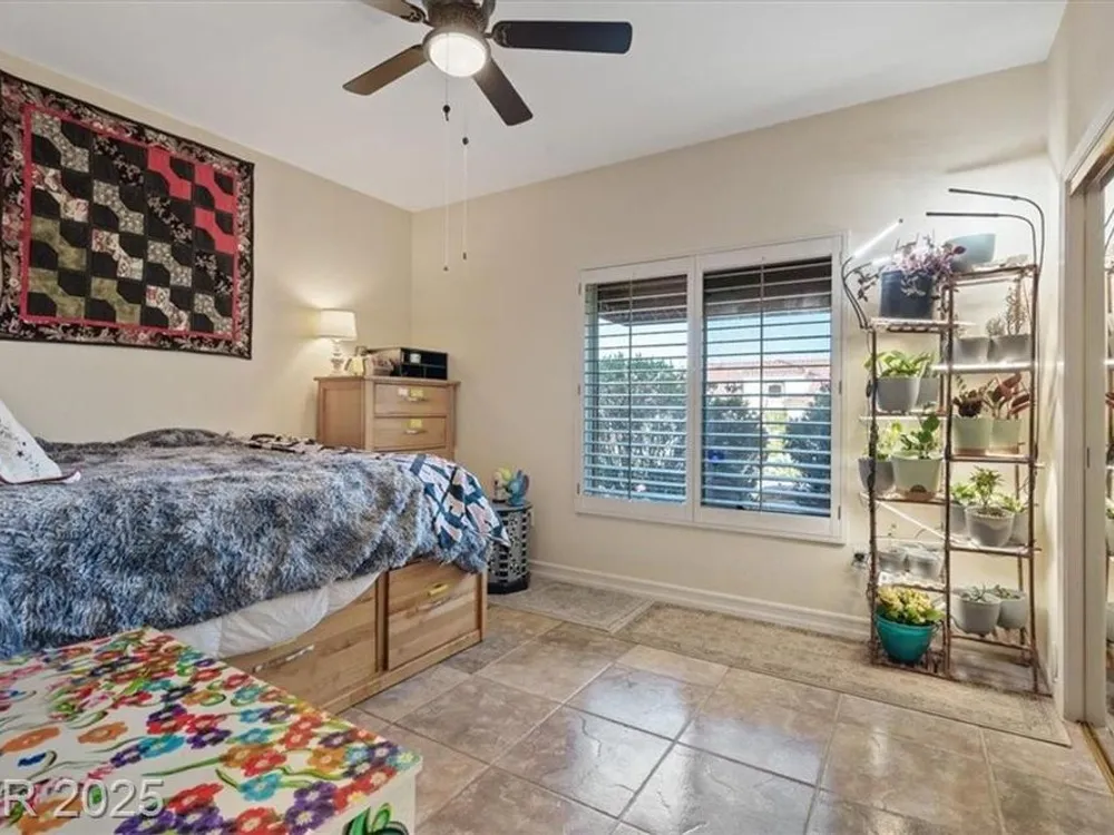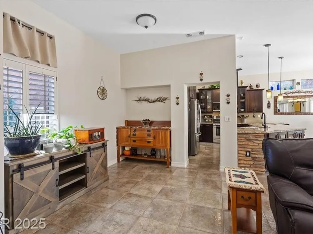 Welcome to a stunning single-story home that radiates pride of ownership from the moment you arrive. Offering 1,533 sq. ft. of comfortable living space, this beauty is adorned with ceramic tile flooring throughout, a charming real brick veneer fireplace, and a brick-accented kitchen island that adds a touch of timeless elegance. Recessed lighting, interior shutters, and low-maintenance desert landscaping create both style and convenience. Step outside to your covered patio and private backyard, perfect for entertaining or simply relaxing. Plus, enjoy lower energy bills with solar at just $127/month. Life in Sun City Summerlin means access to an exceptional lifestyle: three 18-hole golf courses, three community centers, and countless clubs and activities including ceramics, pottery, pickleball, baseball, and more. Don’t miss your chance to own a true slice of sunshine in one of Las Vegas’s most sought-after communities!