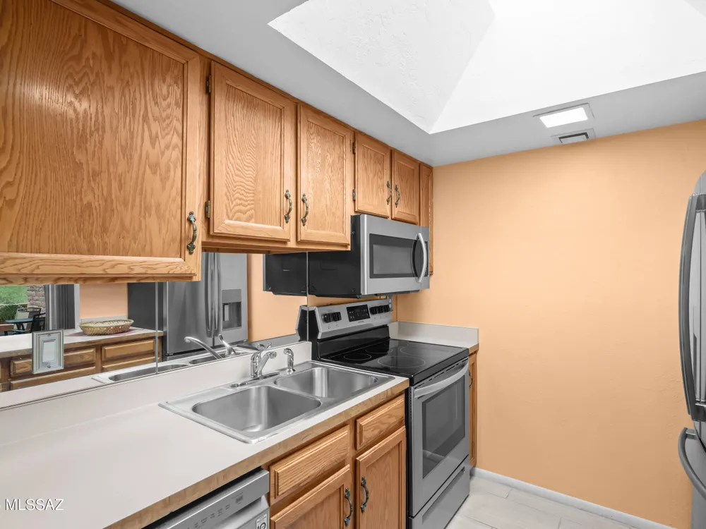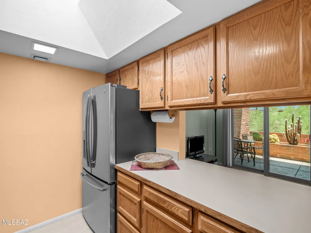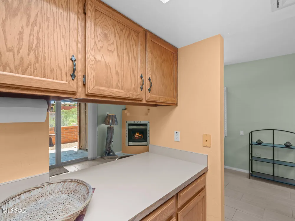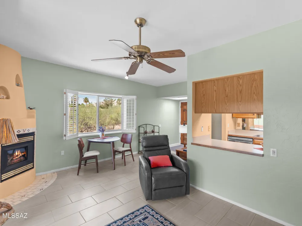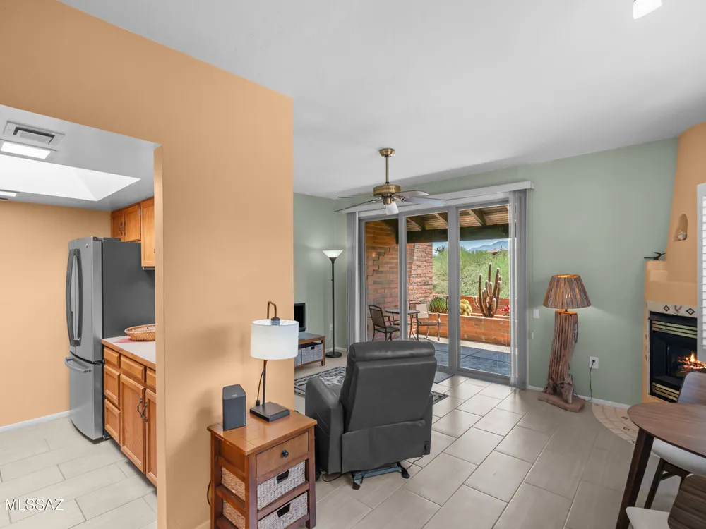 Looking for a great retreat with personality and charm? This one-bedroom, one-bath townhouse is the one! As a private elevated end unit, it gives you a bit more light, a touch more quiet. With its lovely patio to soak in the desert views. The standout feature has to be the open floor plan and the gorgeous Bee Hive gas fireplace, in the living room.The galley kitchen is practical and well-equipped with a pass-through window, a skylight for natural light, and plenty of counter space for prepping your next meal or simply unloading groceries. The low-maintenance tile floors in the living area keep the living area cool and easy to clean, while the bedroom offers soft carpet for comfort.The bathroom has been updated with a new shower door and has a nice granite countertop.