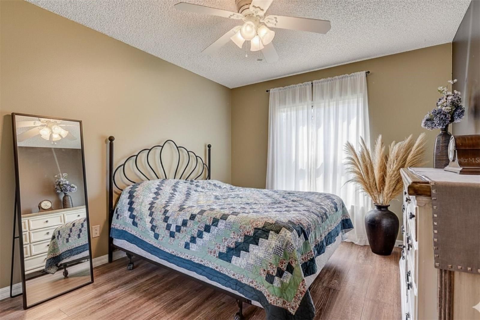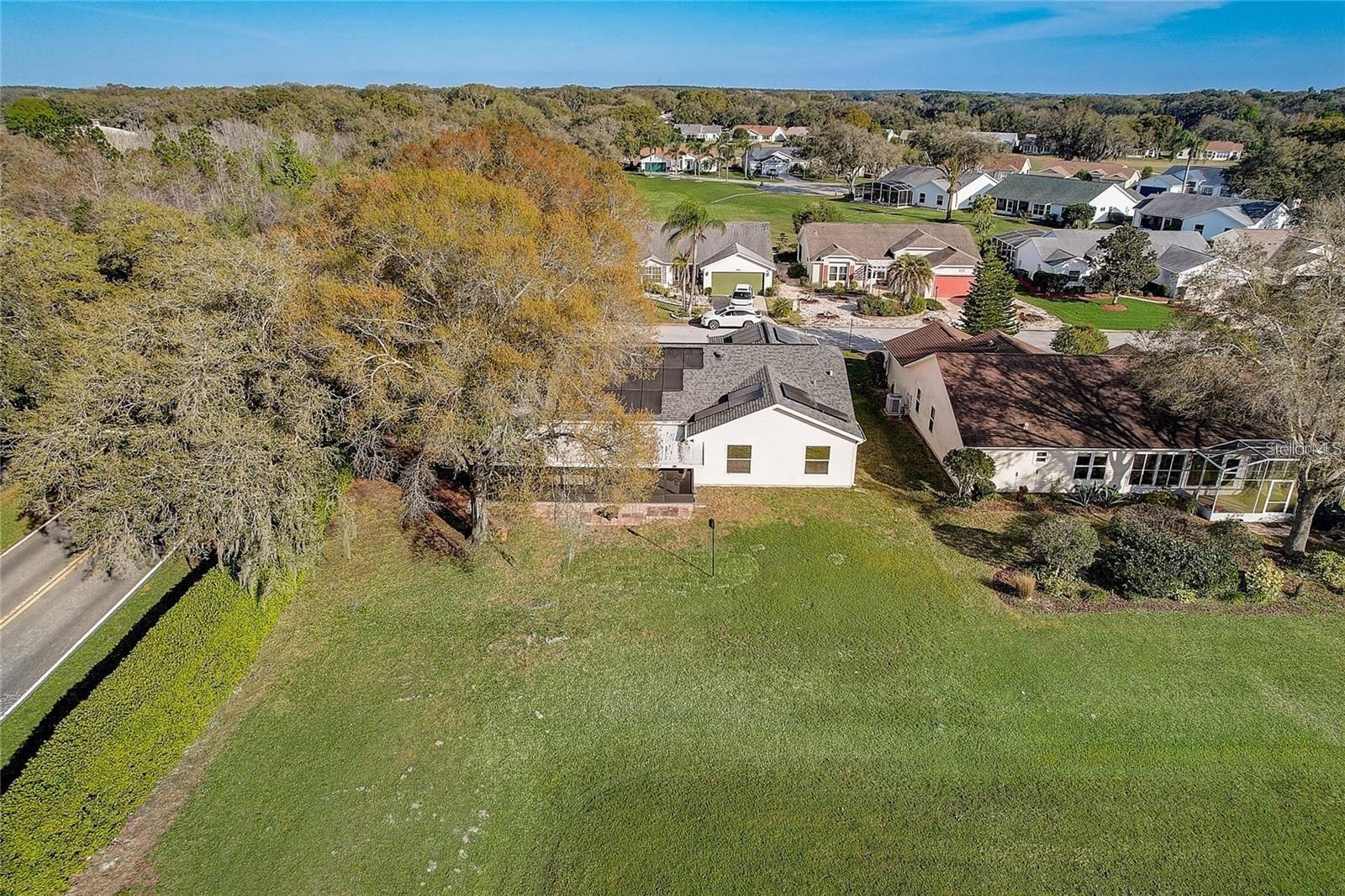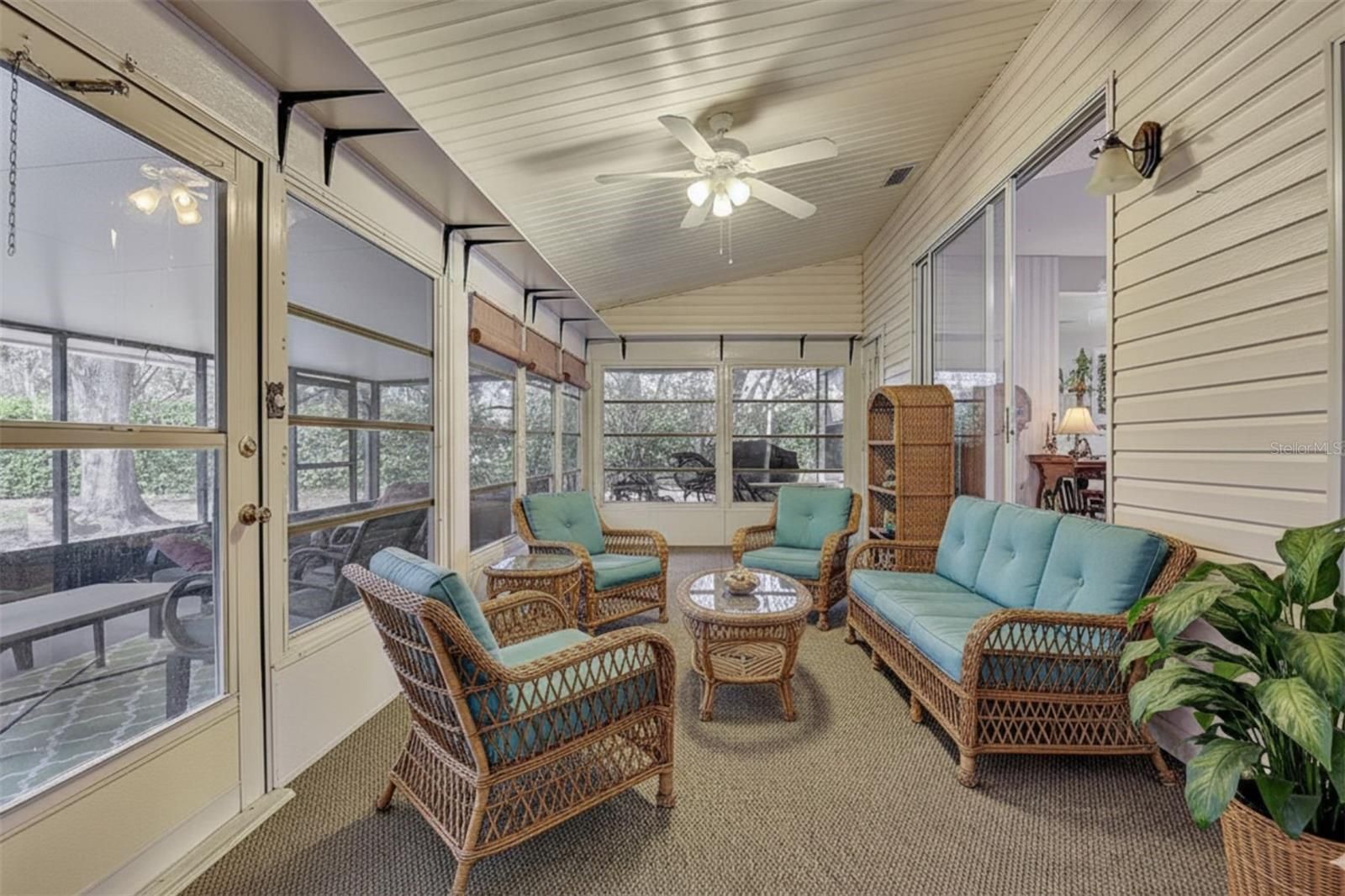 One or more photo(s) has been virtually staged. Located in the highly desirable Plantation at Leesburg 55+ golf community, this immaculately maintained 3-bedroom, 2-bath single-family home offers 1,702 sq ft of stylish living on a beautifully landscaped corner lot. Step inside to soaring vaulted ceilings, no carpet, and rich finishes throughout. The kitchen is a standout with granite countertops, tile backsplash, stainless steel appliances, pendant lighting, and a cozy breakfast bar perfect for casual mornings. The primary suite is a tranquil retreat with high vaulted ceilings, a spa-inspired bath featuring a soaking tub, tile shower, dual vanities, and a private water closet. Both guest bedrooms feature laminate flooring, built-in closets, and ceiling fans for year-round comfort. Outdoor living is maximized with a fully enclosed lanai and an additional screened patio with a hot tub, ideal for evening unwinding or weekend entertaining. Have peace of mind knowing the roof was replaced in 2017, the HVAC in 2020, and the water heater in 2021. There's also a water softener and solar panels, keeping electric bills between just $30–$50/month. There's plenty of space in the 2-car garage with dedicated golf cart space and tool storage. Purchase the golf cart and tool storage cabinets separately. This home is nestled within an amenity-rich community offering golf, pickleball, tennis, pools, fitness centers, clubs, and events. Whether you're looking for low-maintenance luxury, energy efficiency, or a vibrant community, 25273 Lost Oak Cir checks every box.