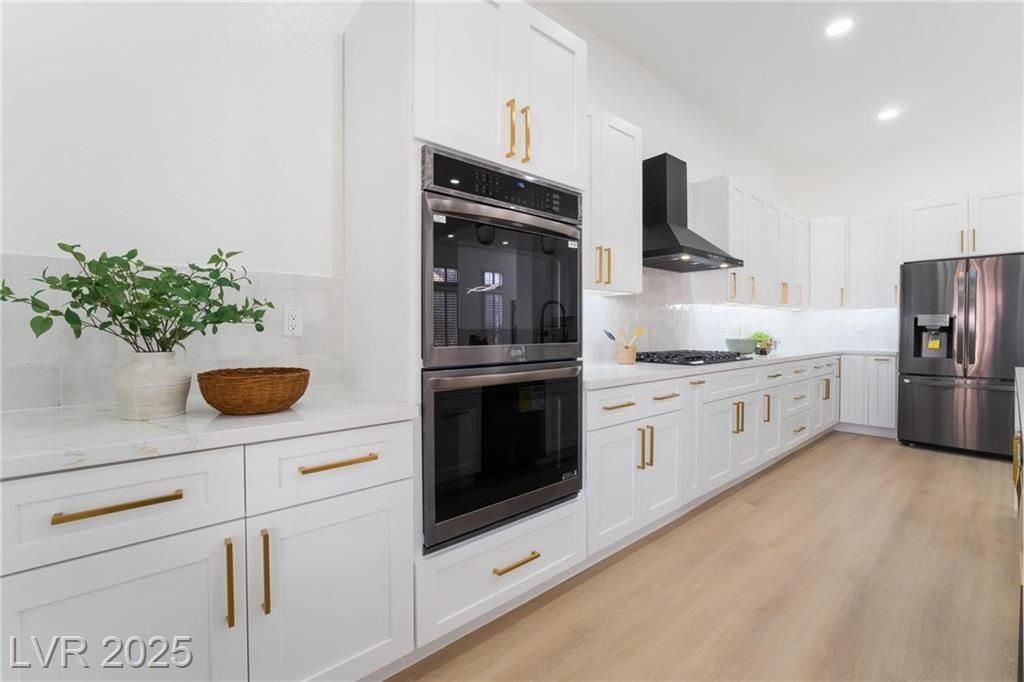 Discover the pinnacle of modern luxury in this beautifully upgraded home. The brand-new chef’s kitchen boasts black stainless steel appliances and a stunning 9-foot Tesoro Calacatta quartz island, perfect for cooking and entertaining. A sleek 88-inch electric fireplace framed by Apolina white porcelain tile adds warmth and style to the living space.The guest bathroom is elegantly appointed with Brazilian concrete quartzite, floating cabinets and ambient lighting. Master bath features a double-head walk-in shower with gold finishes. Both bathrooms exude spa-like sophistication.Stay comfortable year-round with two brand new AC units controlled by Google Nest thermostats. New wine fridge and rack mounted on luxury marble. All three bedrooms are generously sized, each featuring walk-in closets. Enjoy the convenience of a fully equipped laundry room & relax on the covered patio. Quartz counters, LVP flooring, & brand new cabinets, this home blends luxury & function in every detail.