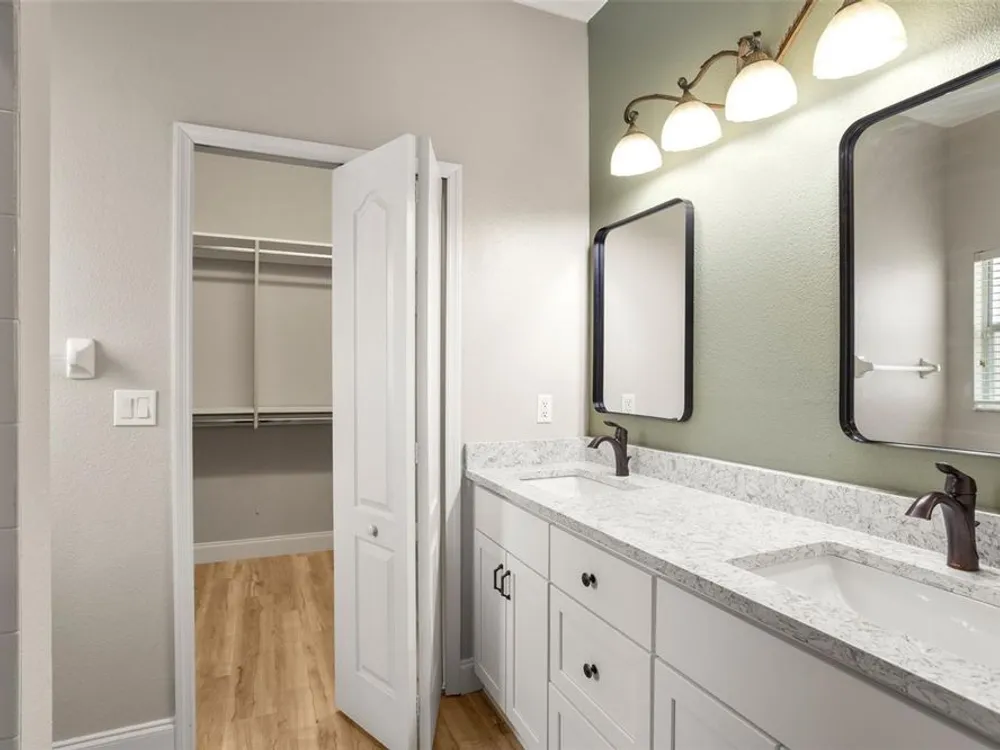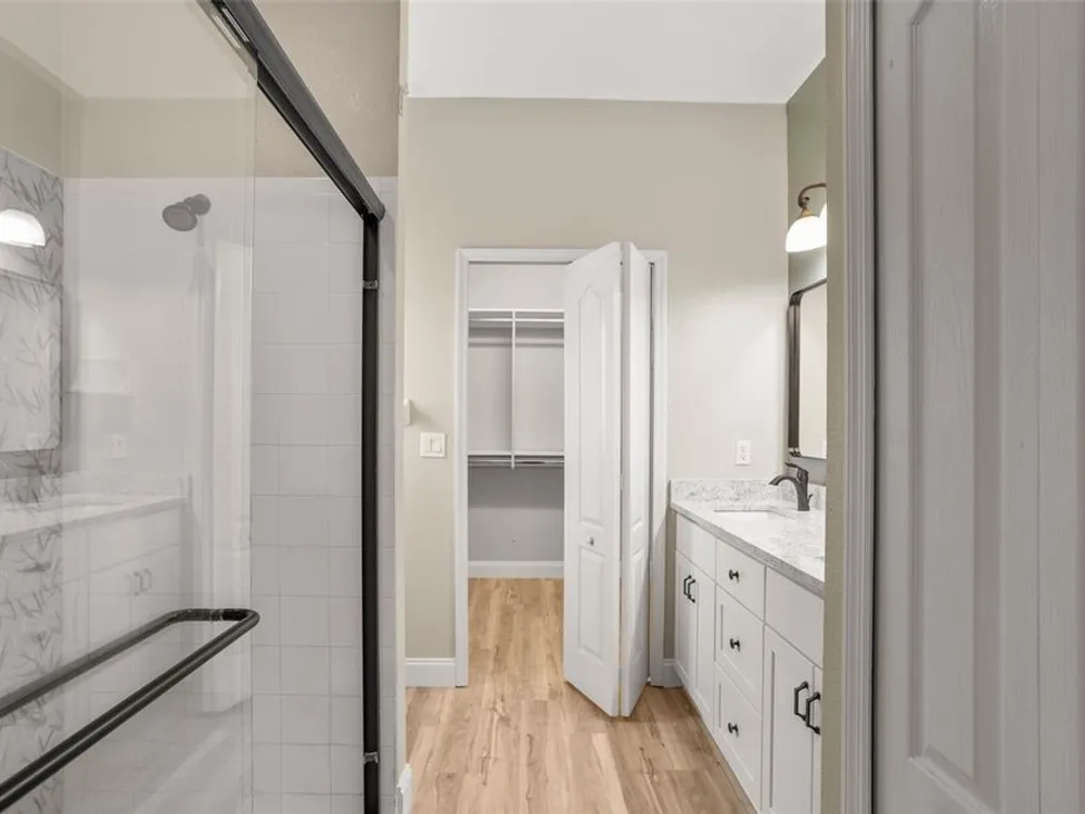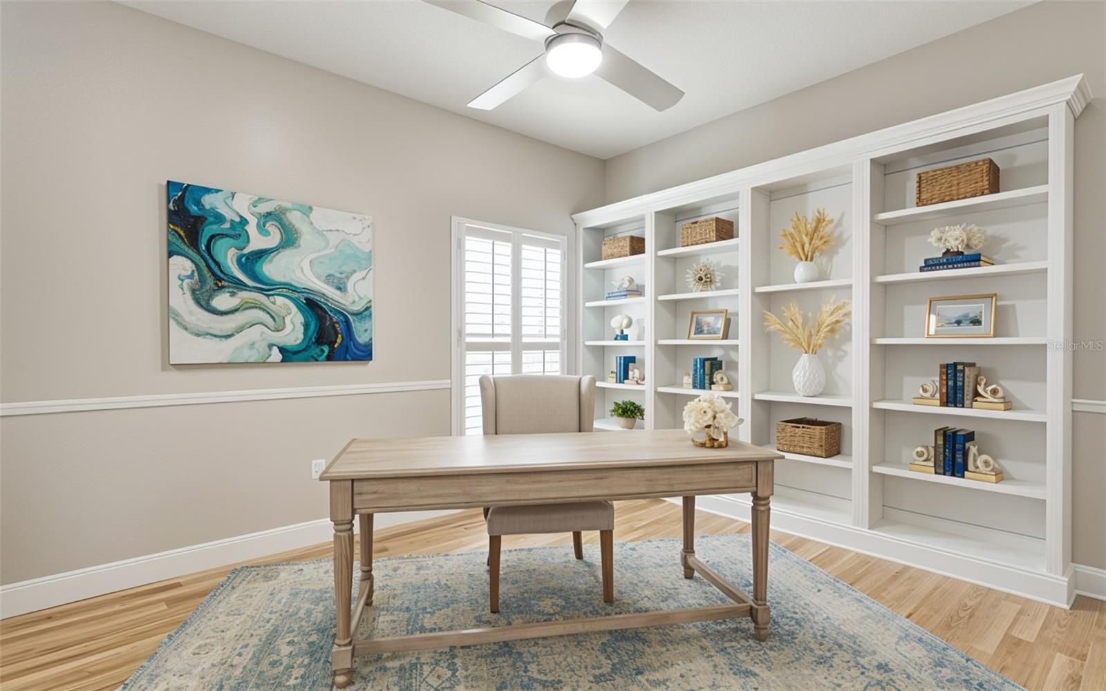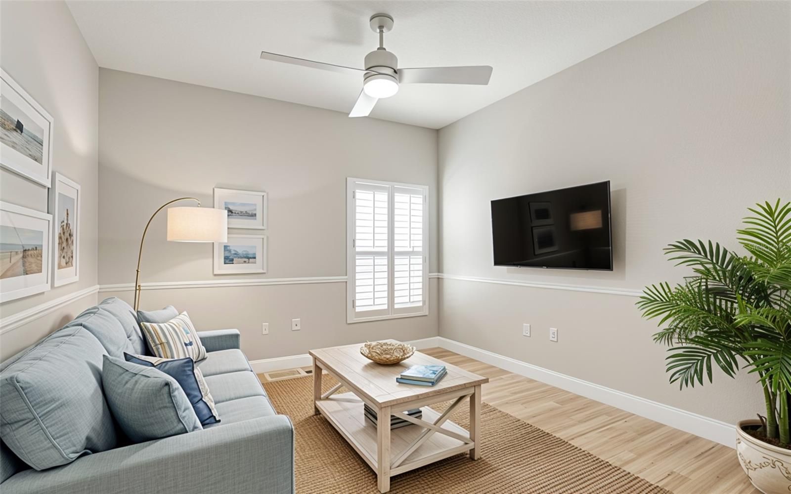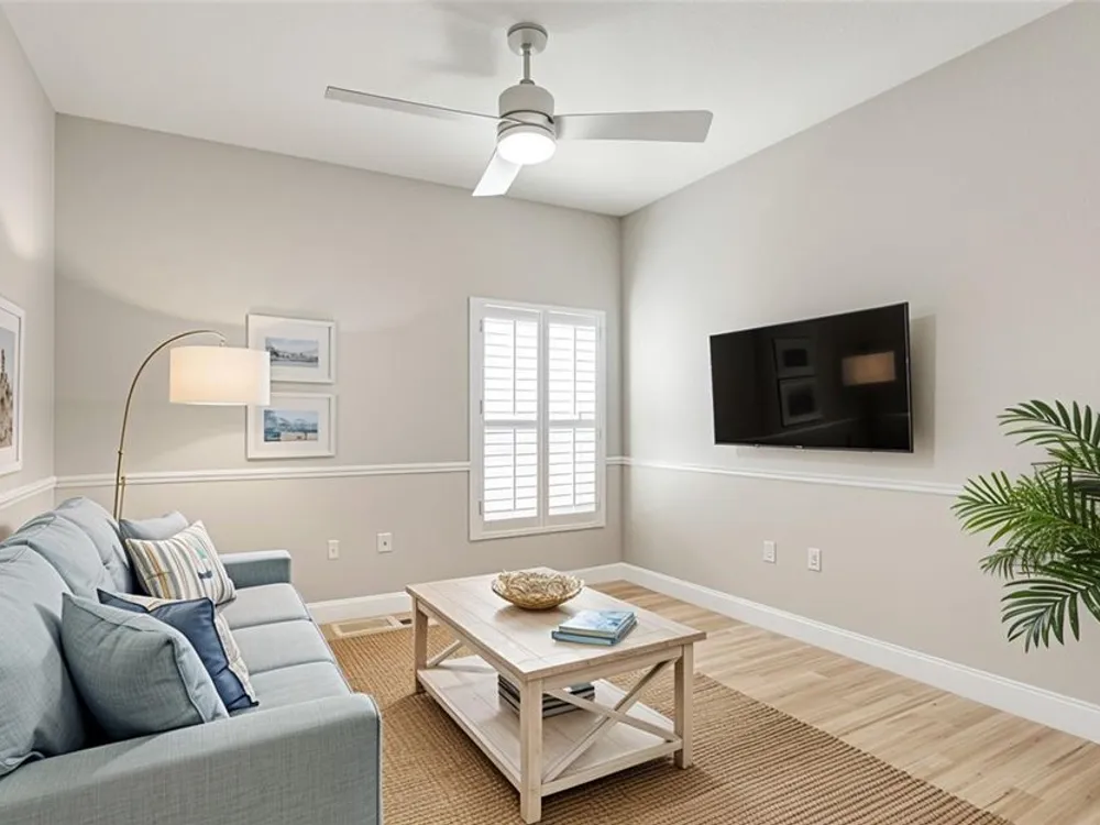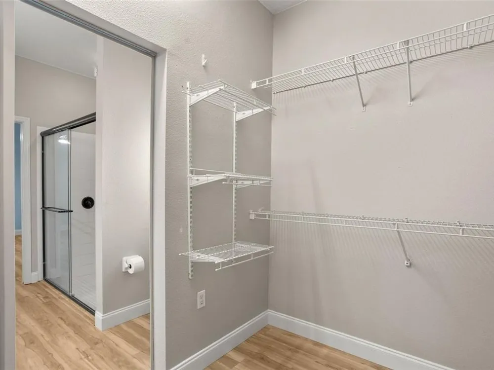 - Ceiling Fan(s), High Ceilings, Open Floorplan, Main Level Primary, Solid Surface Counters, Solid-Wood Cabinets, Stone Counters, Thermostat, Walk-In Closet(s), Window Treatments