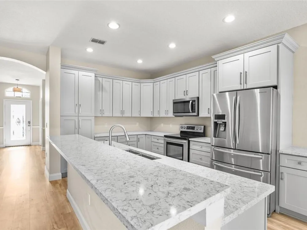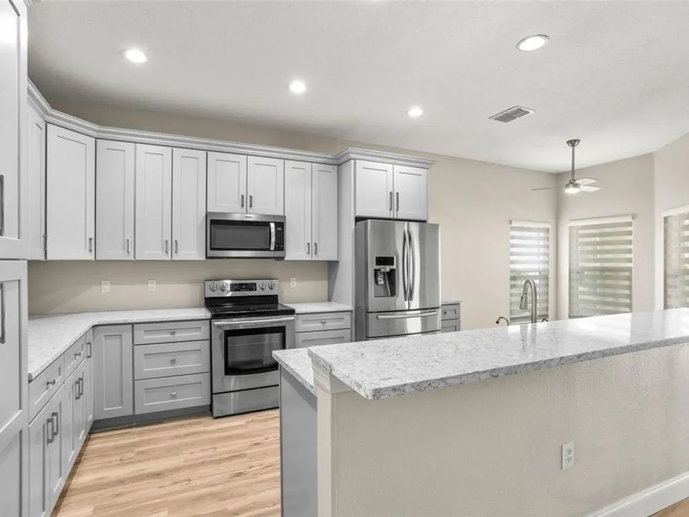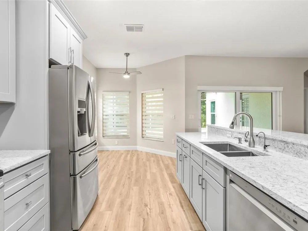 One or more photo(s) has been virtually staged. Minutes to World Class Golf Courses, Entertainment Venues for Concerts, Pro Sports, the Casino, Museums, Water Sports, Marinas, Fishing Piers, Nature Parks, Biking/Jogging Trails, Fine/Causal Cuisine, 2 Airports and the Award-Winning Beaches of the warm Gulf Of Mexico! Welcome to Key Vista's 55+, Vista Point that is Gated (open at times) and in FLOOD ZONE X with a PREMIUM LOT LOCATION!!! Situated in the back of a QUIET CUL DE SAC with a Long Driveway is this STUNNINGLY REMODELED Residence set in a HIGHLY SOUGHT AFTER SOLID BLOCK CONSTRUCTION designed with HIGH CEILINGS & a Layout that is perfect for today's living! This MOVE IN READY, Single Family Home includes High End, COASTAL STYLE FINISHES: Hurricane Rated Windows & 8 Foot Slider, Luxury Vinyl Tile Flooring throughout, Custom Window Treatments, new Kitchen with Wood Cabs, Quartz Countertops with 4-Seater Bar, Double Sinks! It even has a Breakfast Room AND a Formal Dining Room! The Primary has an En Suite with ALL NEW...Shower Feature Wall, Large Vanity with Double Undermount Sinks, Quartz Countertop, Hardware & a HUGE WALK-IN! Guest Bedroom is split from the Owners Quarters providing privacy & has its own Hallway Bath with ALL NEW...Vanity with Undermount Sink & Quartz Countertop & Hardware complete with Linen Closet. Front Flex Room can be a 3RD BEDROOM, an Office, a Den or TV/Reading Room. HUGE Slider off the Family Room has an Open Concept Kitchen & Breakfast Room that looks out into the GIGANTIC, NEWLY PORCELAIN TILED, FULLY SCREENED-IN LANAI! This presents an AMAZING scene of the Mature Landscaping featuring towering Palms overlooking the Lush Green Space & the Pond beyond! This peace & serenity is hard to find in City Living! The ages of the big items are: Re-Roof 2021, Elec Panel 2002, HVAC 2020, Tankless Water Heater 2025, High Impact Hurricane-Rated Windows & Slider 2025, Hurricane Rated Garage Door 2002, Garage Door Opener 2025, Gutters & Downspouts 2025, Popcorn Removal & Interior Paint 2025. Vista Point's HOA Fee is VERY REASONABLE & includes: Lawn/Scrubs/Trees (up to 12’ tall) Maintained, Sprinkler System Monitored, Ext Painting (as Docs specify) & High Speed Internet & TV Streaming with lots of Premium Channels! VERY ACTIVE SOCIAL CLUB and amenities of a separate Clubhouse with Meeting Room, Kitchen, Pool Table/Library Room, Heated Pool & Spa with an ample Covered Lounging Area! PLUS, the Key Vista All Ages Clubhouse features a Huge Pool, Spa, Pickleball/ Tennis Courts, Volleyball Court, Playground, Fitness Center, Yoga Room, Party/Recreational Room, Kitchen, Game Room with Pool Tables, Ping Pong & Card Tables & Events Galore! Partake in Activities such as Holiday Dinners, Dancing & Golf Cart Parades! Enjoy Block Parties, Garage Sales, Yoga, Aqua Bellies, Pickleball. Play Bingo, Bunco, Cards! Attend Golf Outings & Pub Crawls! Nearby is Key Vista Nature Park with Hiking Trails & Kayak Launch; Anclote Gulf Park with a Long Fishing Pier, Doggie Park & Playground and Anclote River Park with a Private Beach, Boat Launches, Day Dock with Slips & another Playground. Join the Holiday Recreation Center at a nominal fee and enjoy a Baseball Field, Indoor & Outdoor Basketball, Indoor Pickleball, Outdoor Field Hockey Rink and tons of events! The Biking/Jogging/Walking Trail is just outside the Back Gates where you can meander along the Coastline of the GORGEOUS GULF OF MEXICO! All I can say now is…..Welcome to our FANTASTIC FLORIDA PARADISE!!!
