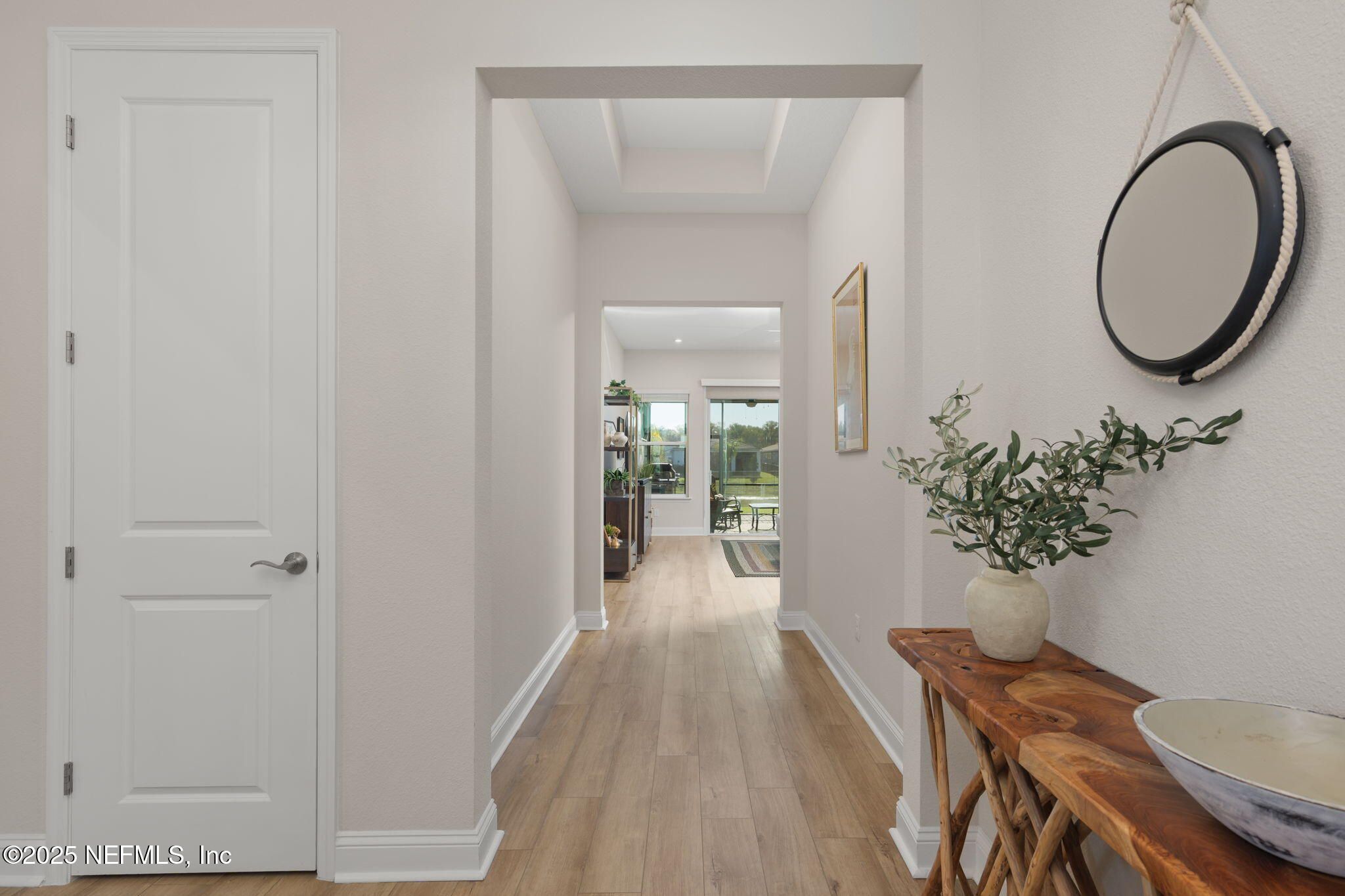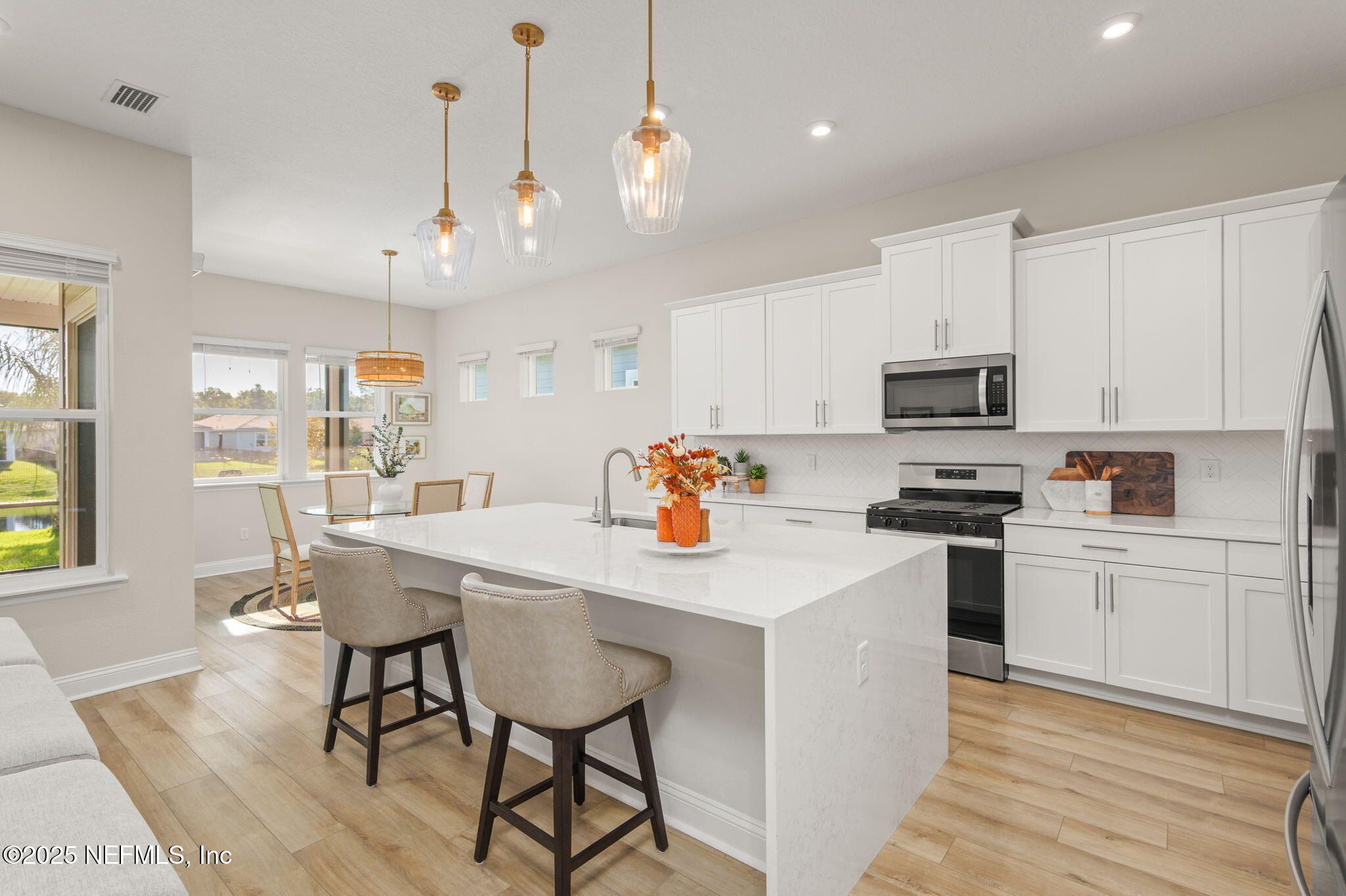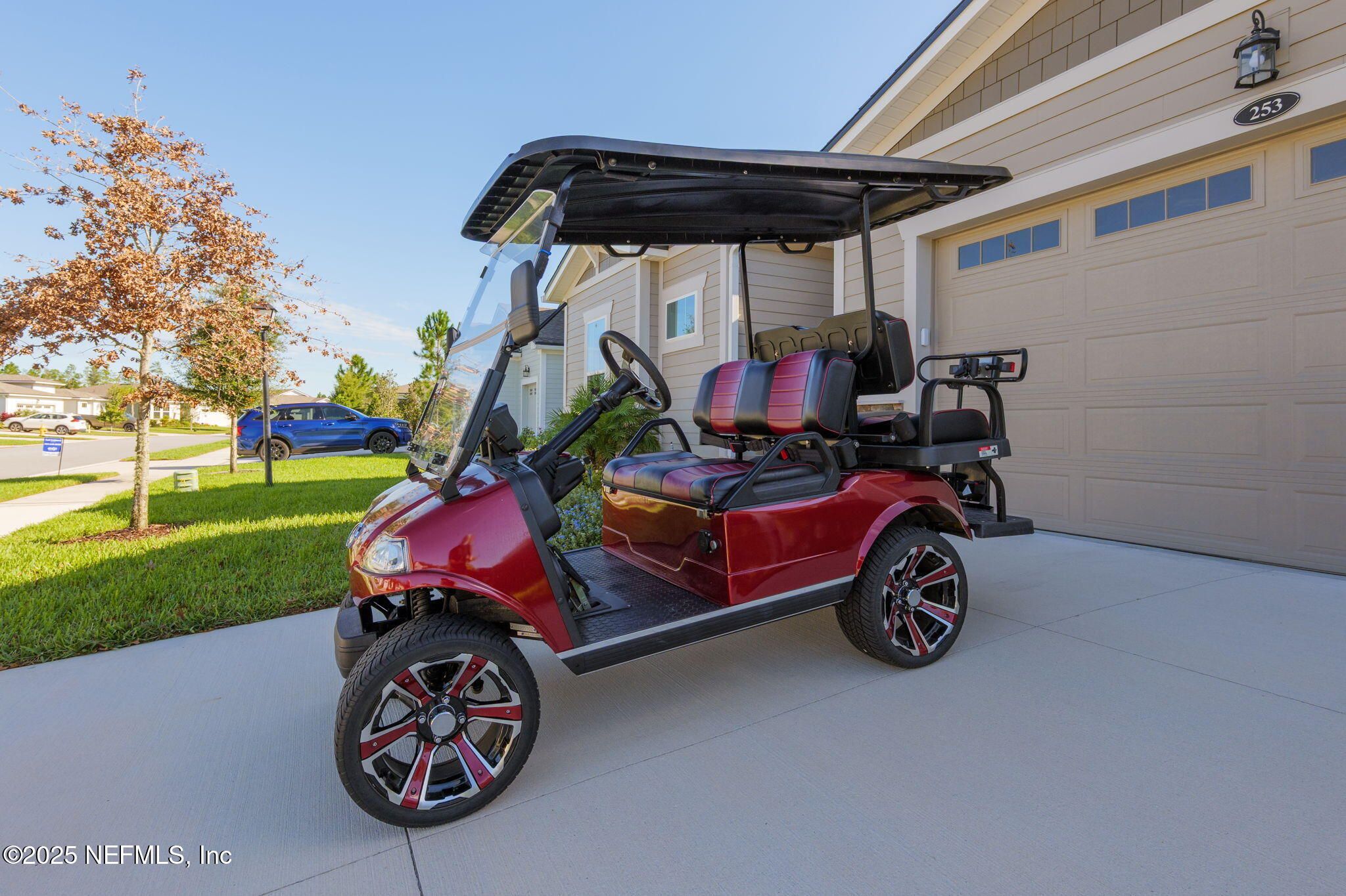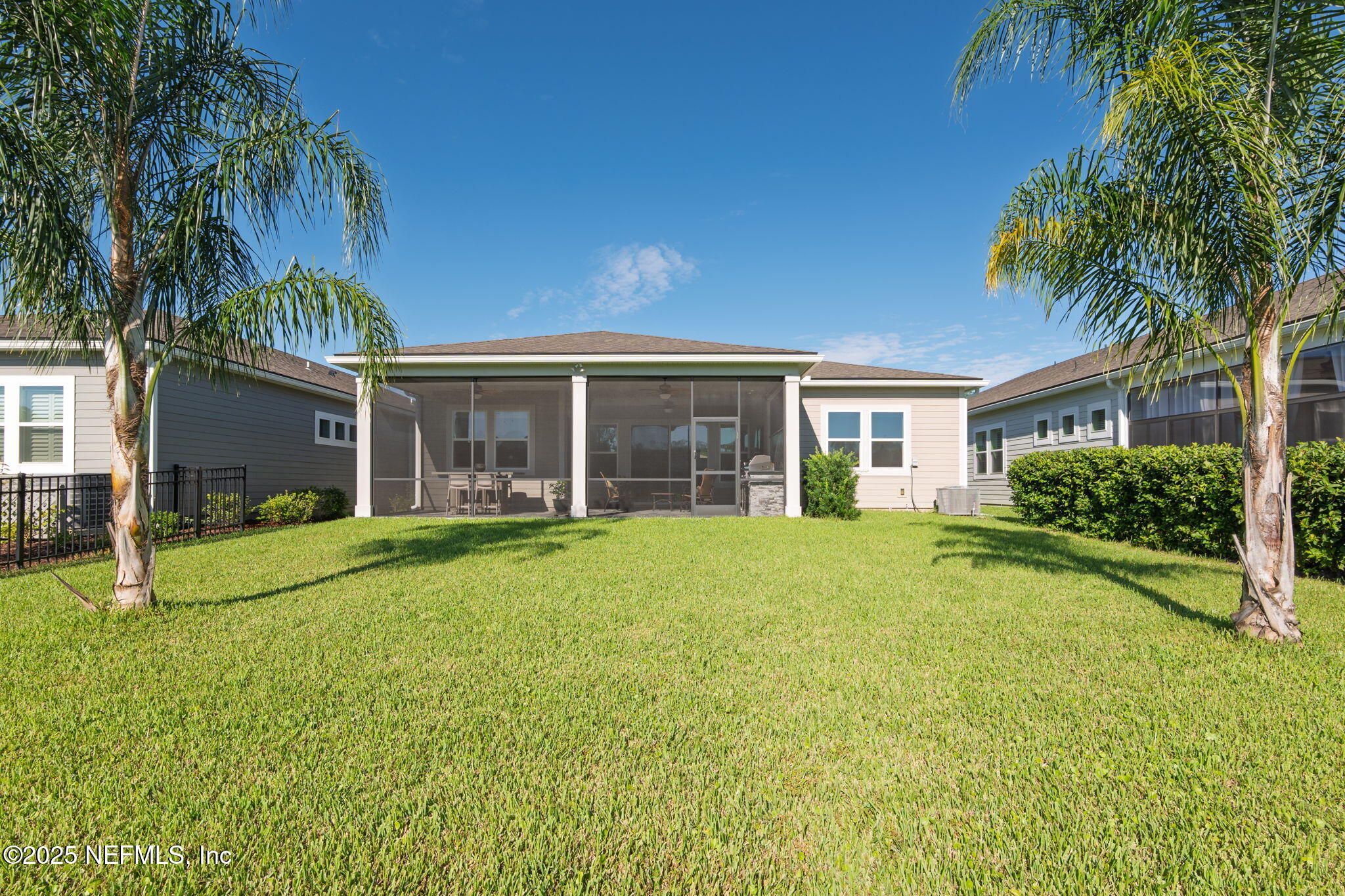 Built in 2023, this stunning Pier model spans 1,914 square feet of refined comfort with 2 bedrooms, a private office, and 2 baths—all set on a peaceful pond lot framed by swaying palms and spectacular sunset views. Inside, luxury vinyl plank flooring flows through open, light-filled spaces designed for both everyday living and entertaining. The showpiece of the home is the custom wine and beverage bar, complete with a stacked-stone backsplash, floating wood shelves, quartz countertops, and a built-in refrigerator—perfect for unwinding or hosting with style. The chef's kitchen features white shaker cabinetry, a waterfall island, and stainless steel Whirlpool appliances, while the dining area glows under contemporary lighting that adds warmth and elegance. Retreat to a serene primary suite with a spa-inspired bath offering a zero-entry shower and a large walk-in closet with built-in luggage racks. Every detail is considered, from the drop zone with cubbies and bench to the fully outfitted laundry room with Speed Queen washer and dryer. Step outside to your extended screened lanai and savor the evenings in your custom-built summer kitchencomplete with BBQ, refrigerator, and stone surround. Here, sunsets shimmer across the pond, framed by lush palms that move gently with the Florida breeze. Nestled within WaterSong, a premier 55+ gated community inside RiverTown, residents enjoy an unmatched lifestyletwo amenity centers, resort-style and lap pools, fitness centers, pickleball and bocce courts, walking trails, a biergarten, and a full-time lifestyle director orchestrating endless social and recreational events. It's where neighbors become friends, and every day feels like a getaway. Plus, a GOLF CART is included for you to travel to WaterSong/Rivertown destinations. This is more than a homeit's a statement of effortless living in one of Northeast Florida's most vibrant communities.