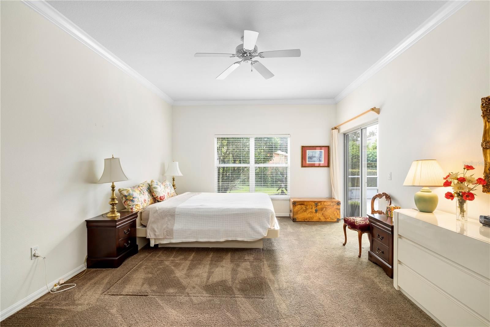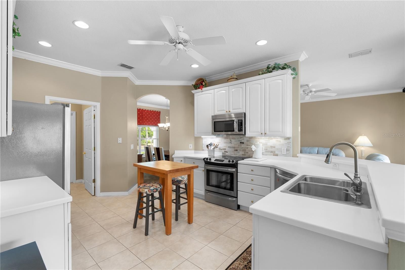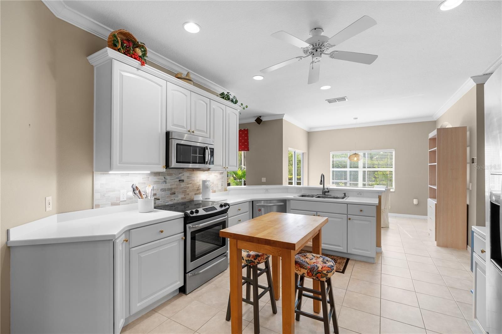 - Ceiling Fan(s), Crown Molding, Eat-in Kitchen, Kitchen/Family Room Combo, Living/Dining Room, Main Level Primary, Solid Surface Counters, Solid-Wood Cabinets, Split Bedrooms, Thermostat, Tray Ceiling(s), Walk-In Closet(s), Window Treatments