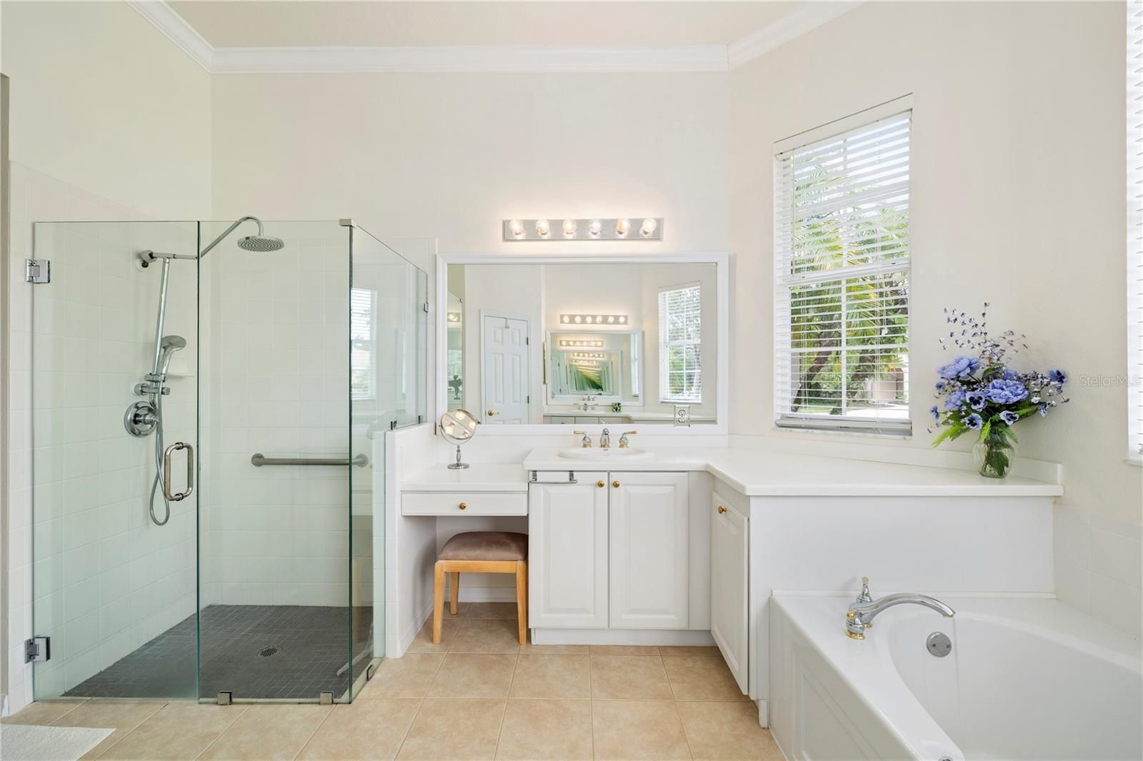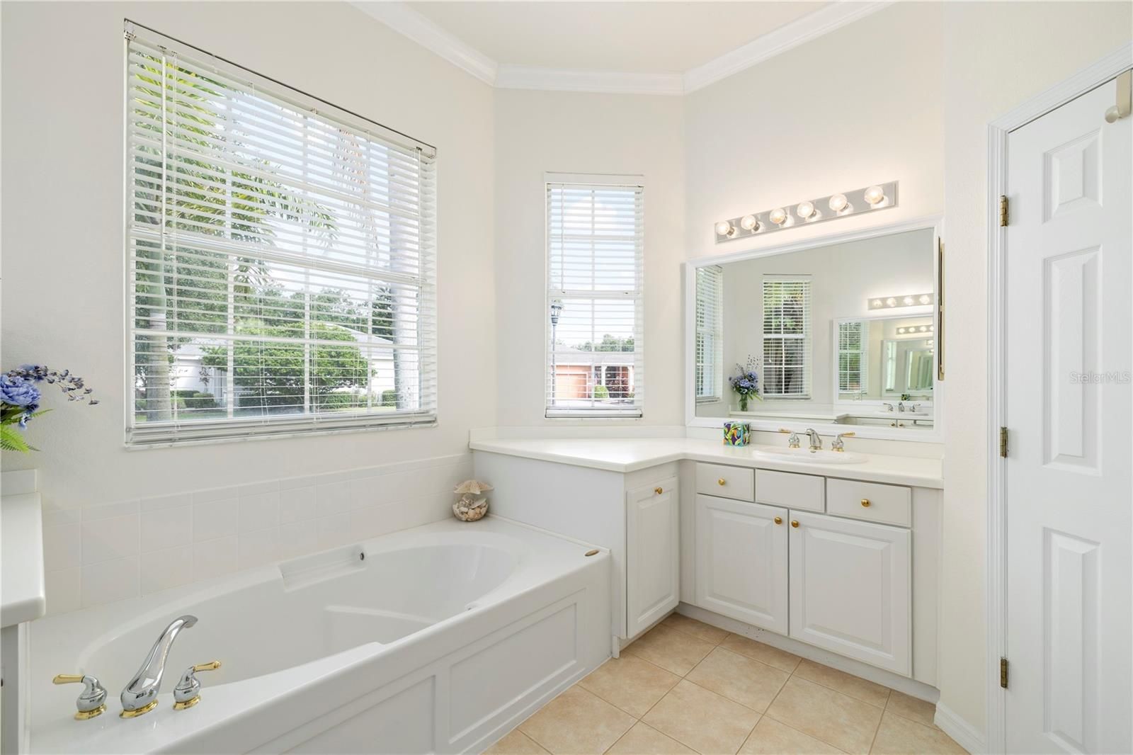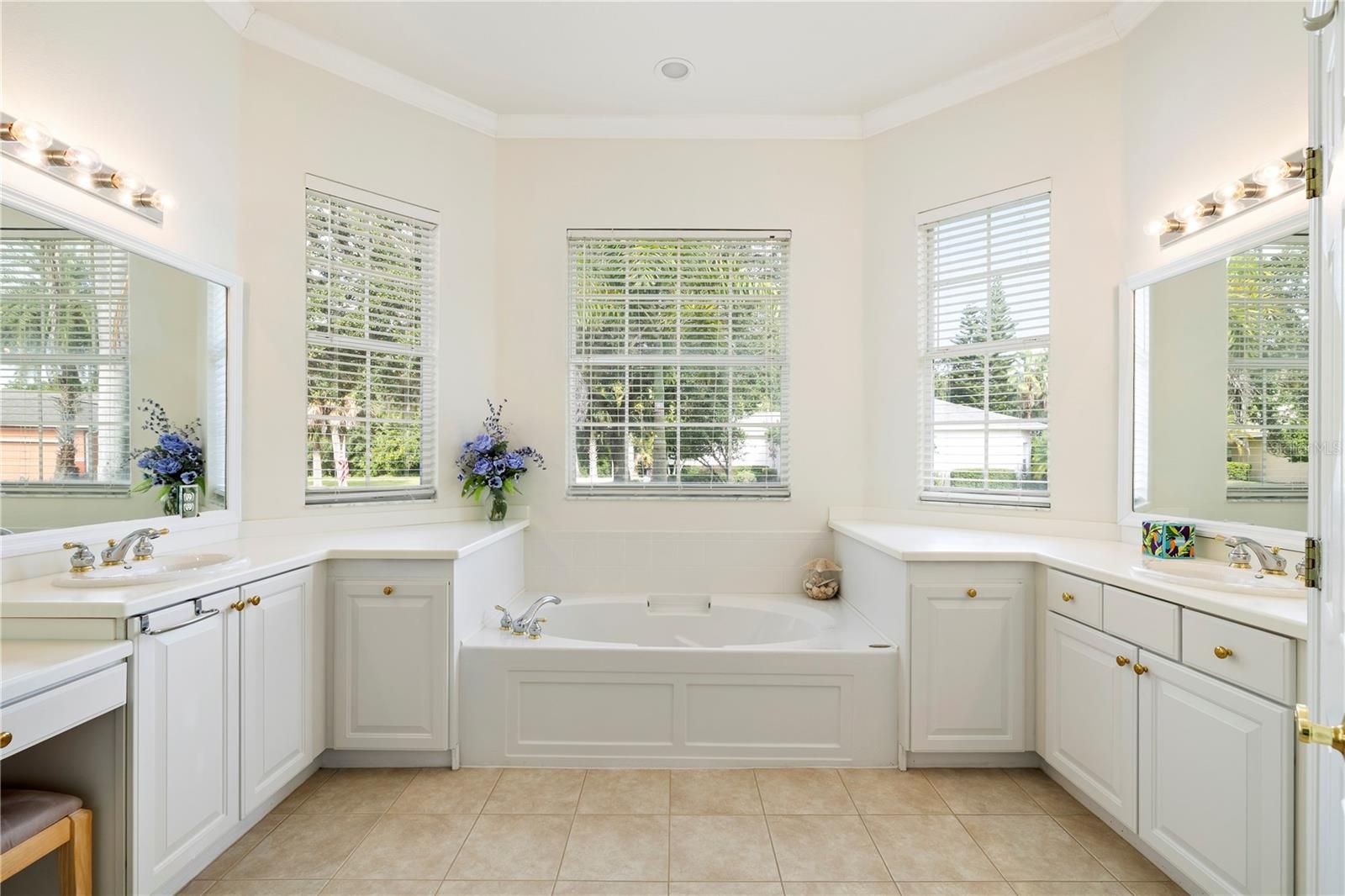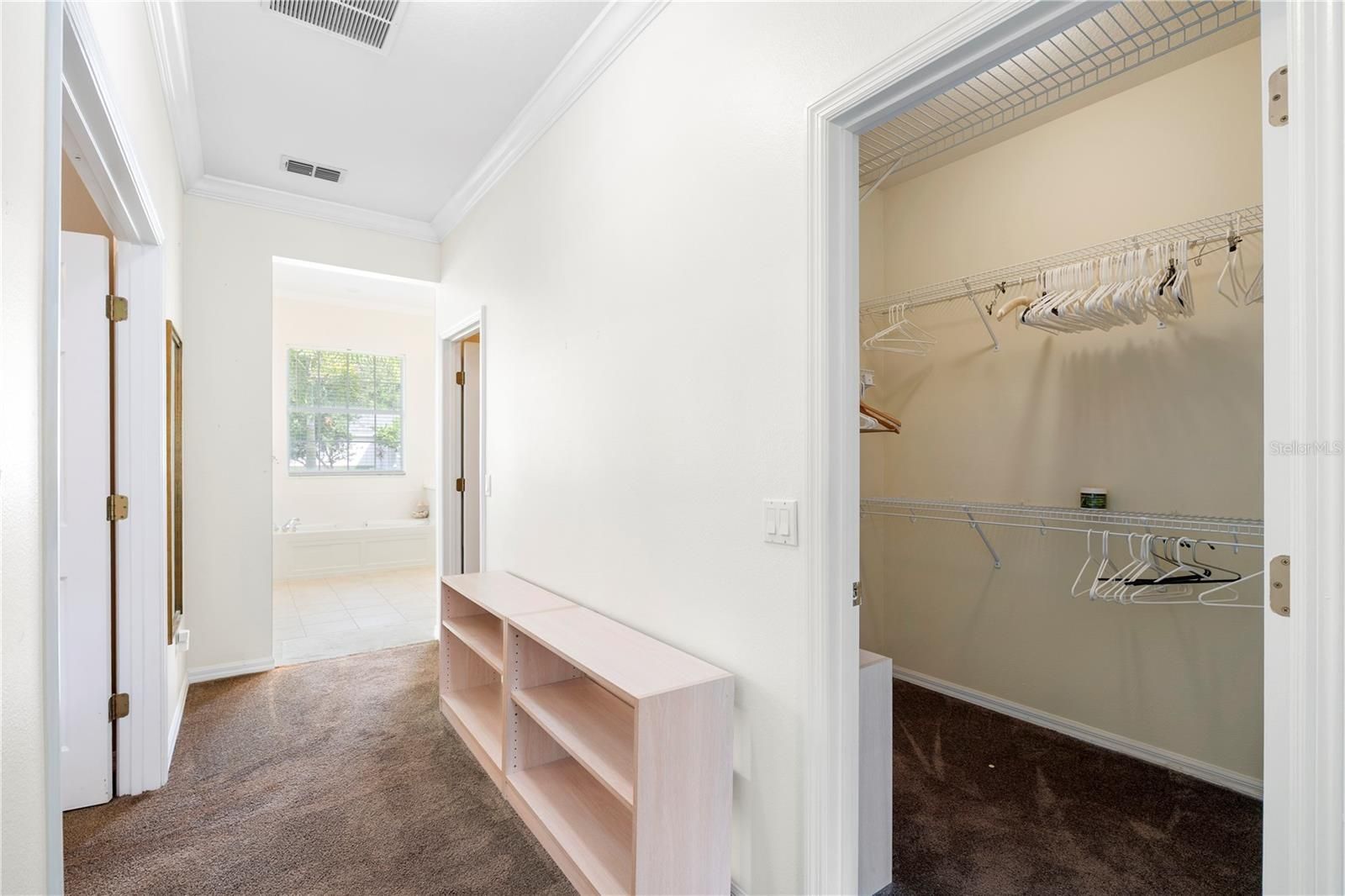 - Ceiling Fan(s), Crown Molding, Eat-in Kitchen, Kitchen/Family Room Combo, Living/Dining Room, Main Level Primary, Solid Surface Counters, Solid-Wood Cabinets, Split Bedrooms, Thermostat, Tray Ceiling(s), Walk-In Closet(s), Window Treatments