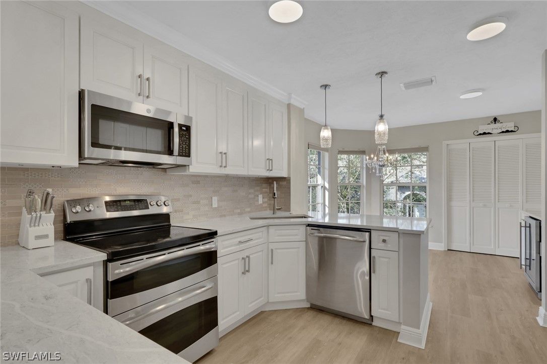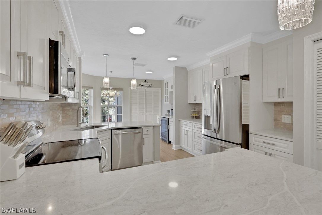 Imagine waking up every morning to the serene beauty of emerald fairways stretching as far as the eye can see. This stunning end unit coach home isn't just a place to live, it's a lifestyle upgrade. Completely renovated and ready for you, it offers a seamless blend of modern updates and timeless comfort. Step inside and you'll be greeted by soaring vaulted ceilings that create a sense of airy openness. With three bedrooms plus a versatile den, there's plenty of room to spread out. The new flooring throughout adds a polished touch, while the renovated kitchen, featuring sleek finishes, and GE profile double oven invites you to whip up everything from morning coffee to gourmet dinners. The bathrooms have been stylishly updated, ensuring every space feels like a retreat. Even the garage has new, epoxy flooring adding a layer of durability and style. The real showstopper is the impact-glass enclosed lanai. Picture yourself relaxing here with a book or entertaining friends, all while taking in breathtaking golf course views. This home is more than move in ready; it's ready to impress. Whether you're a golf enthusiast, or simply crave the tranquility of a picture perfect setting, this property is calling your name. Conveniently situated, this home is just minutes from pristine sugar-sand beaches and the upscale dining and shopping at Waterside Shops, Mercato, and 5th Avenue. Don't wait to make it yours. Schedule your tour today! Vineyards Country Club offers residents optional membership to world-class amenities, including two championship golf courses, 12 Har-Tru tennis courts, 8 pickleball courts, a saltwater lap pool, and a premier wellness center with a halotherapy salt room. To top off the fun, residents love to lounge at the resort style pool with a pool side bar enjoying live music.