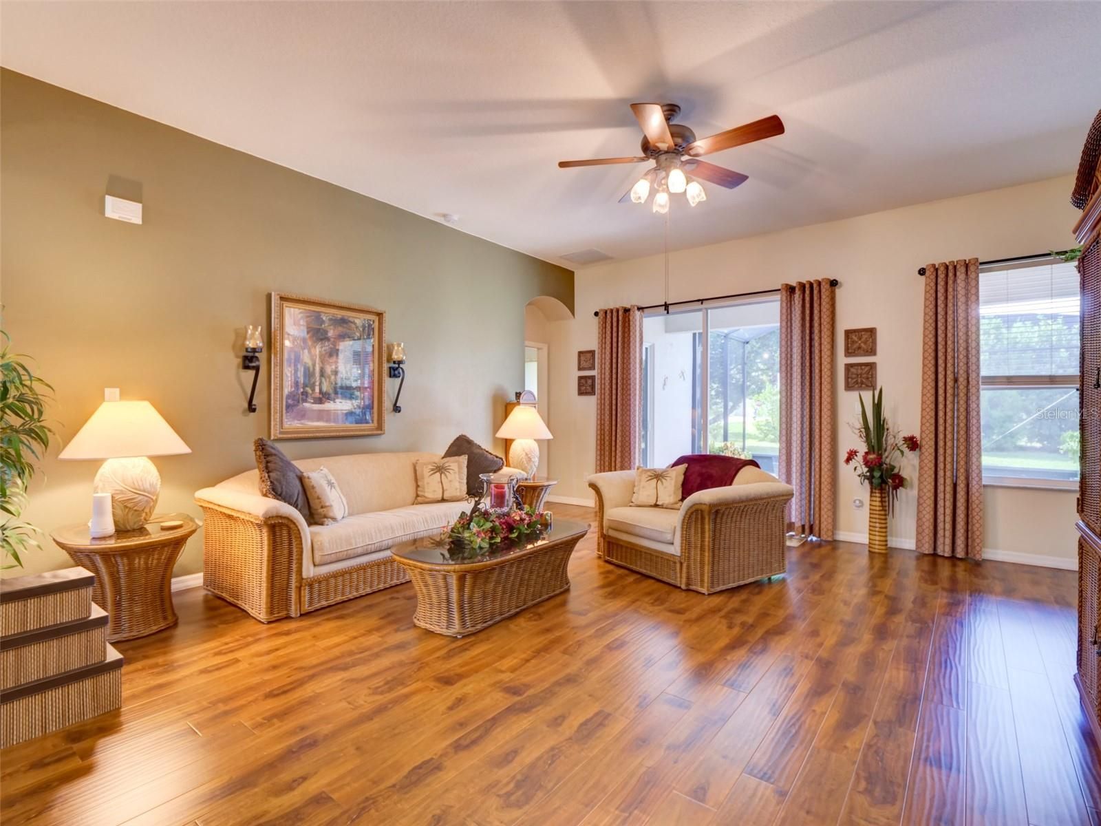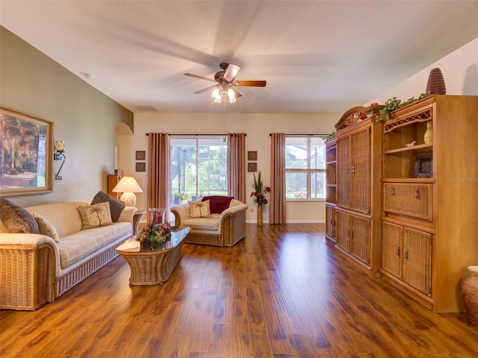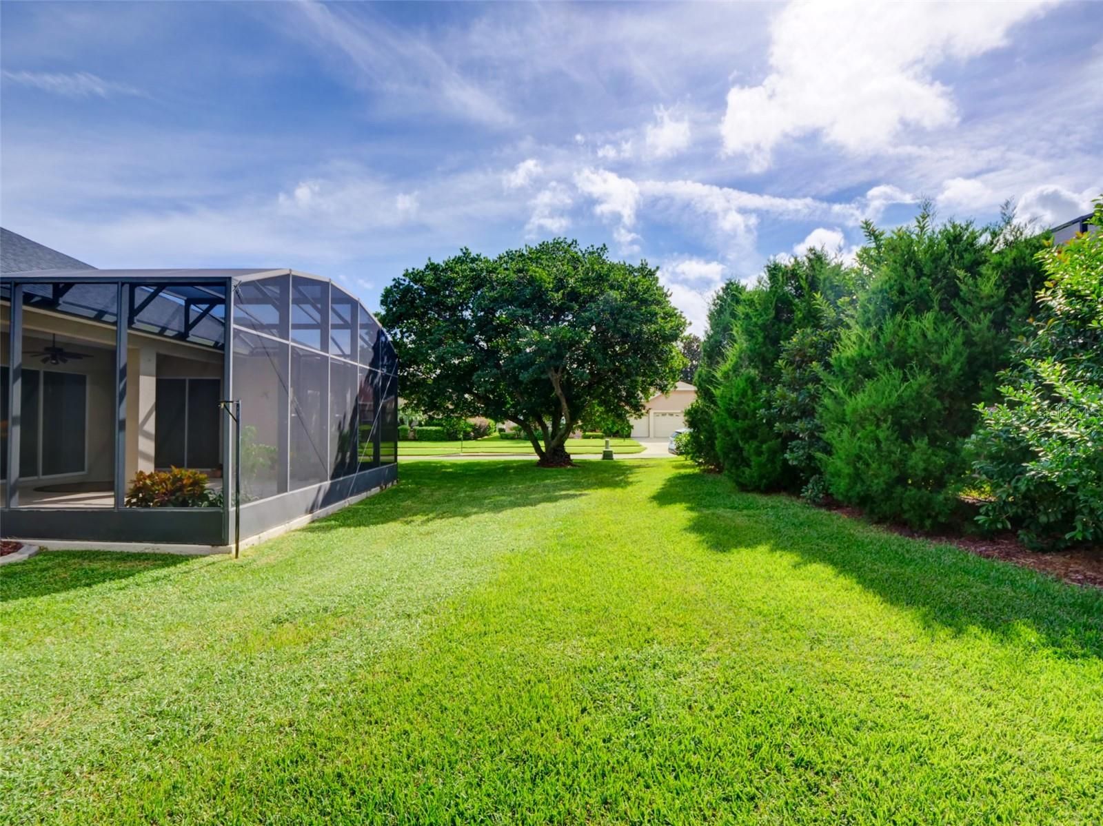 A MUST SEE: ROOF 2022. HVAC 2025. This 2,489 sqft, well-maintained 2 Bedroom, 2 Bath, split-floor plan home, has a large Flex Room (24'x14'), which is adaptable to a homeowner's needs. On a corner lot, the mature landscaping, paver driveway and walkway (2024), lends to an appealing first impression, along with the oversized Garage (25'x22'), and attached Golf Cart Garage (8'x10'). As you enter through the screened-in alcove, and through the front leaded-glass door, you’ll immediately appreciate the comfortable environment created by tall ceilings and the abundance of natural light provided by the glass sliding doors and windows in the Living Room and Formal Dining Room. This expansive floorplan features a truly-open Kitchen, deep double-door Pantry & breakfast bar seating. Uniquely, the Kitchen oversees an (18'x15') room which can adapt to be a larger Dining Room or Family Room for entertainment. Sliding glass doors allow for access to the standout feature of this home, an expansive covered and screened Lanai (21’x24'), while the tall mature rear landscaping offers much PRIVACY. Glass sliding doors also allow Lanai access from the Primary Bedroom and Kitchen areas. The large Primary Bedroom has two walk-in closets & an over-sized Ensuite Bathroom. The presence of sidewalks adds to the ease of navigating the neighborhood. The Plantation at Leesburg is a private, access controlled, 55+ community that enjoys a low monthly HOA fee, two 18-hole golf courses, practice range, pro-shop, restaurant, pickleball courts, 3 pools, 3 club houses, fitness facilities, fishing pier, secure RV & boat storage, and many more amenities. Close to shopping, medical facilities and main roads. Equal Opportunity Housing. GO AND SHOW.